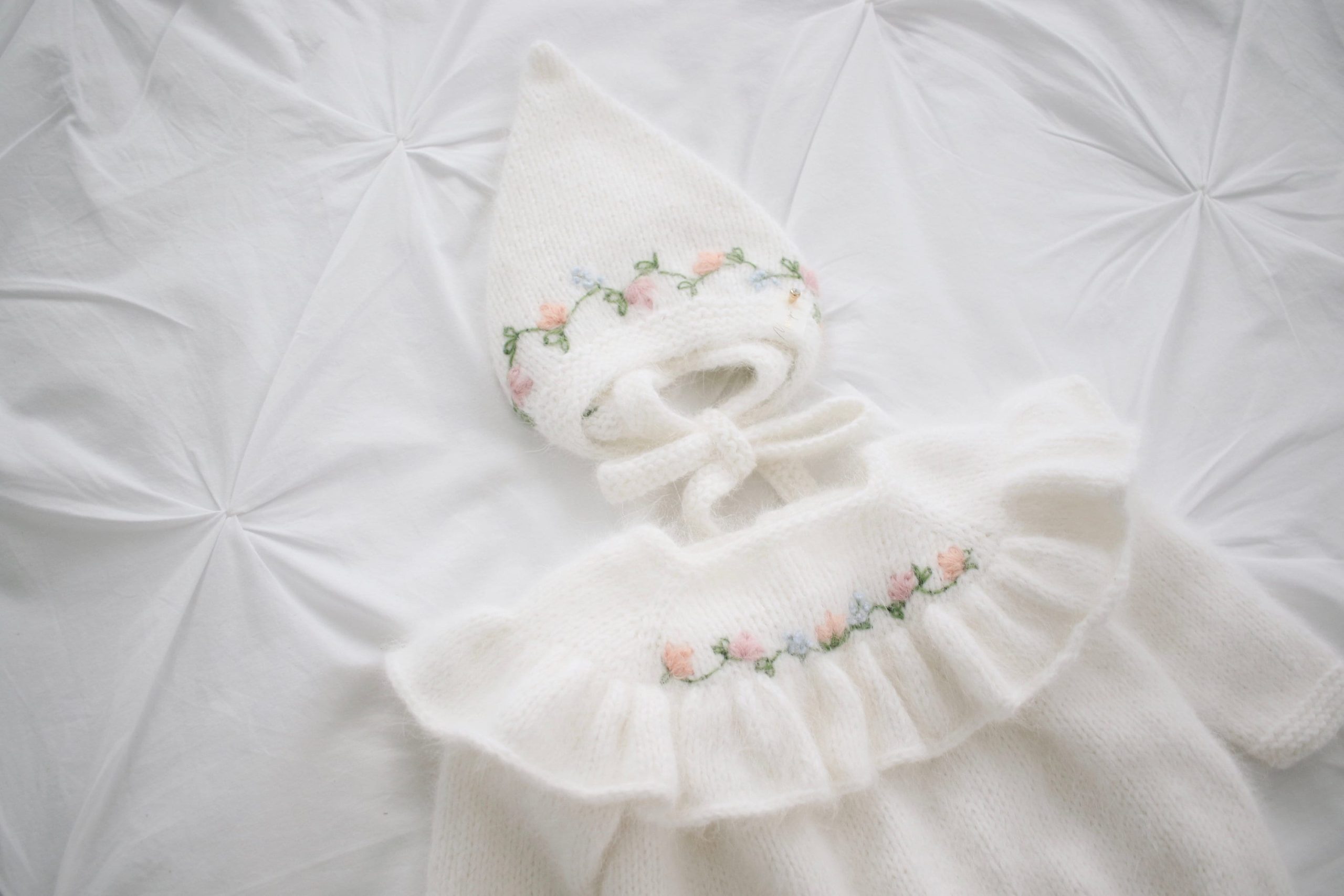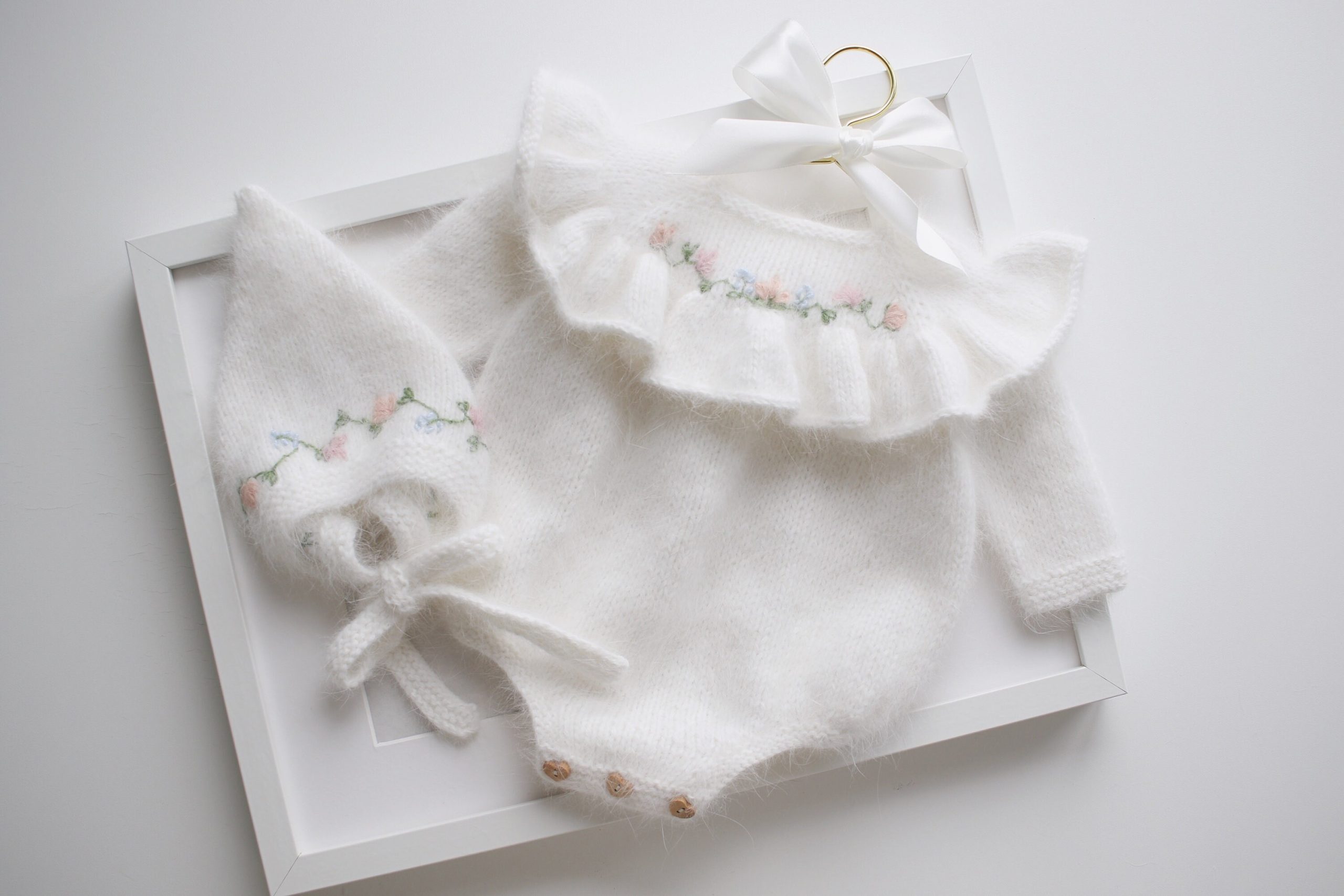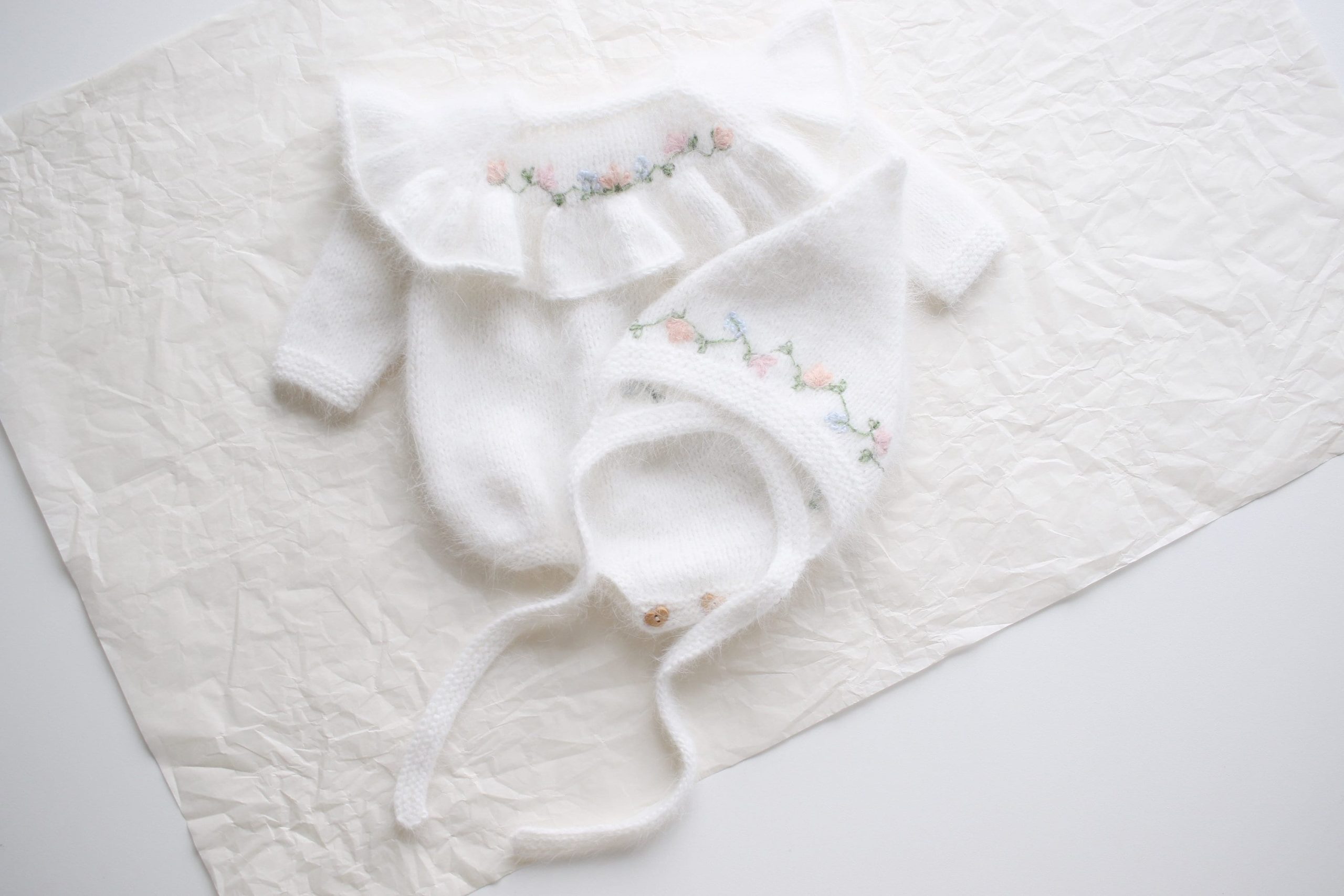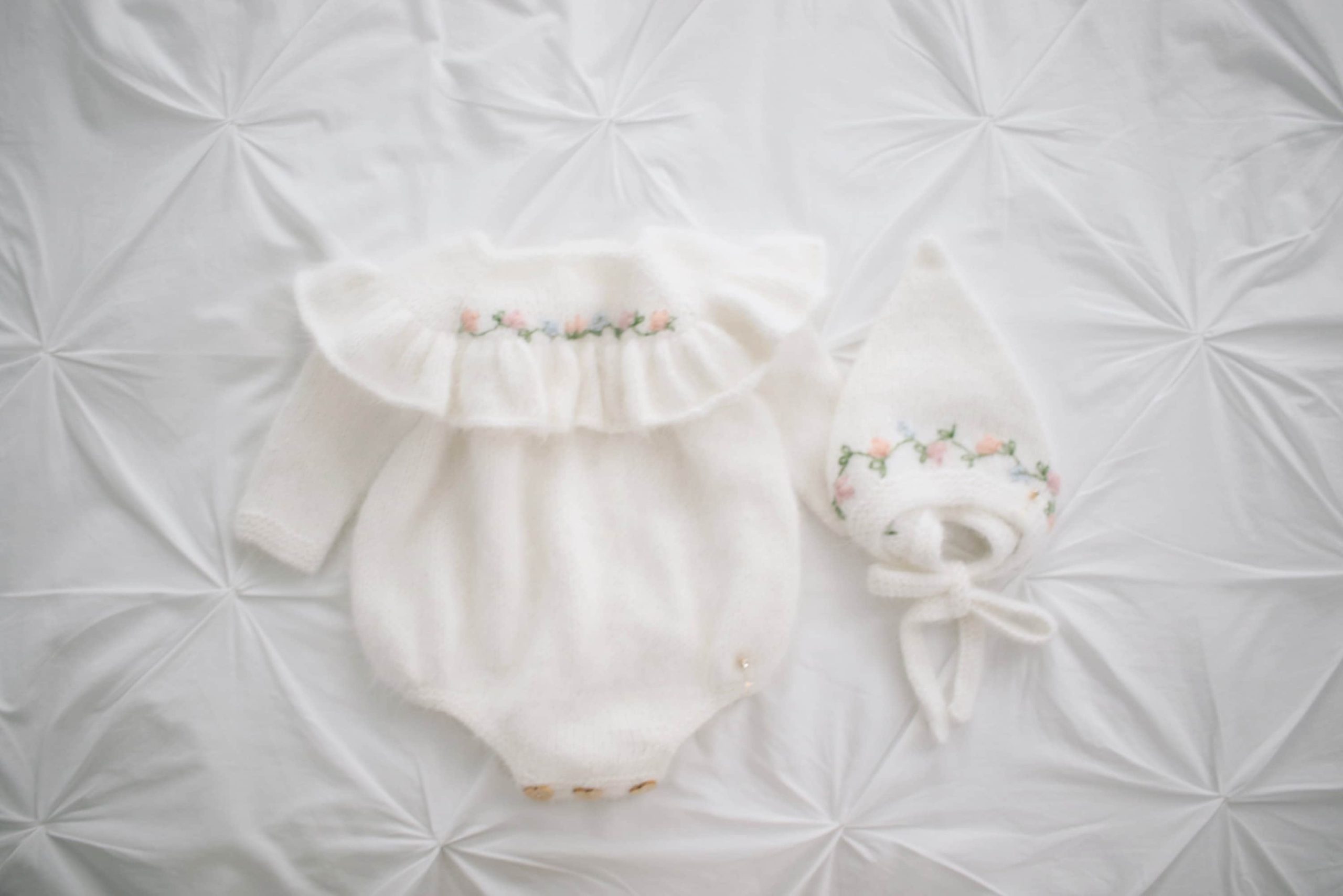 Embroidered Merino Baby Romper Set – Bonnet and Booties, Newborn Photo Prop