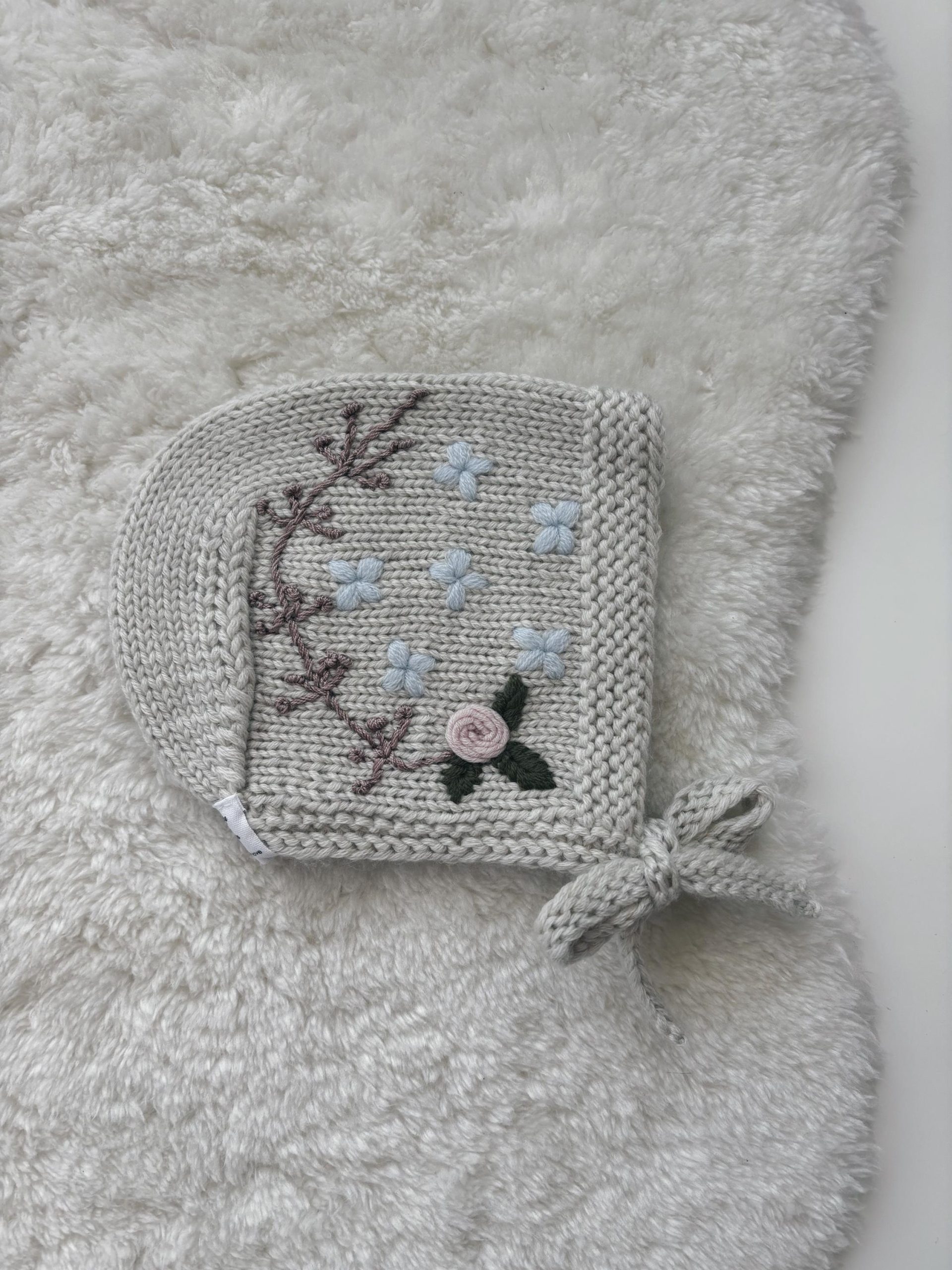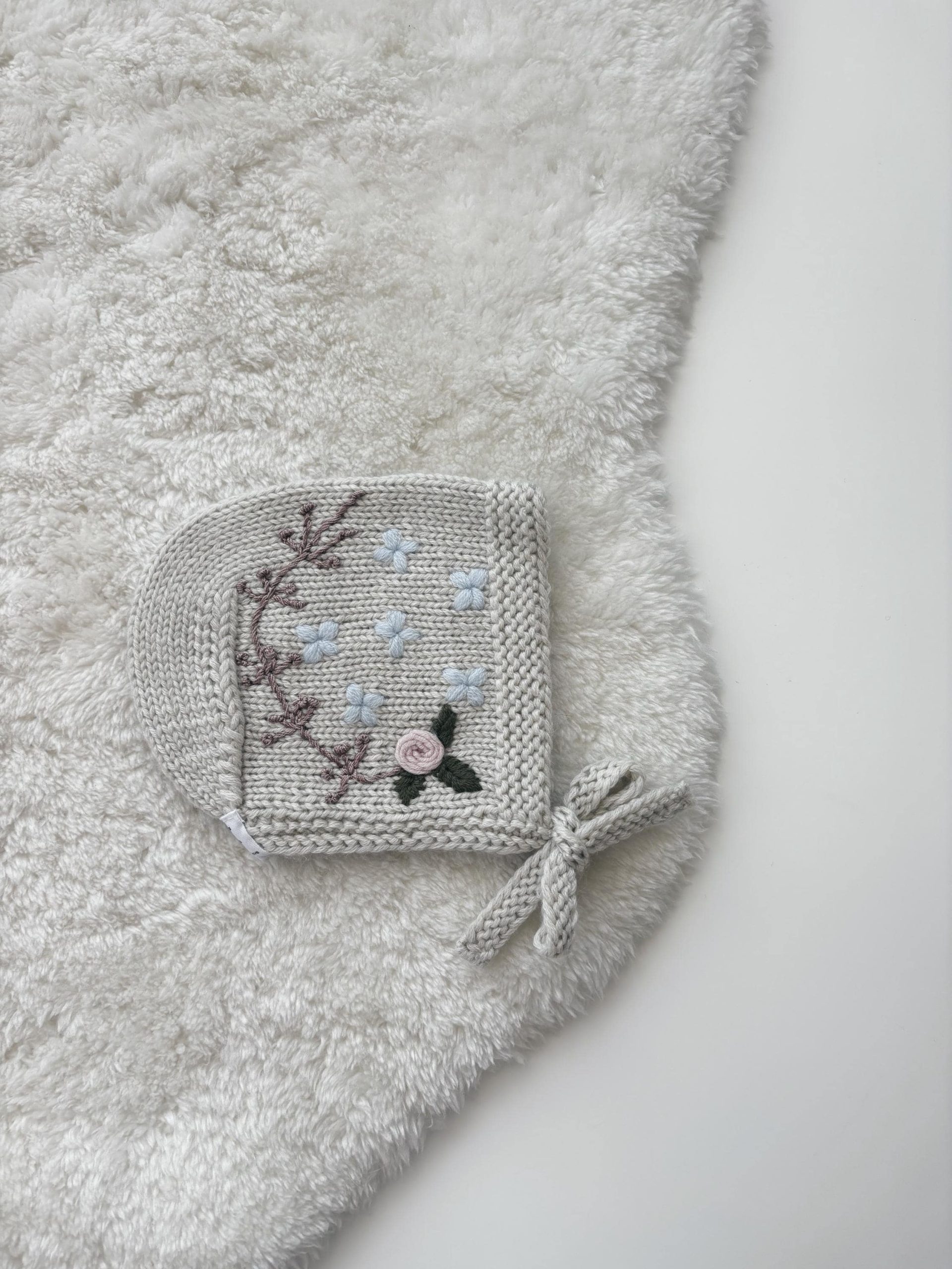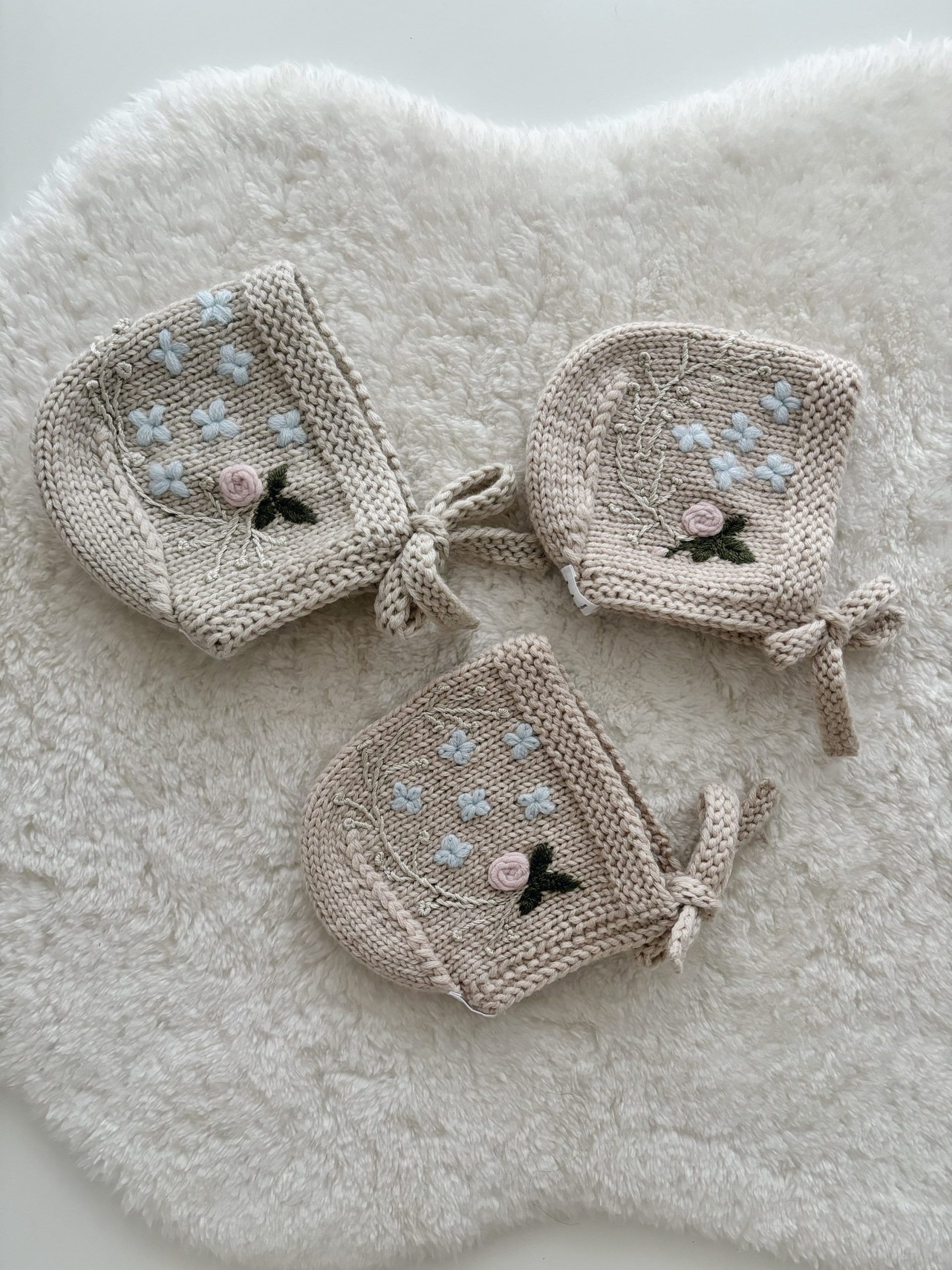 Embroidered Baby Bonnet – Hand Knit Merino Wool, Beige, 0-3 Months