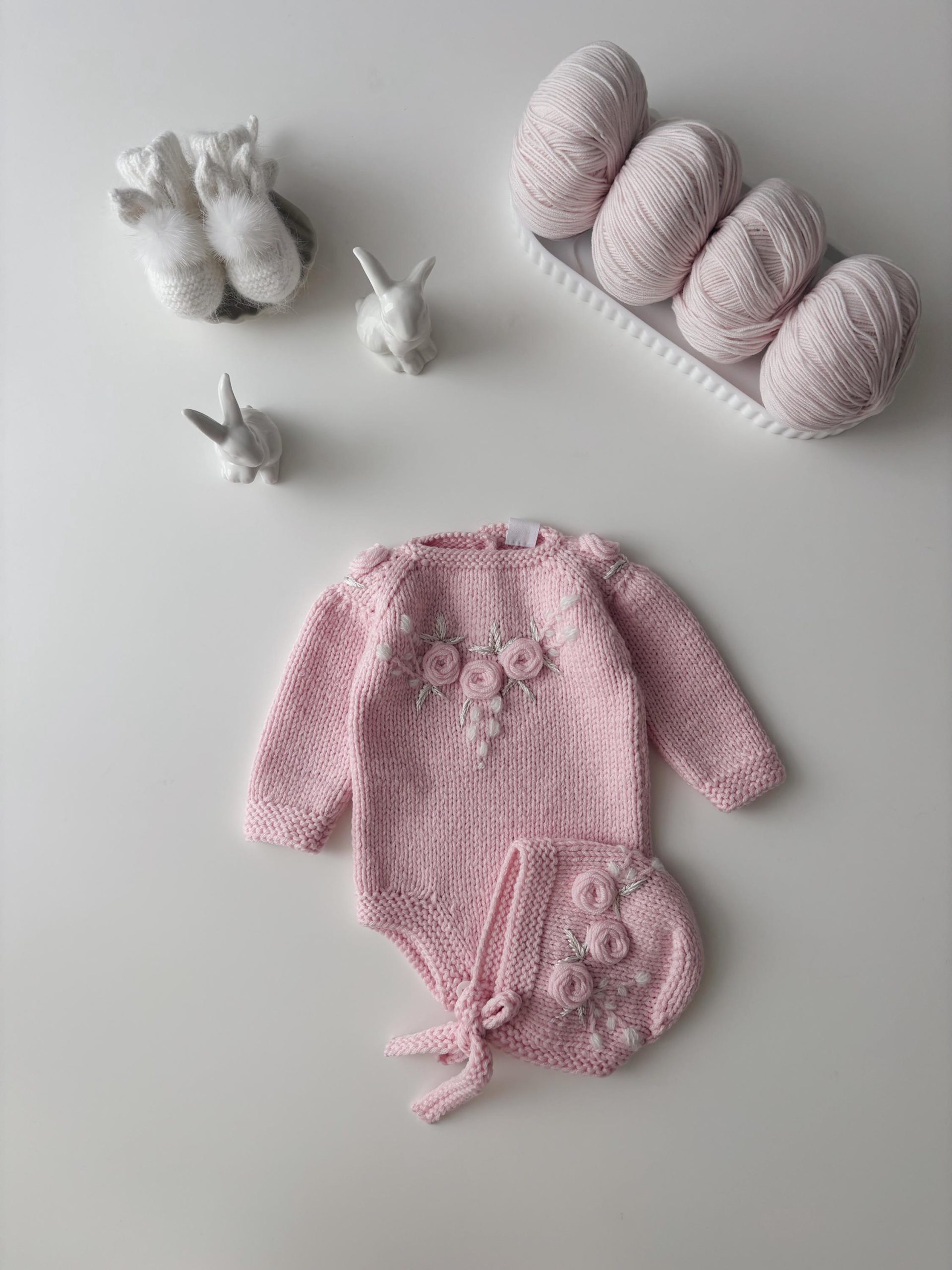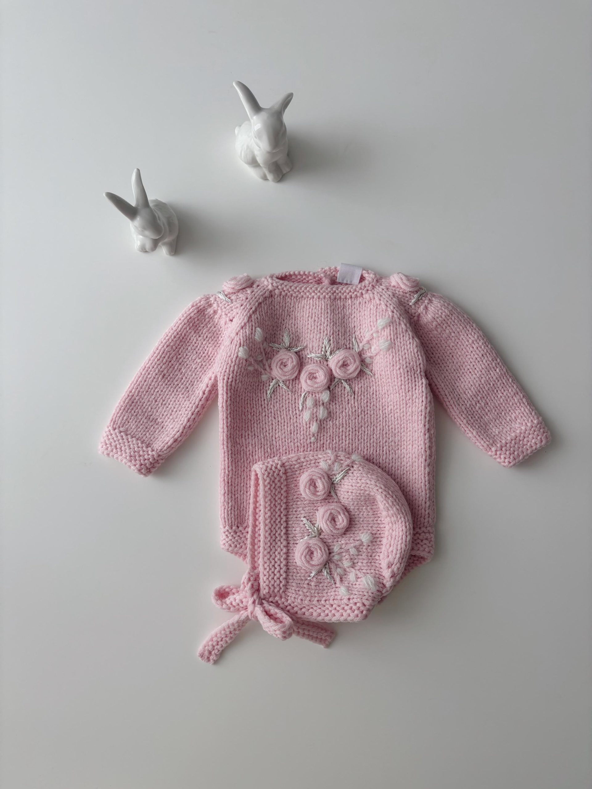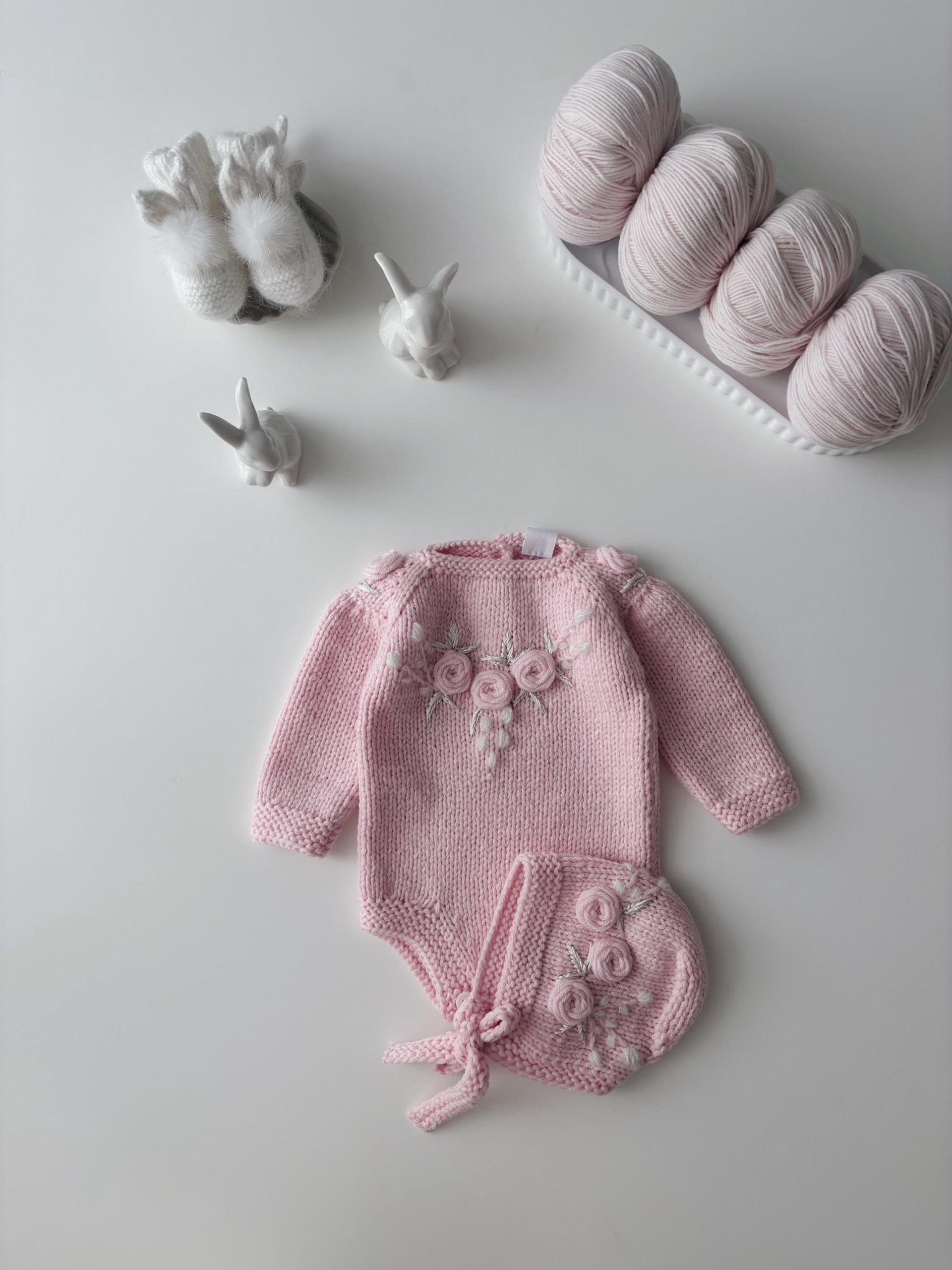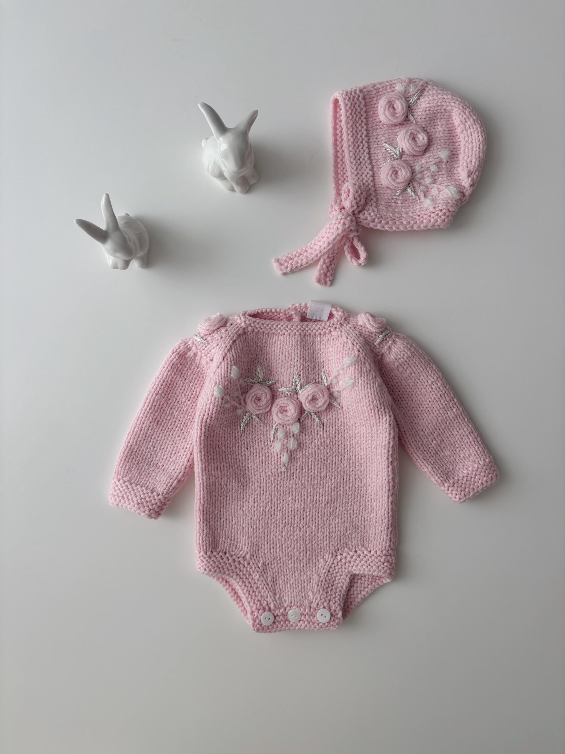 Embroidered Merino Baby Romper and Bonnet Set – Knitted Photo Prop