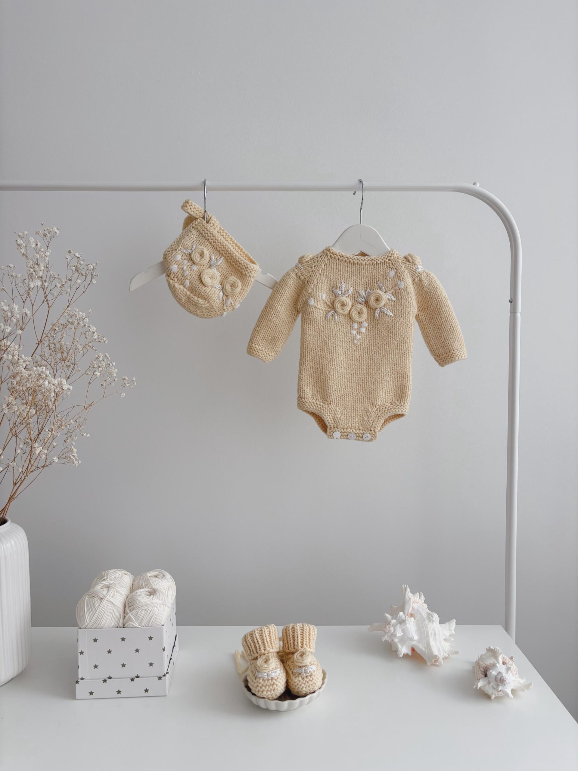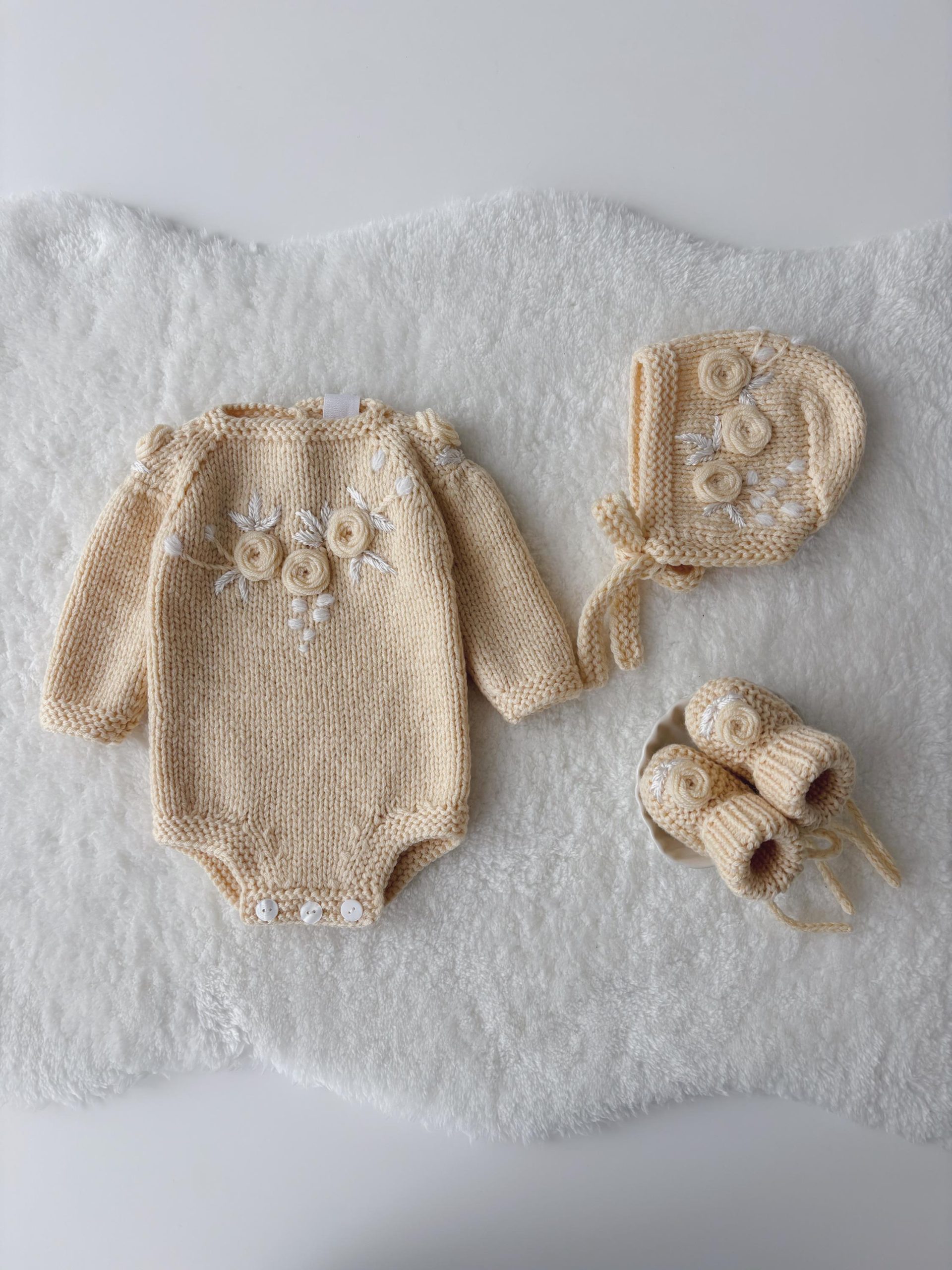 Embroidered Merino Baby Romper Set – Bonnet and Booties, Newborn Photo Prop