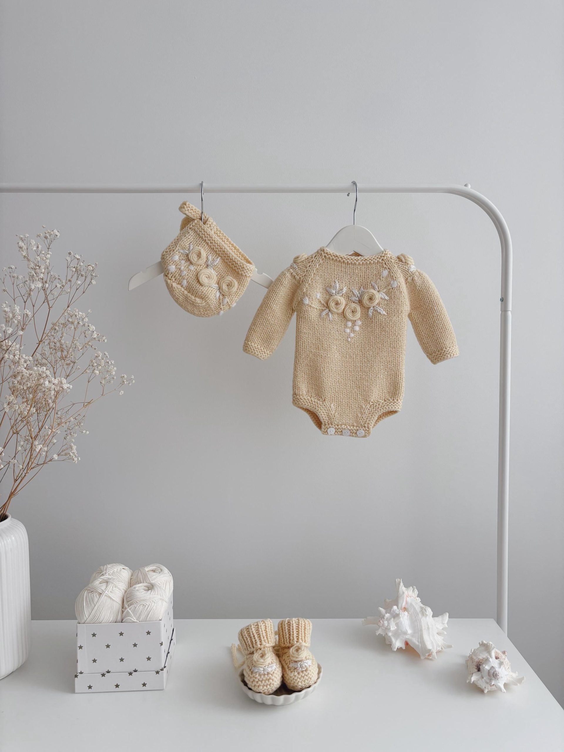 Merino Knit Baby Angel Outfit – Romper, Bonnet & Booties