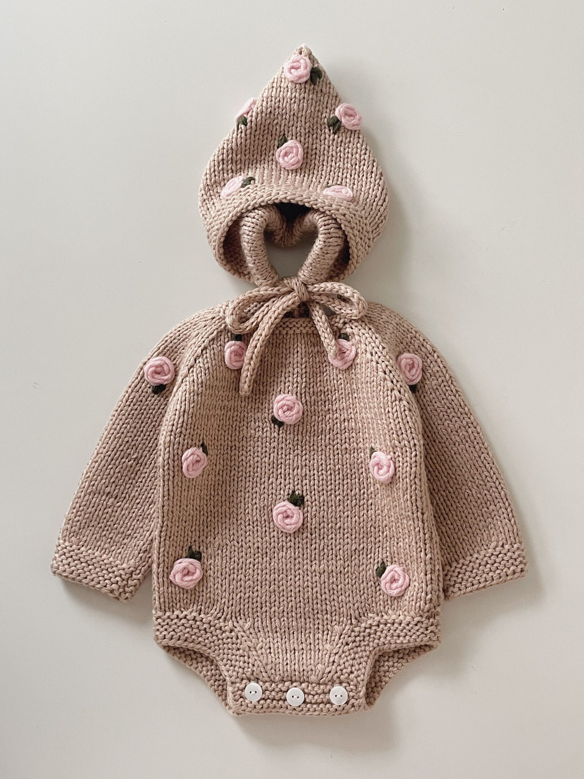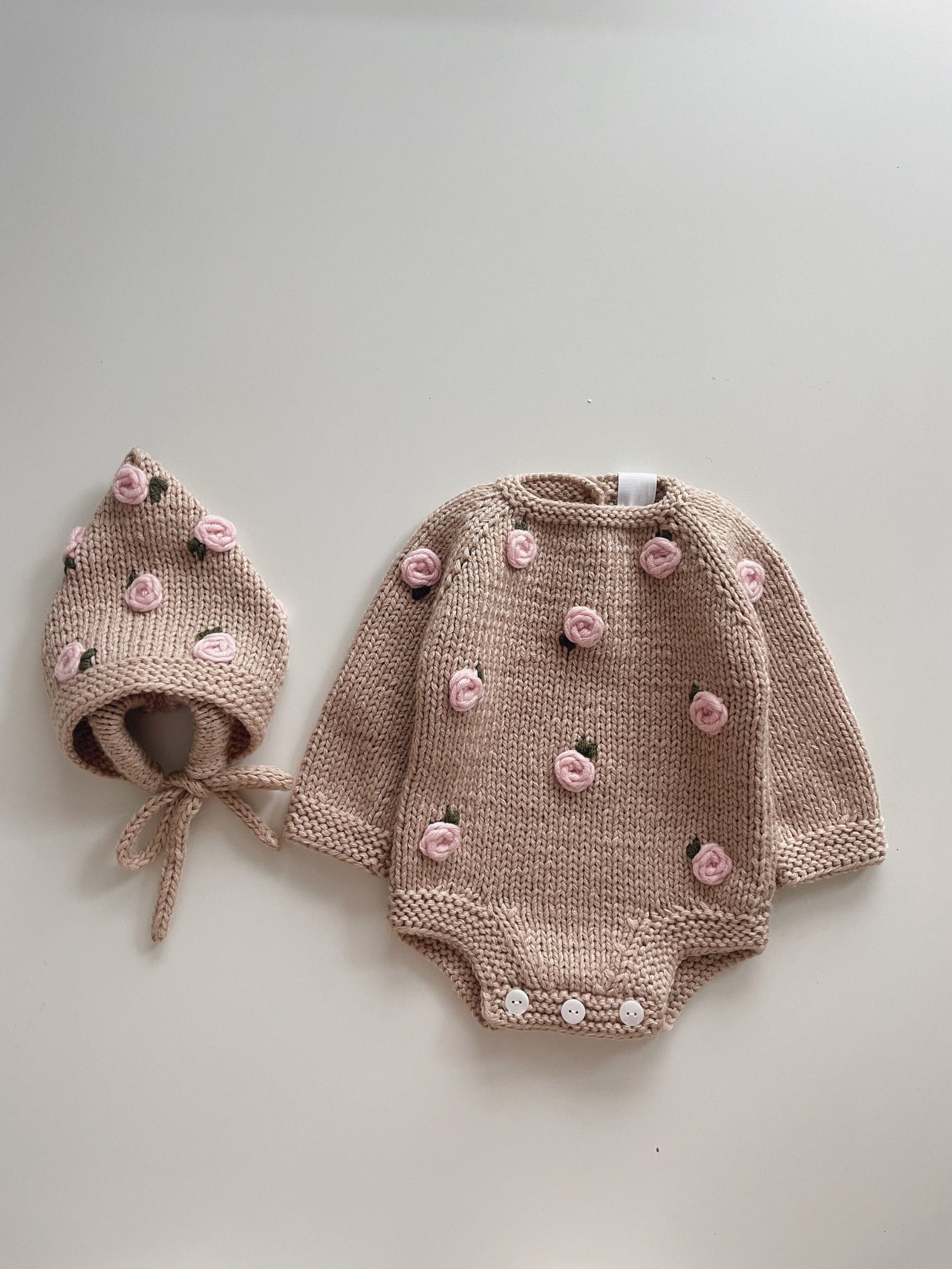 Embroidered Rose Merino Wool Baby Romper and Bonnet Set