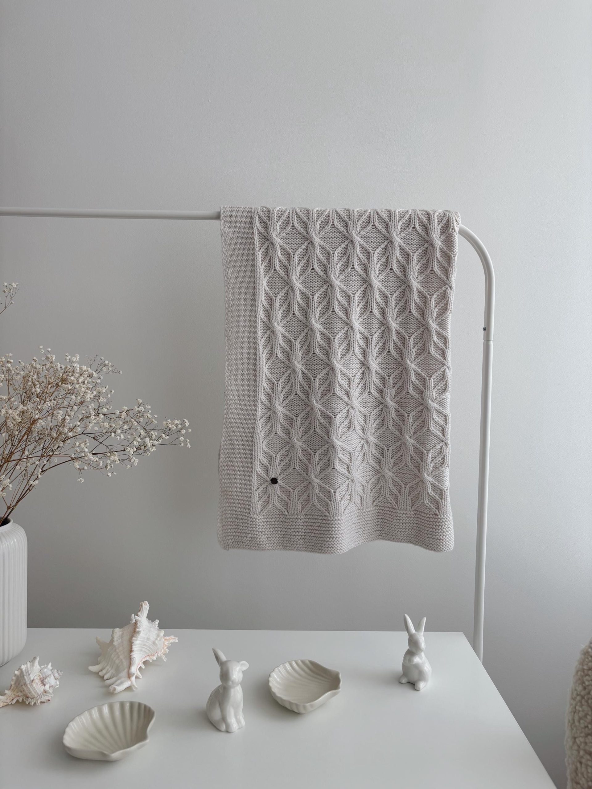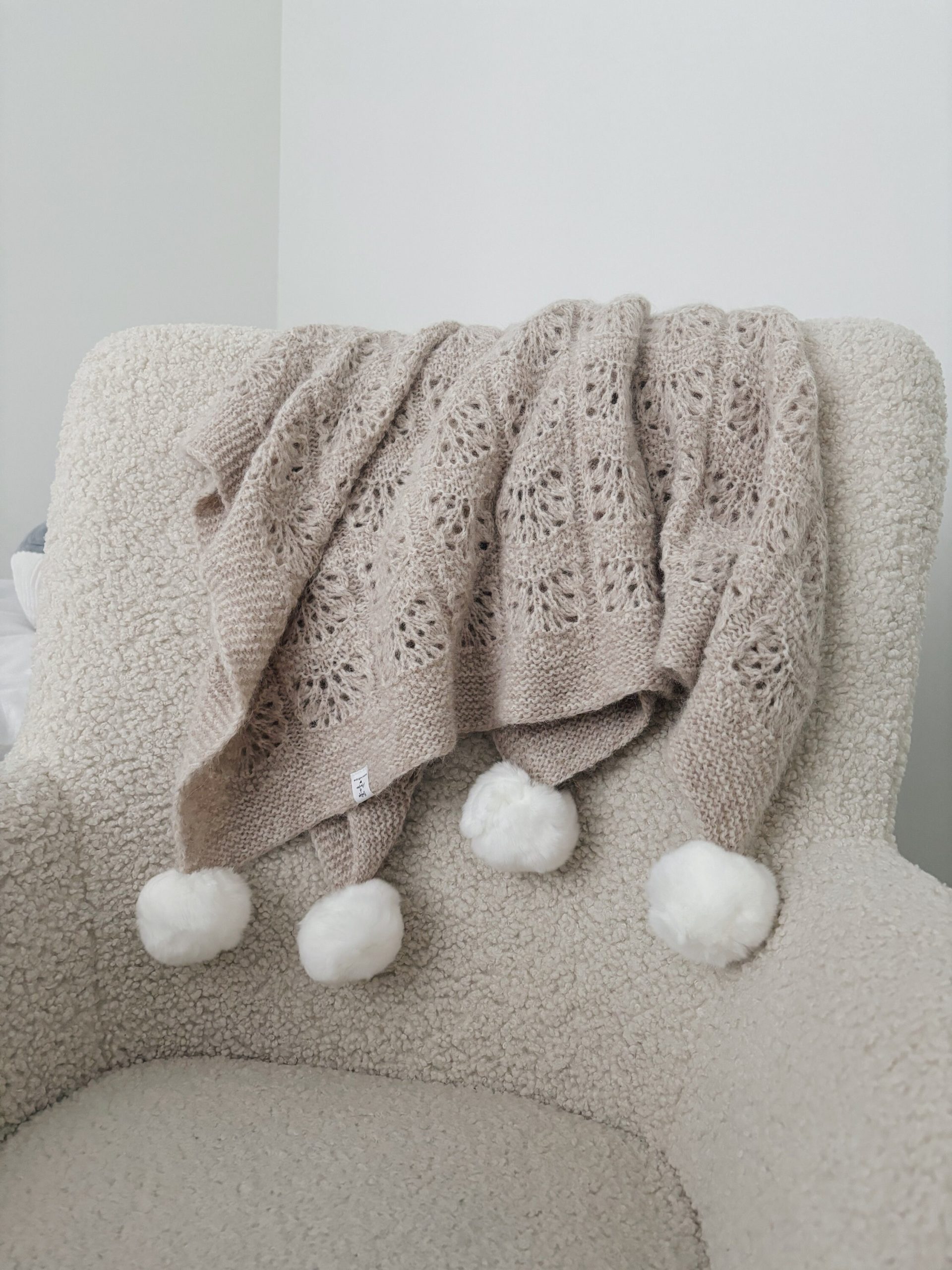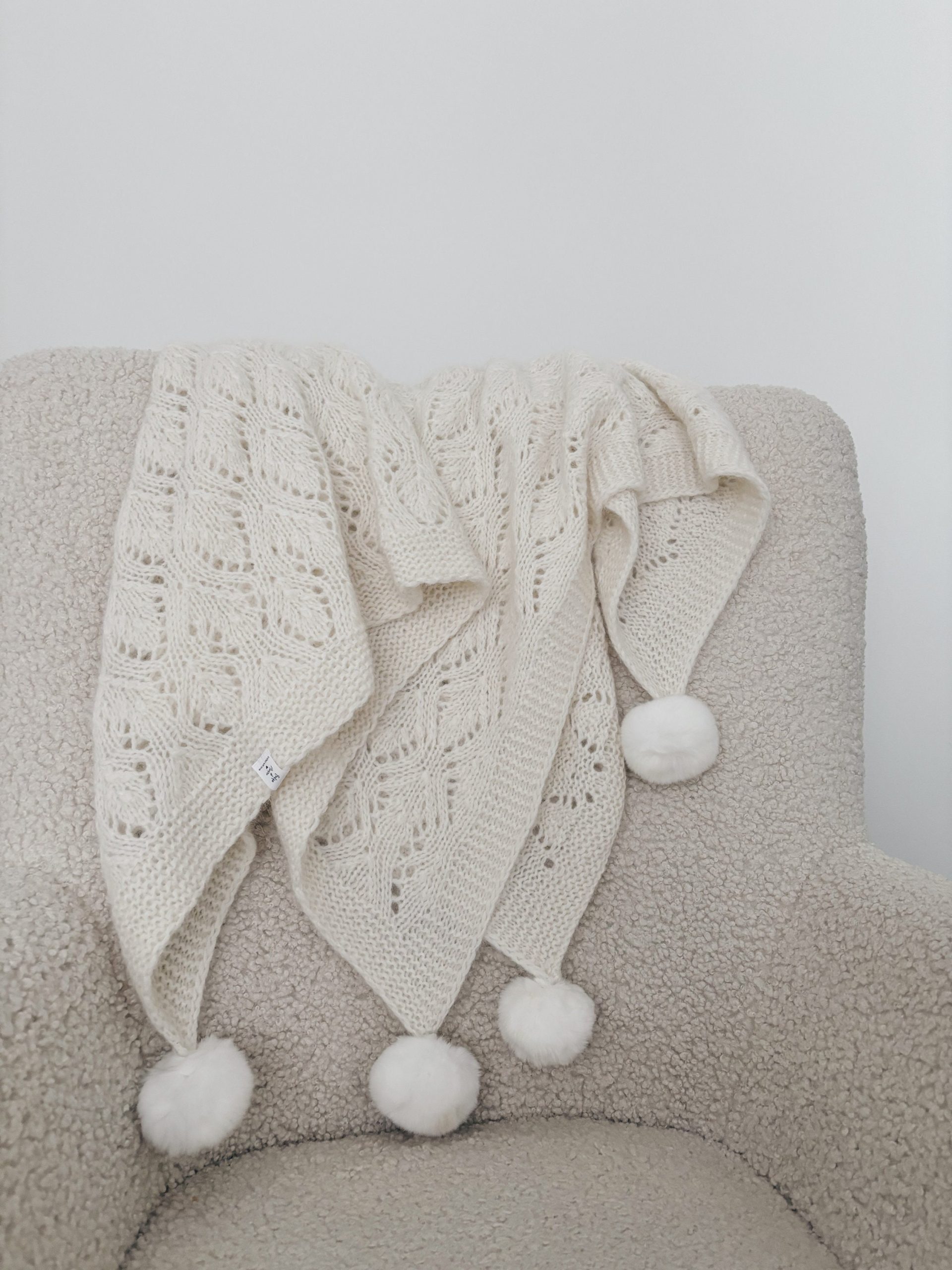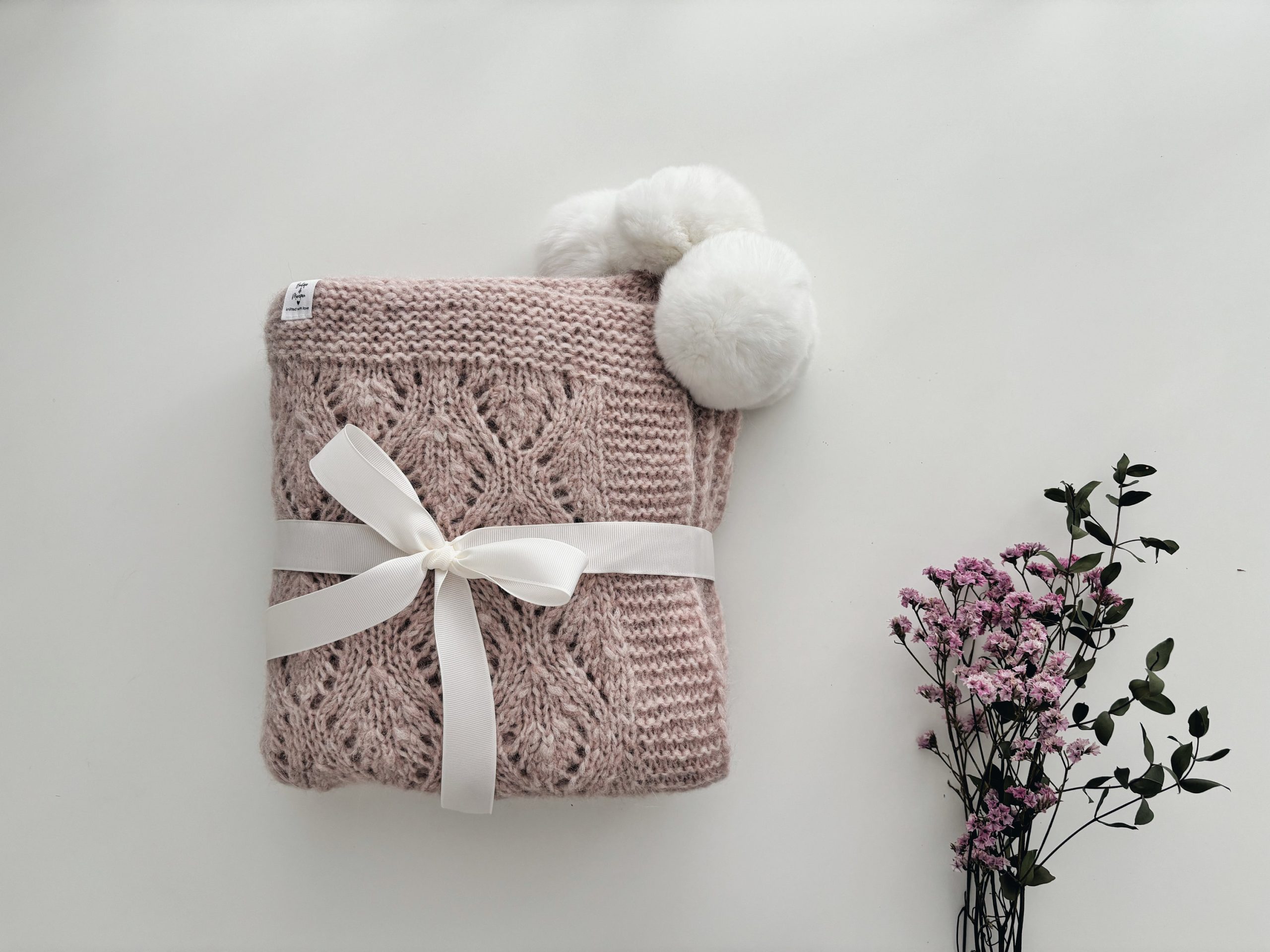 Hand Knit Alpaca Baby Blanket – Pink Marble, Genuine Fur Pom Poms