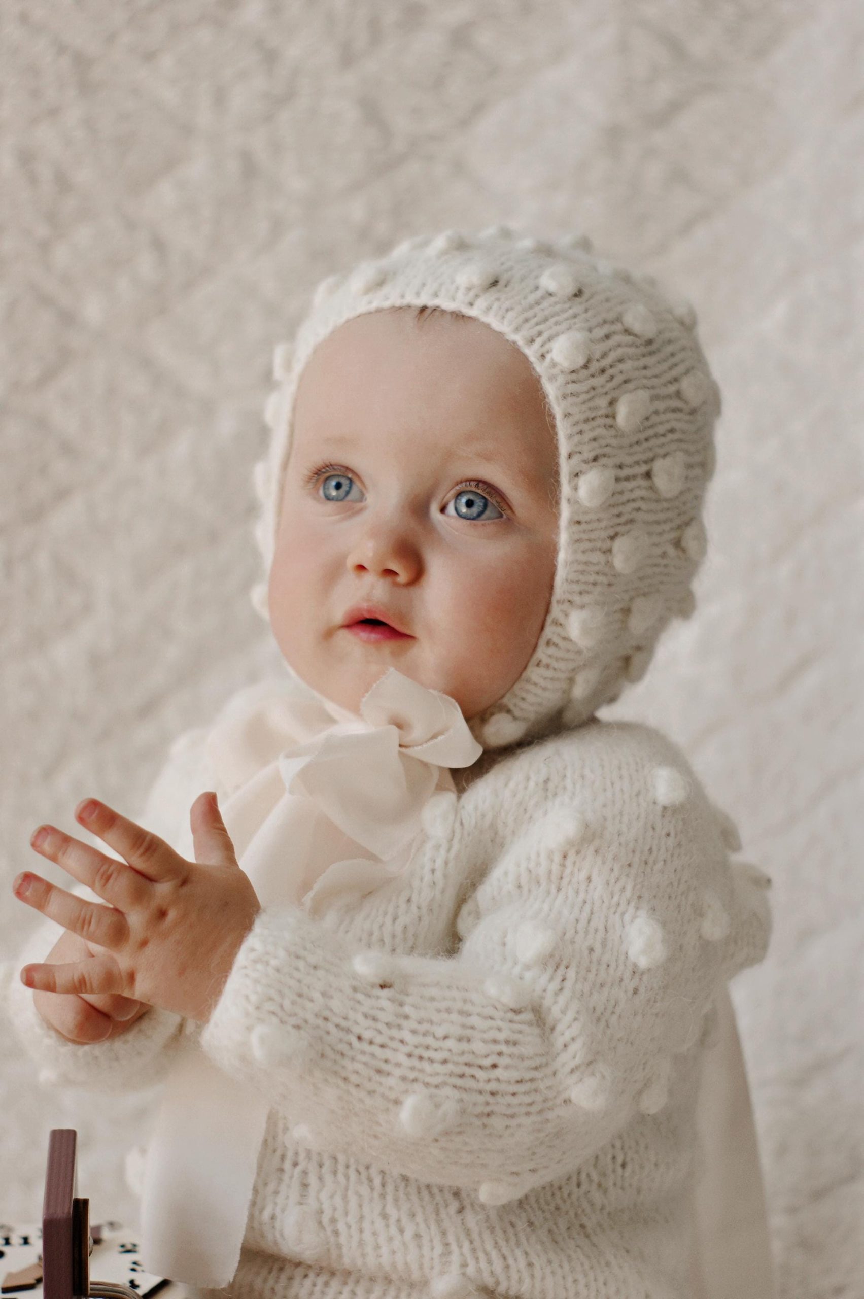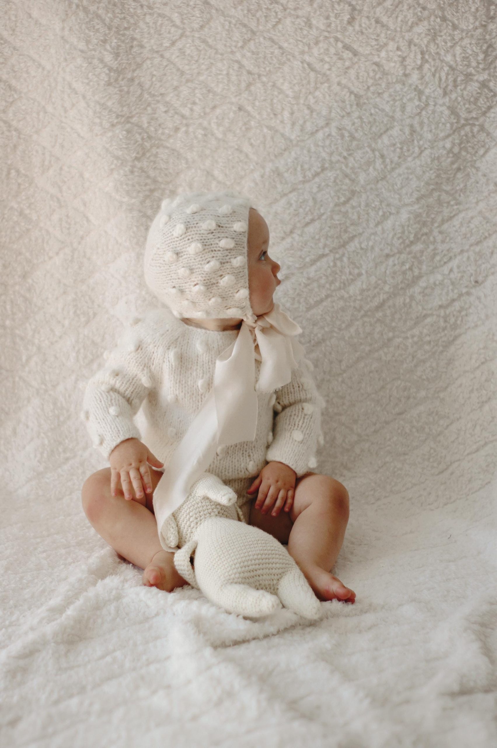 Hand Knitted Baby Alpaca Romper and Bonnet Set – Cream Popcorn Knit