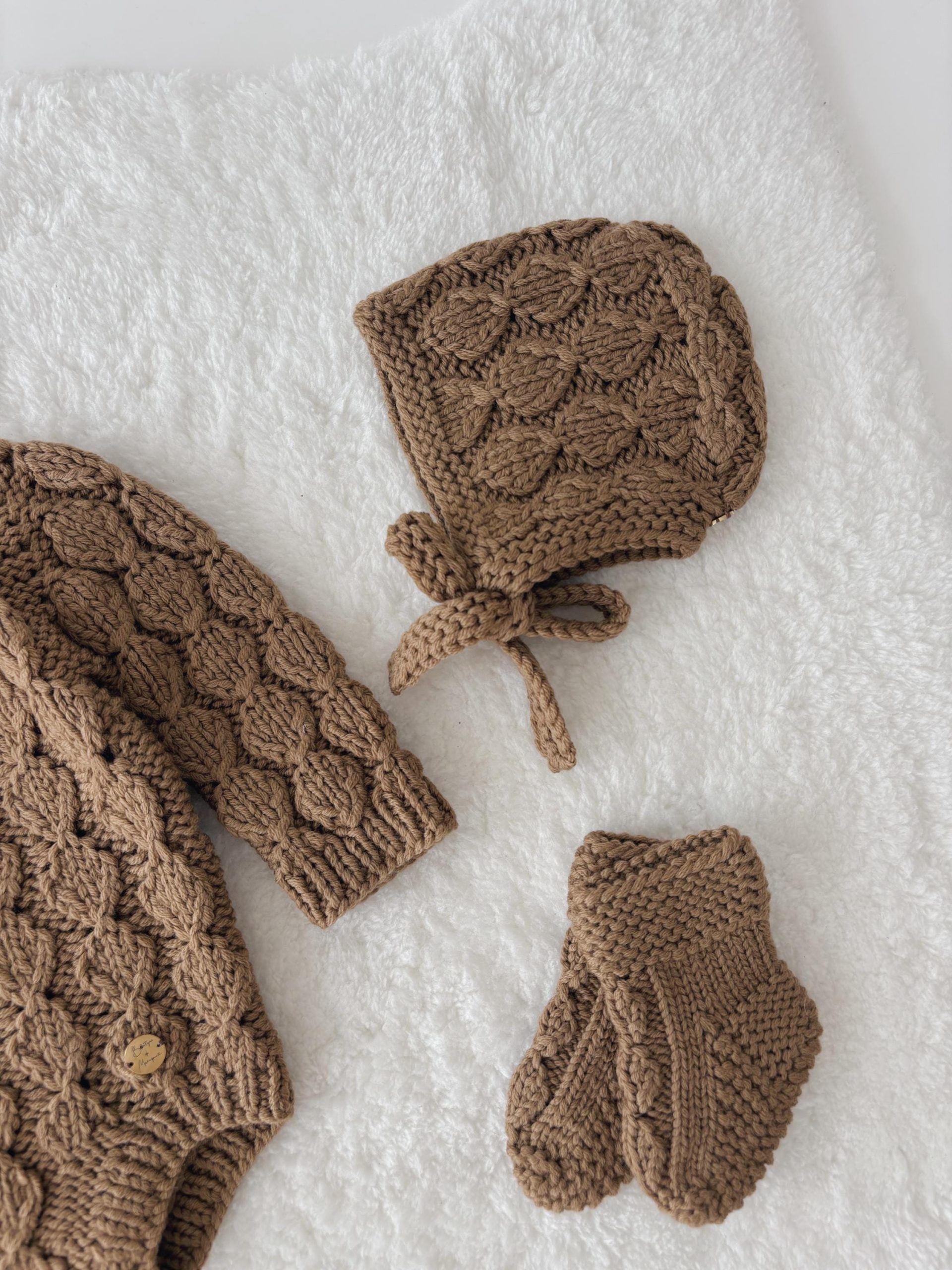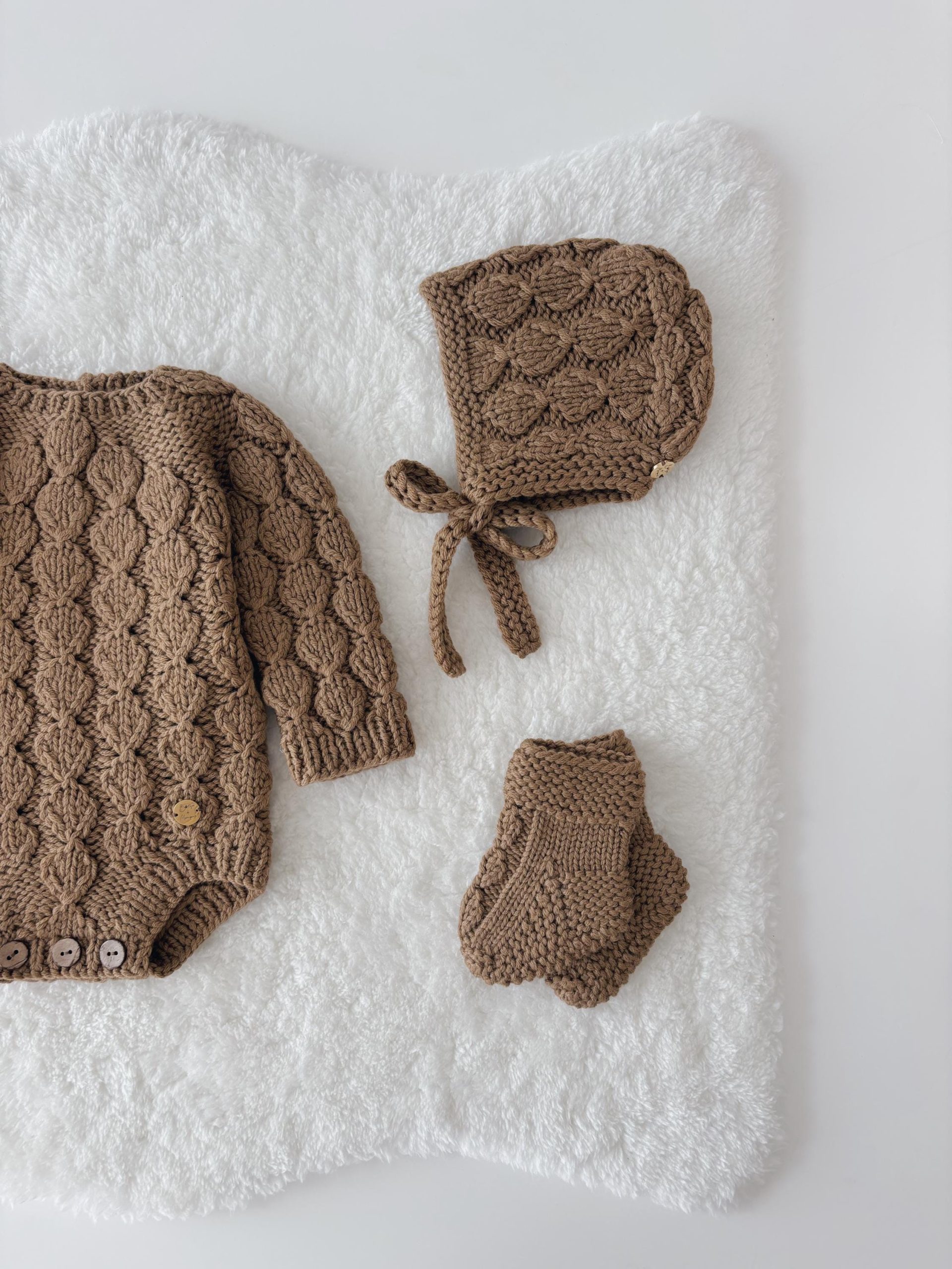 Hand Knitted Brown Merino Baby Romper Set – Bonnet & Socks