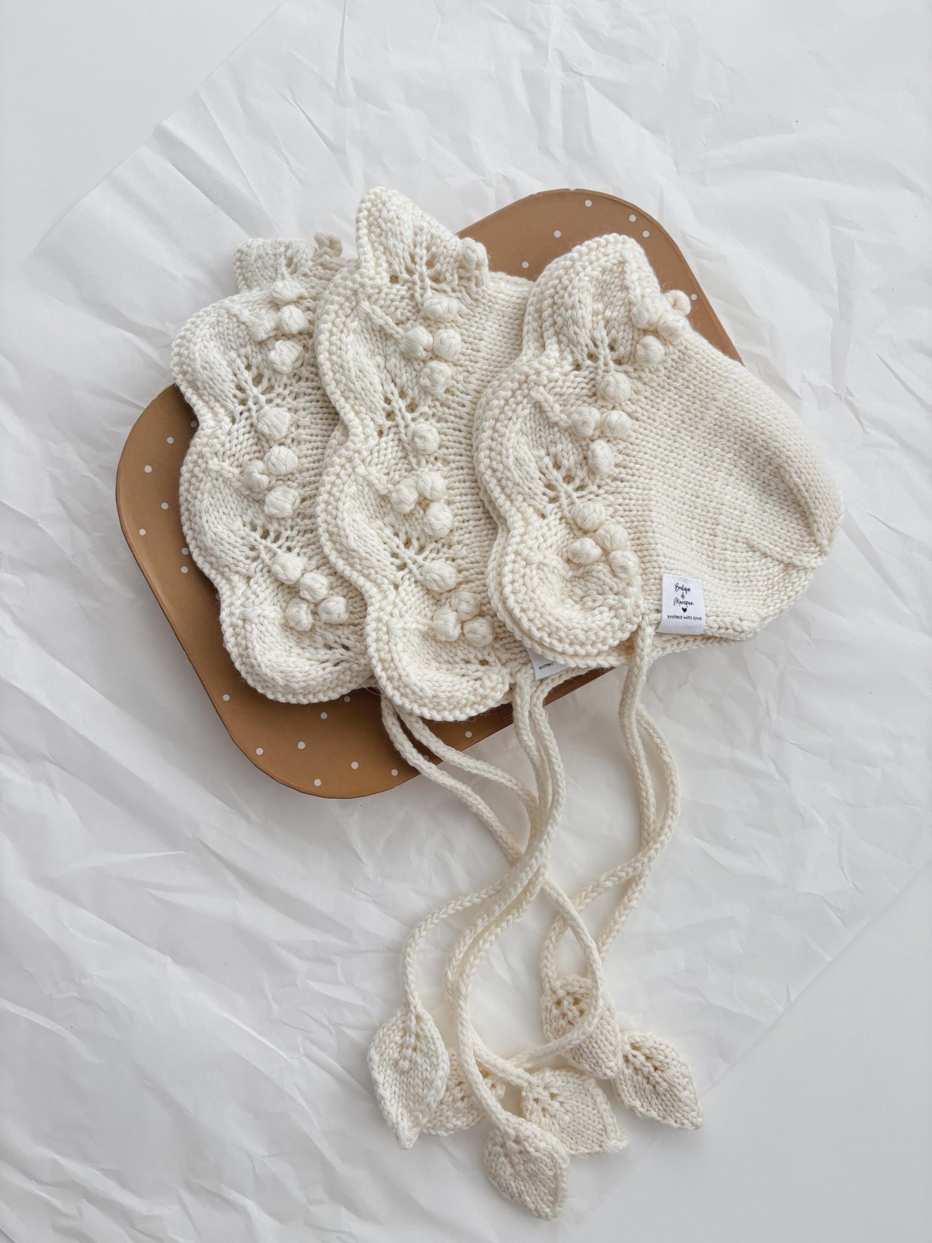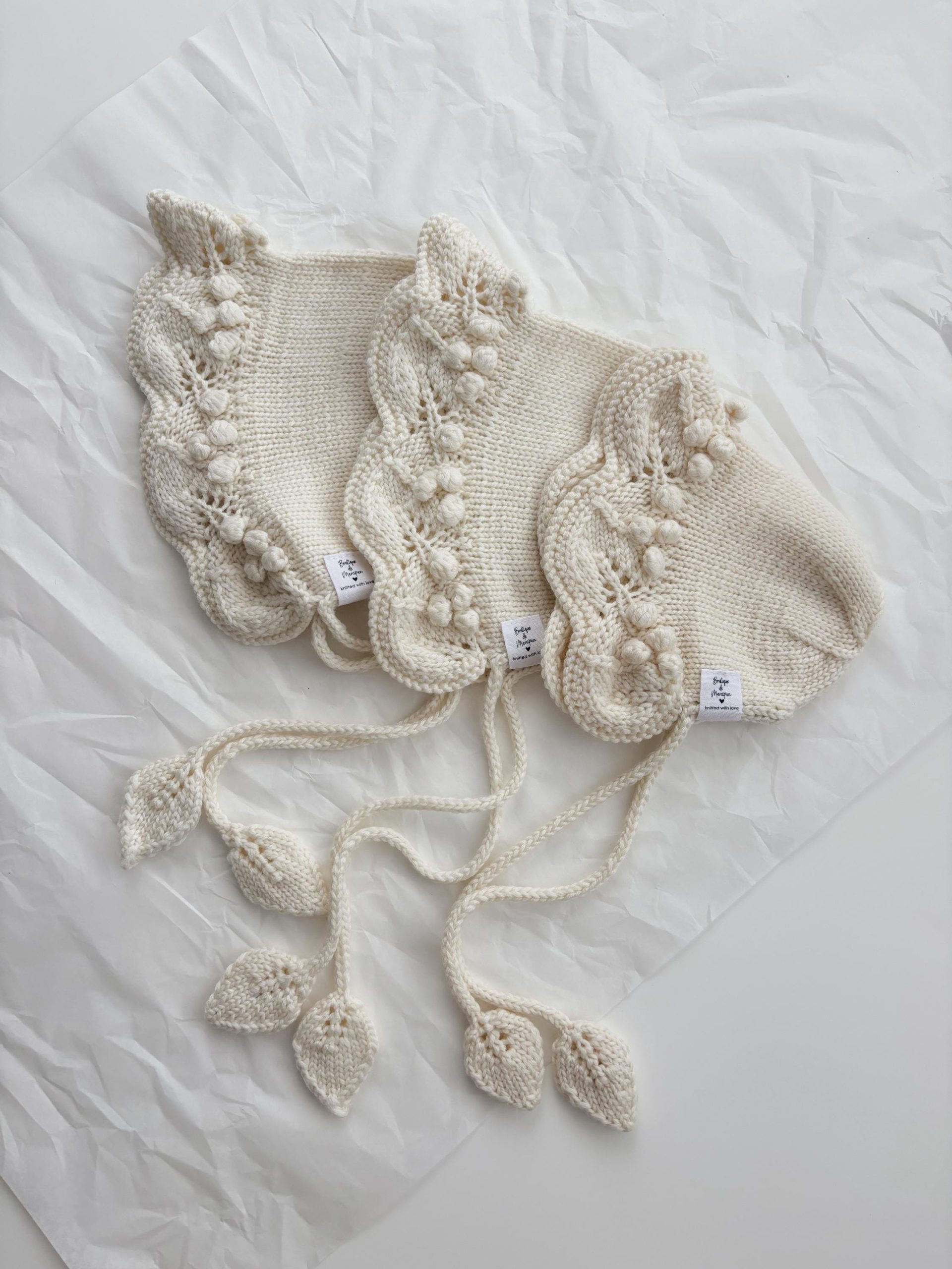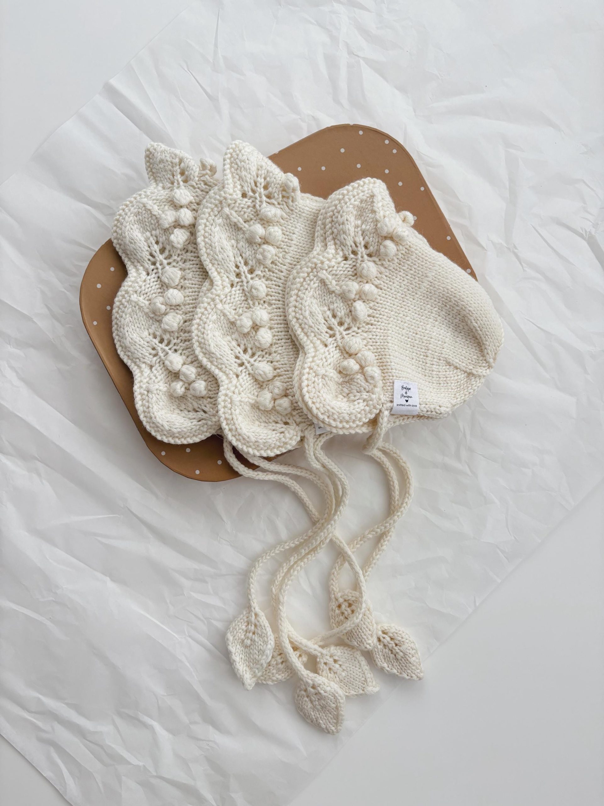 Hand Knitted Merino Baby Bonnet – Leaf Tie, Photo Prop
