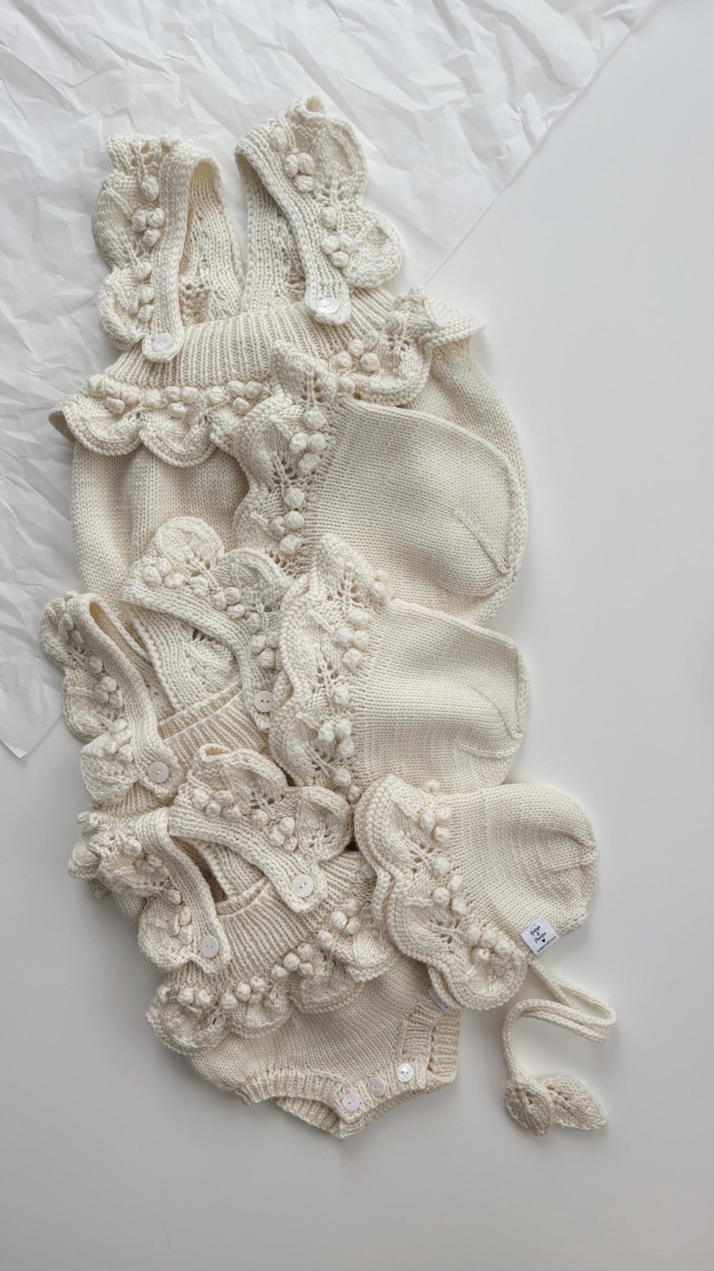 Baby girl popcorn bonnet – Alpaca yarn – Cream color