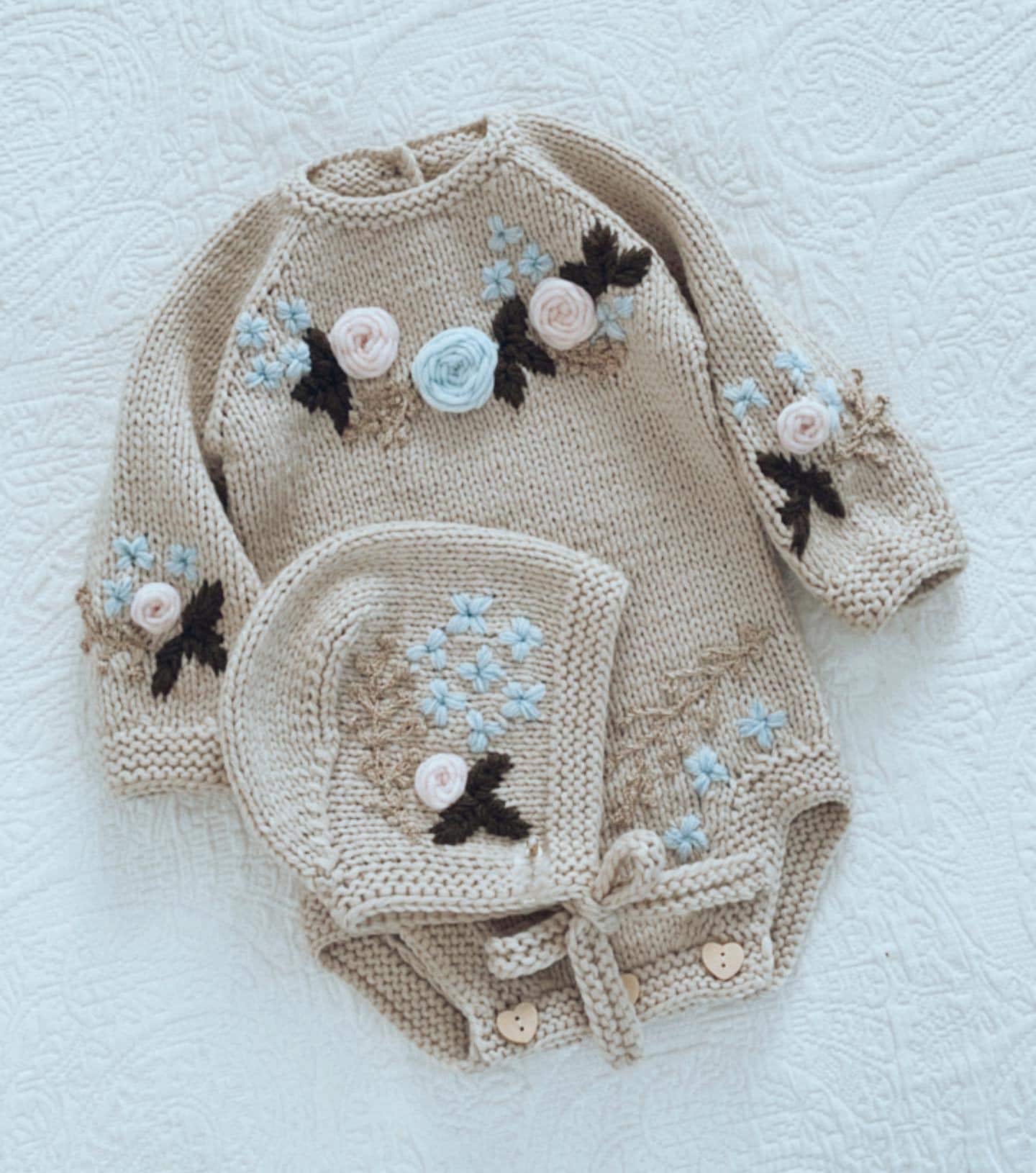 Hand Knit Merino Baby Romper and Bonnet Set – Photo Prop