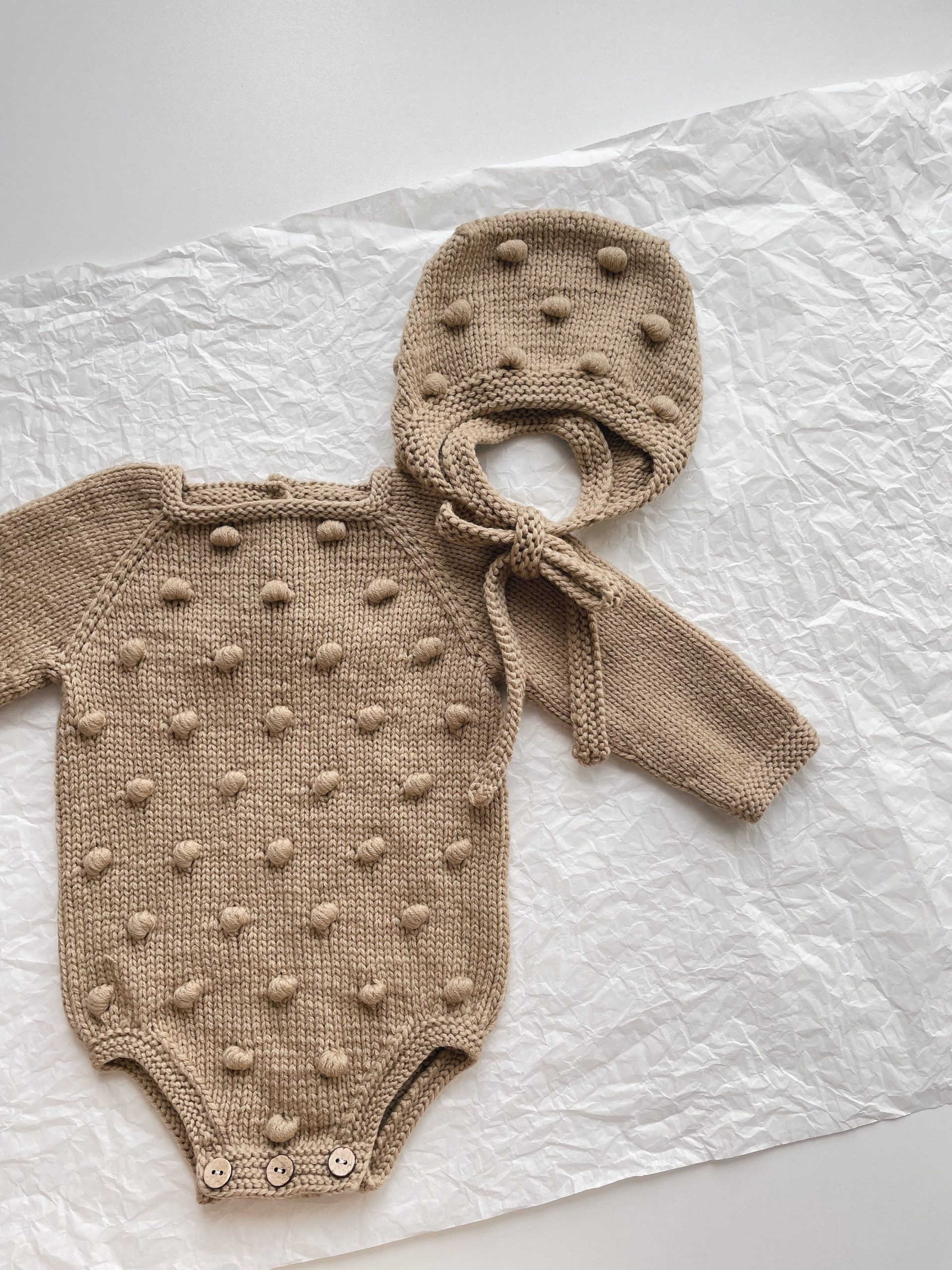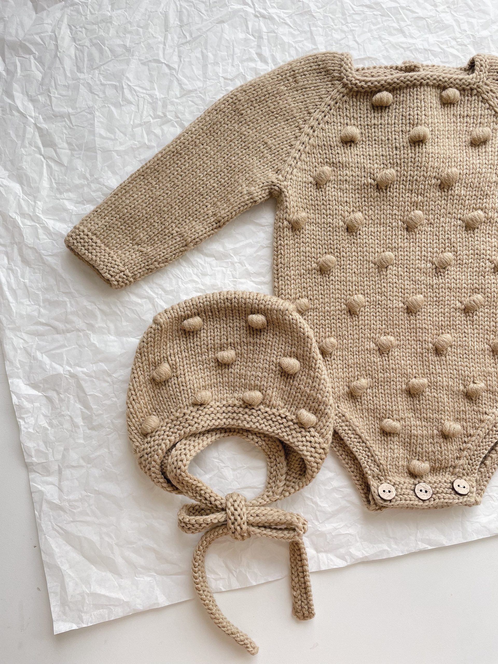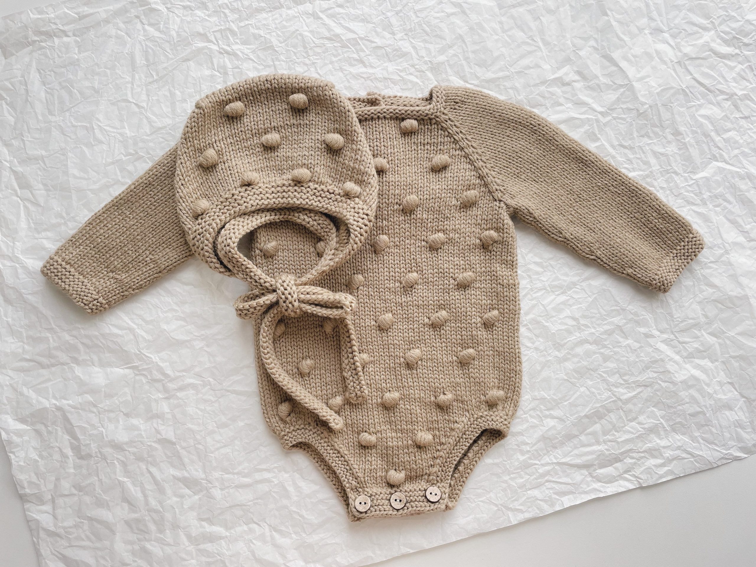 Hand-Knitted Merino Baby Romper and Bonnet Set – Beige Photo Prop