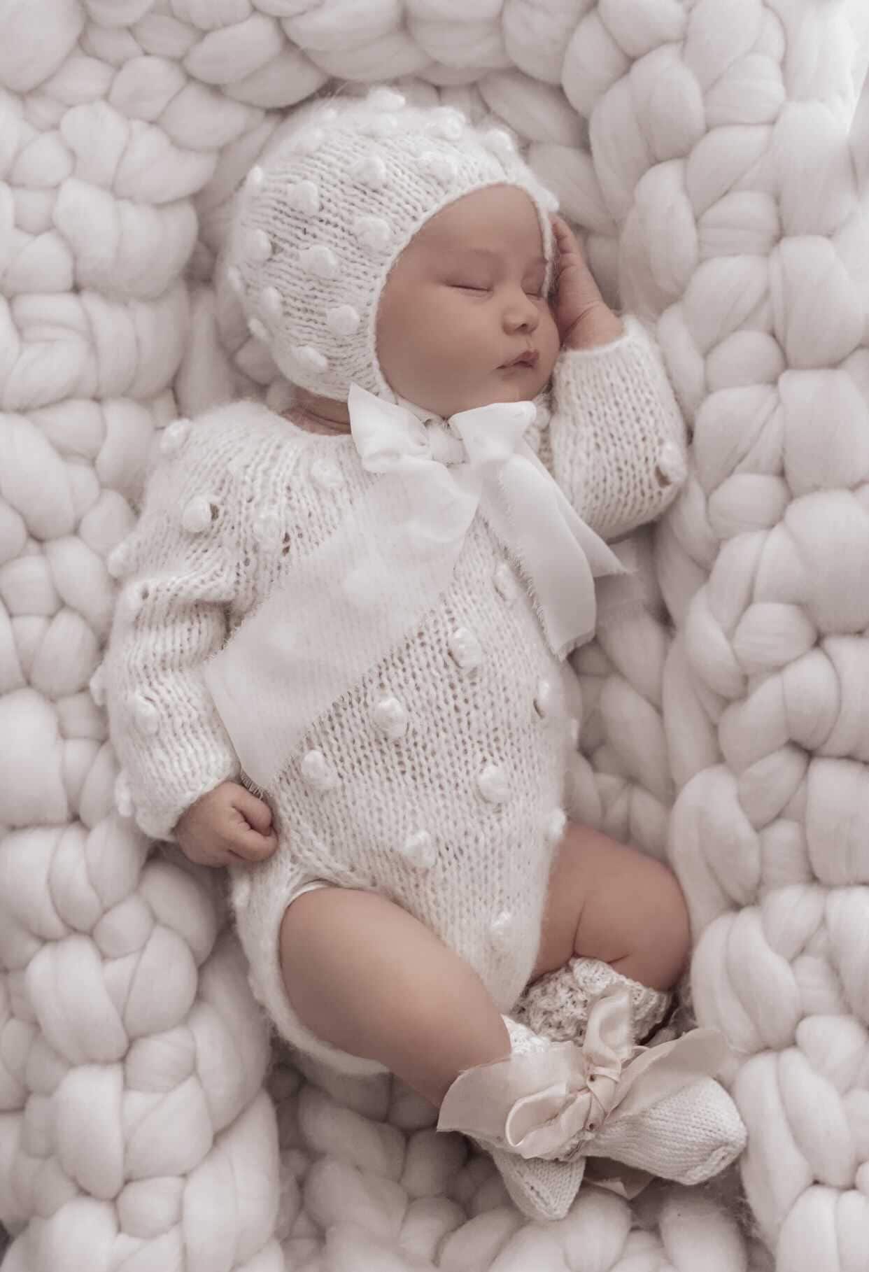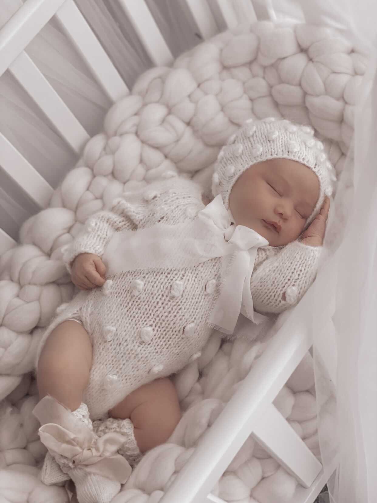 Knit Baby Romper Set – Alpaca Bonnet and Socks, Cream Photo Prop