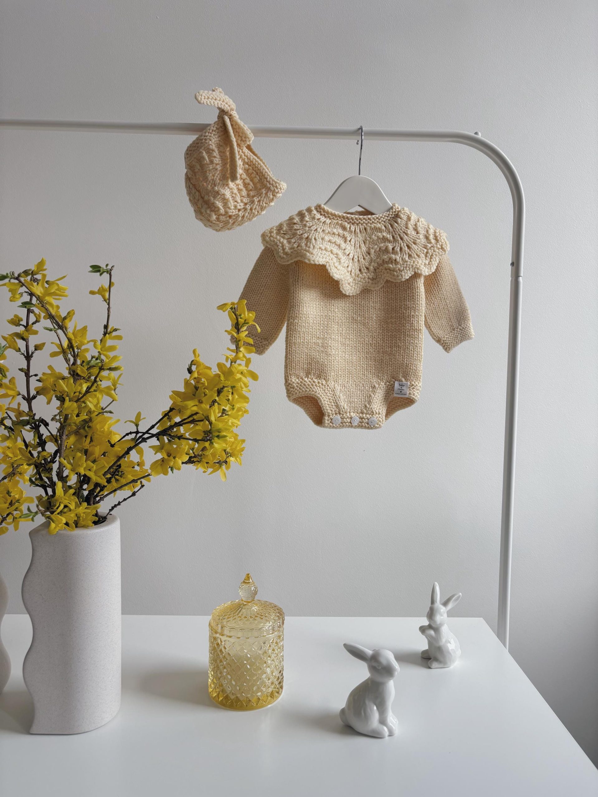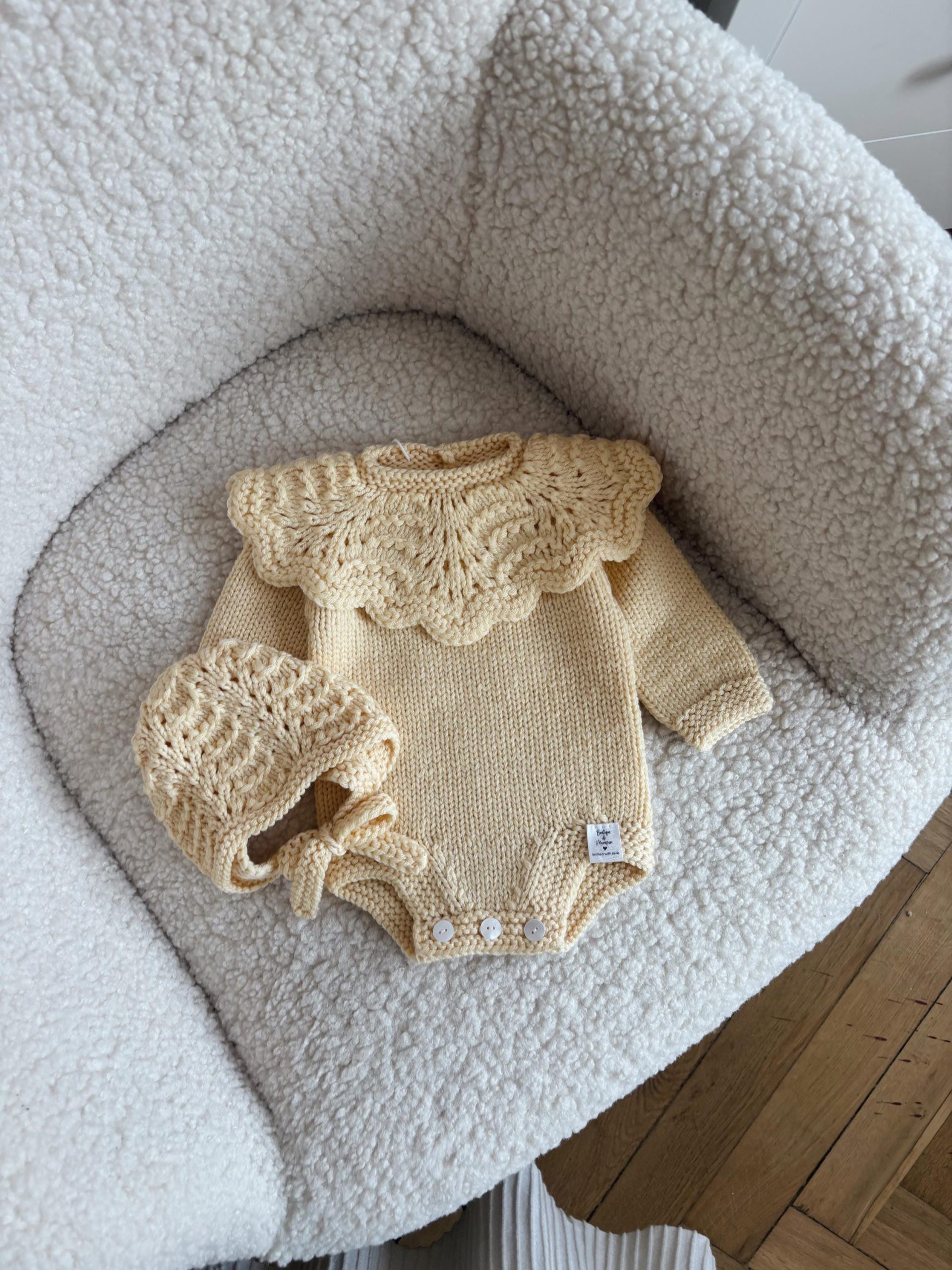 Embroidered Merino Baby Romper and Bonnet Set – Knitted Photo Prop