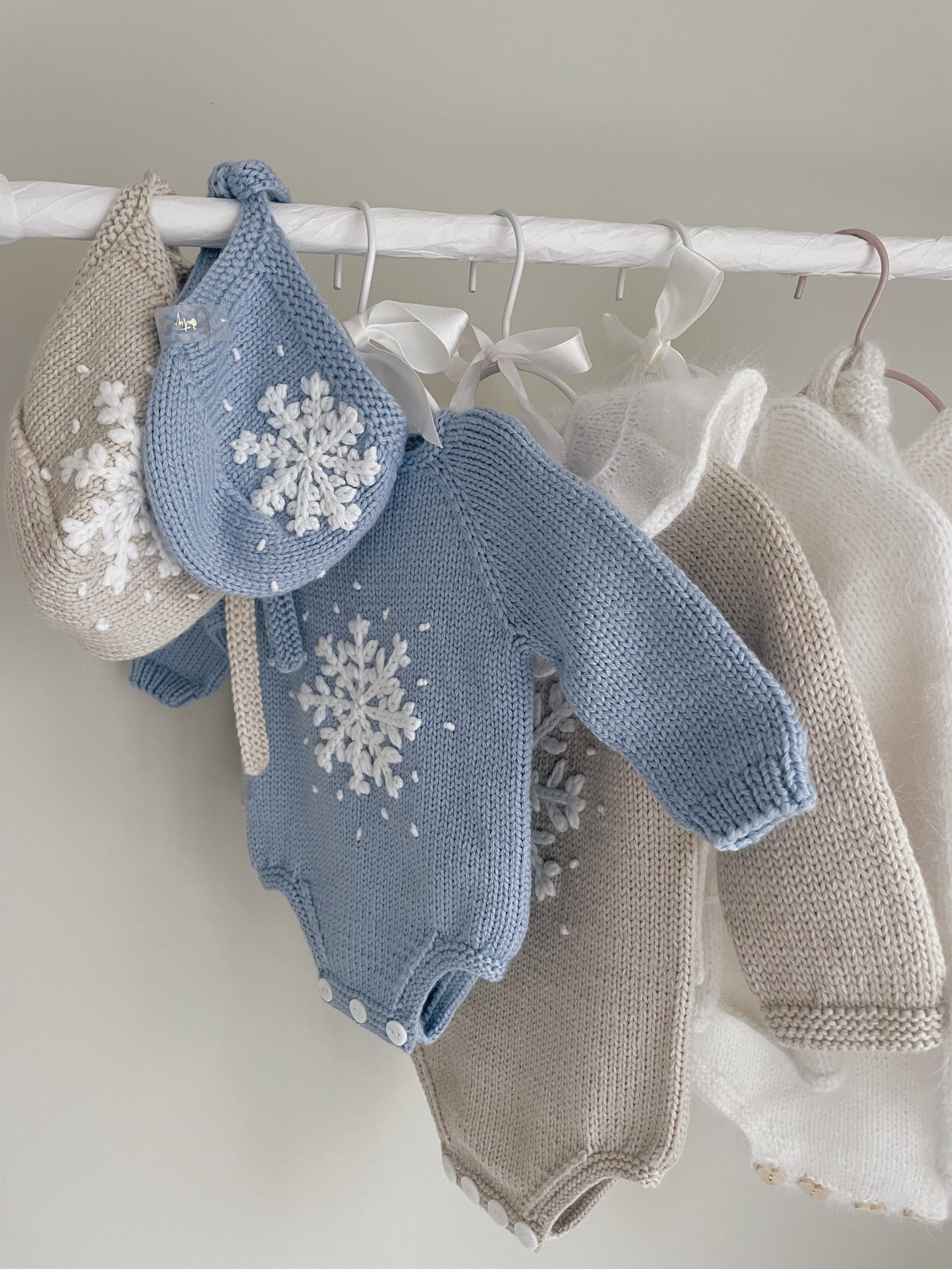 Knitted Merino Baby Romper, Bonnet, and Socks Set, Snowflake Outfit