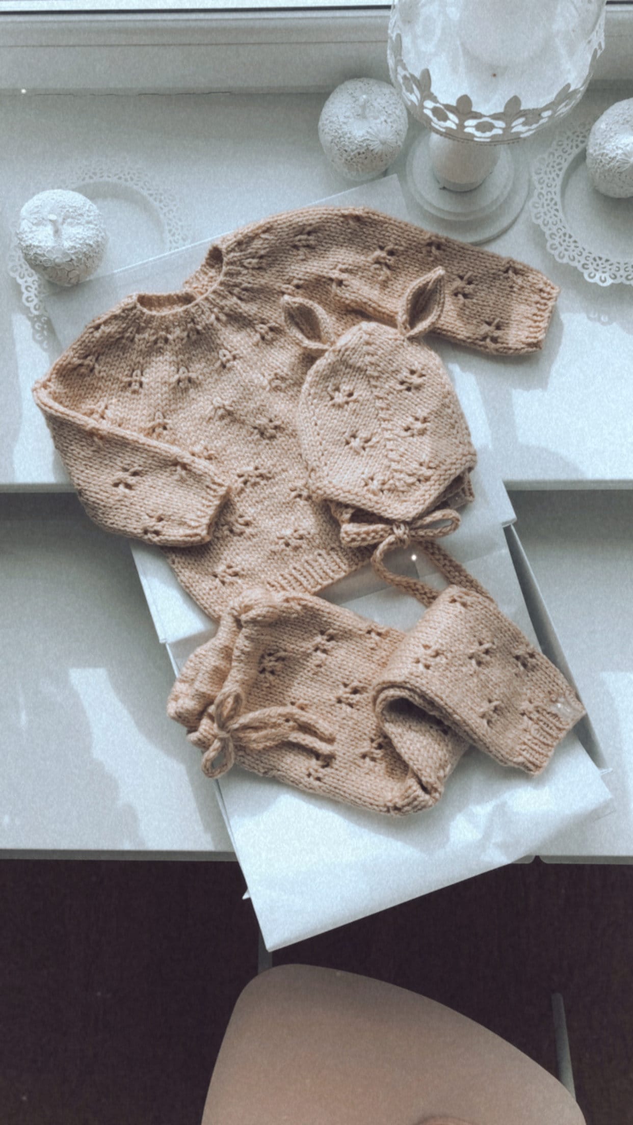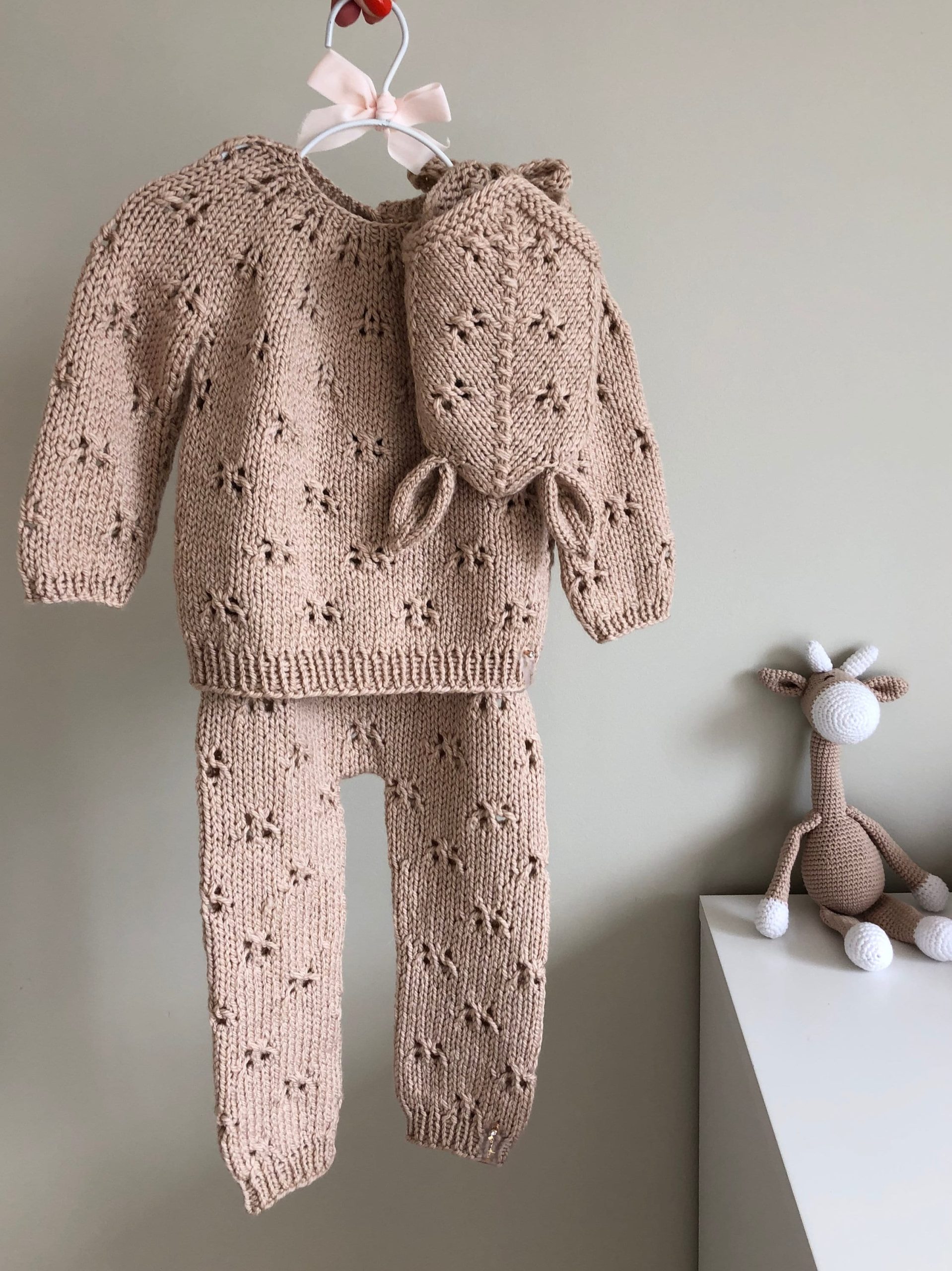 Merino Baby Knit Set – Beige Sweater, Pants & Elf Bonnet