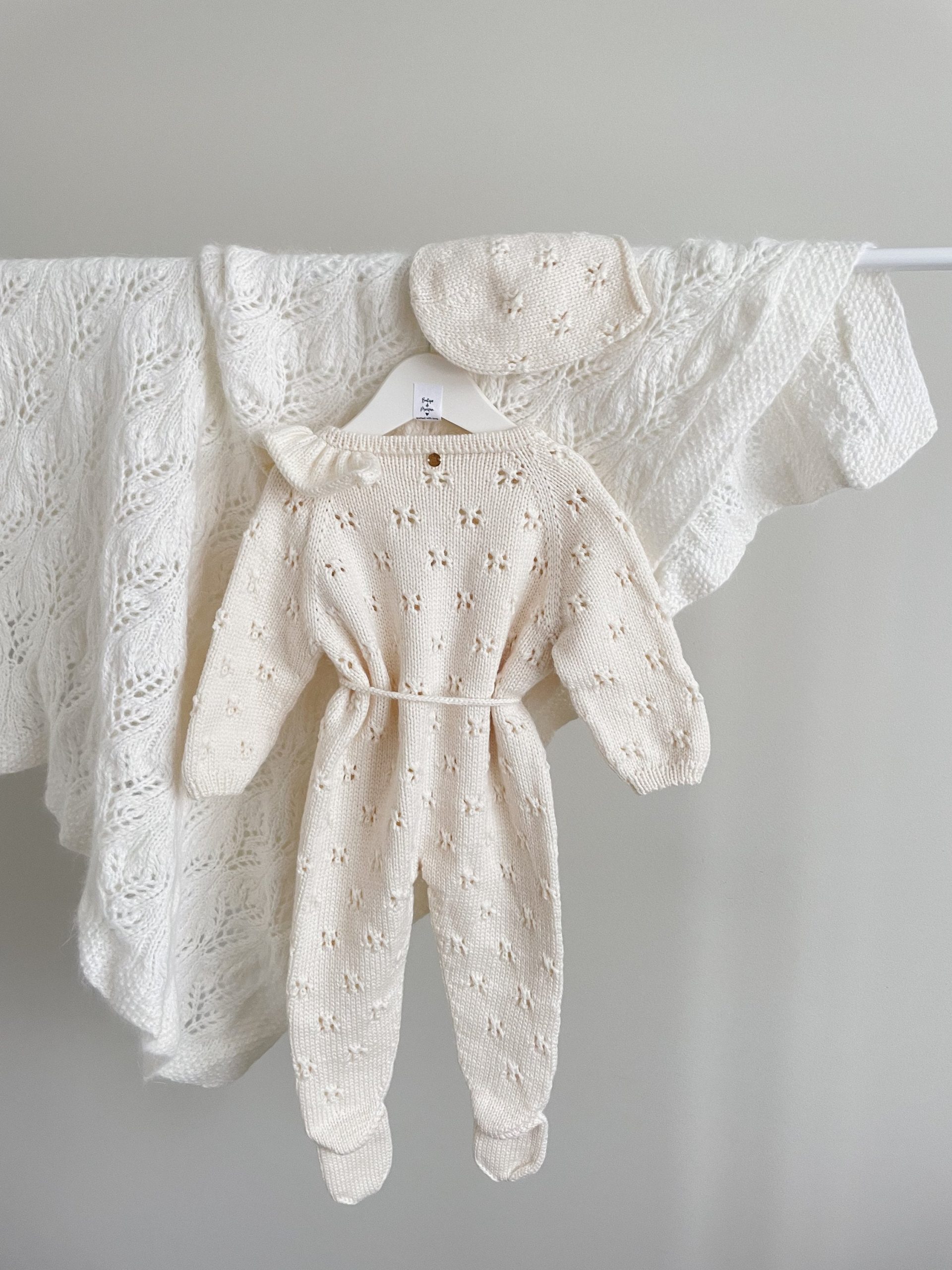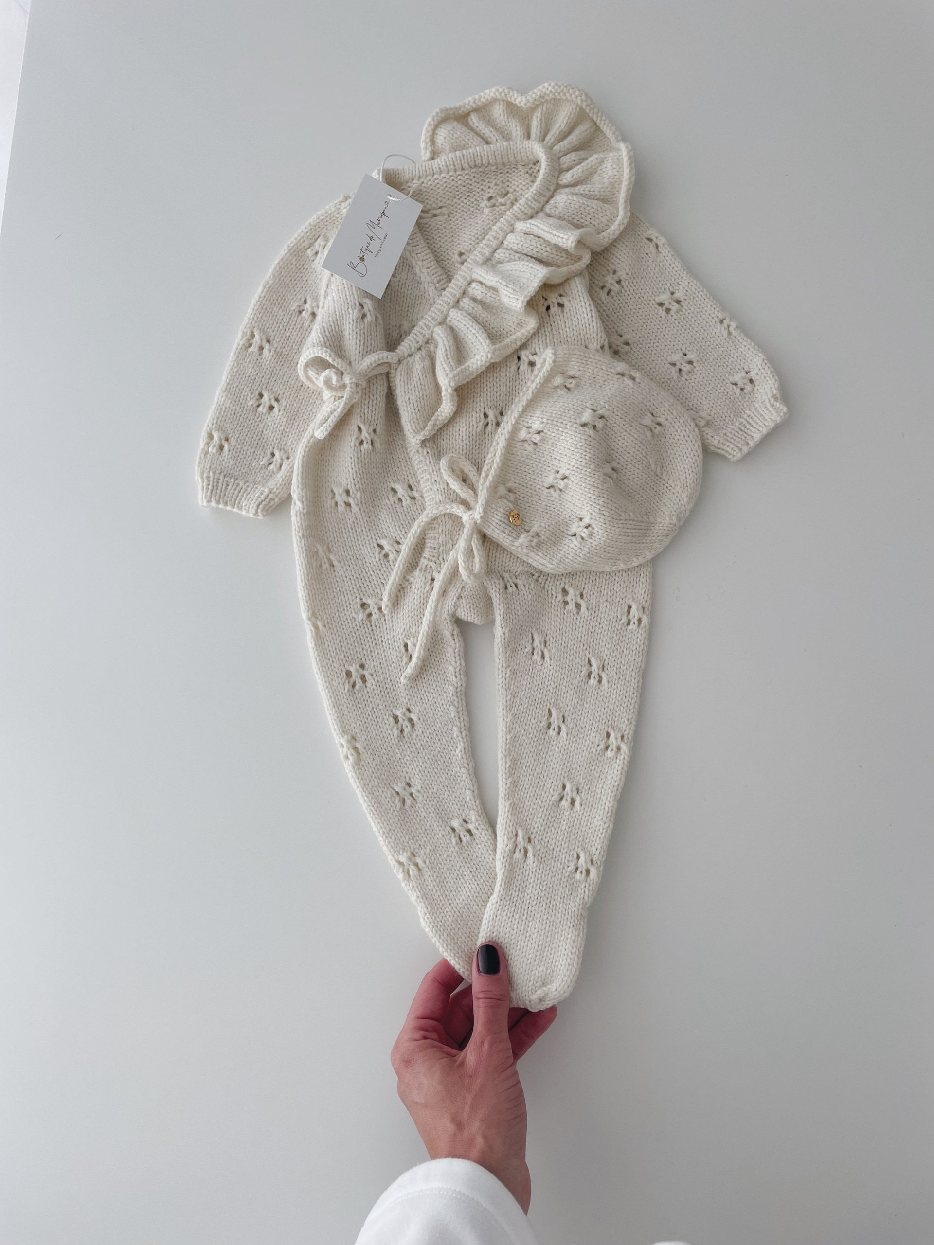 Merino Baby Romper and Bonnet Set – Cream Knit with Ruffles