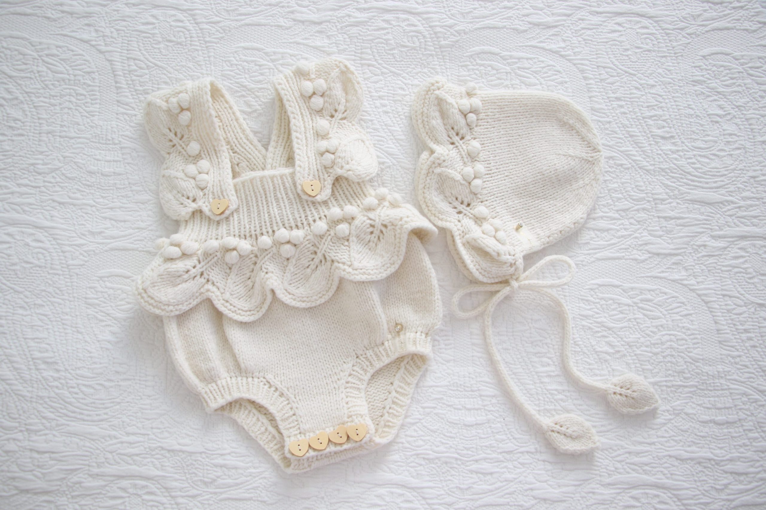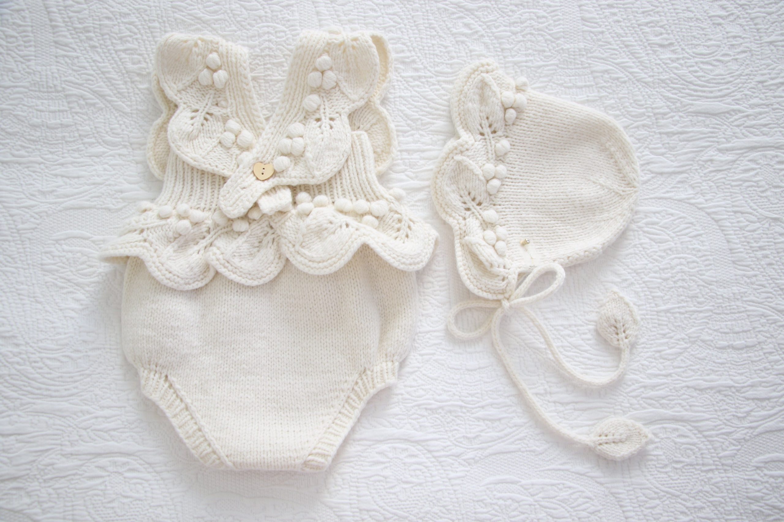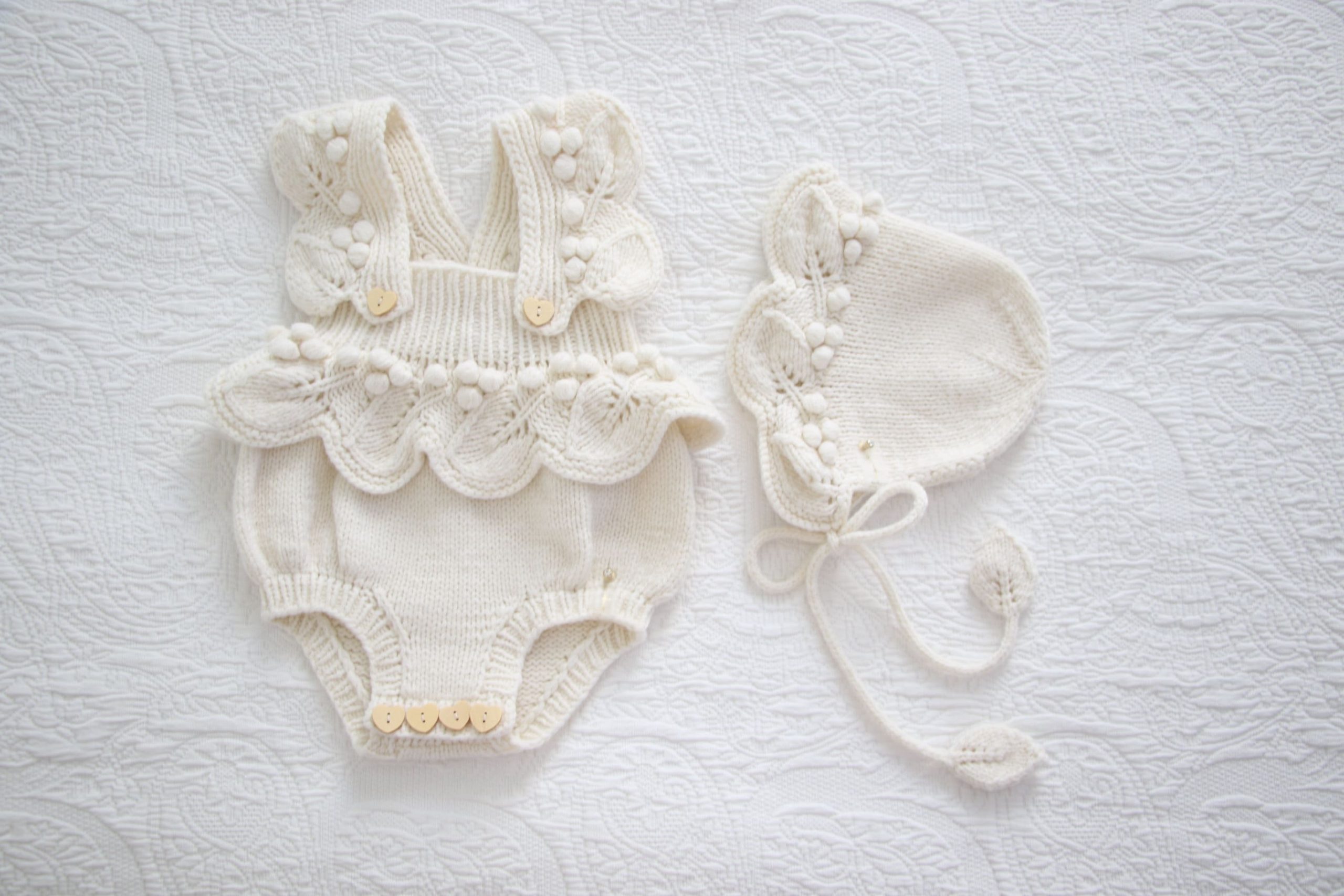 Embroidered Merino Baby Romper and Bonnet Set – Knitted Photo Prop