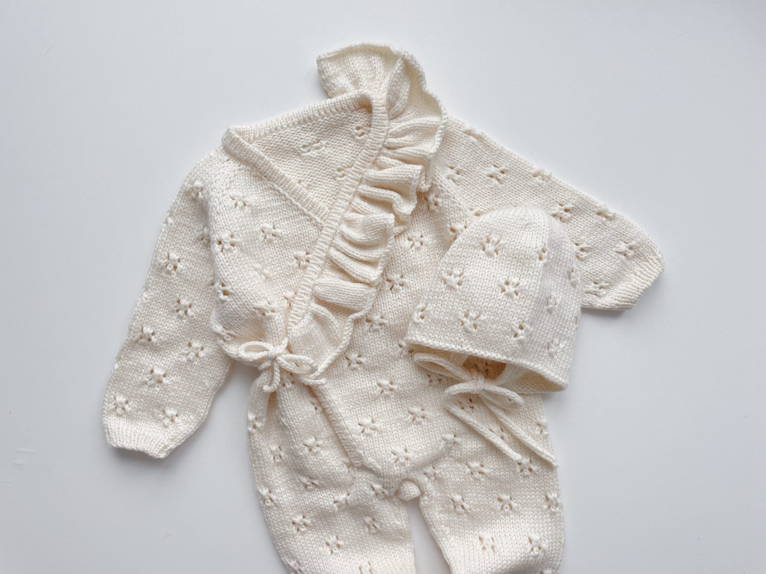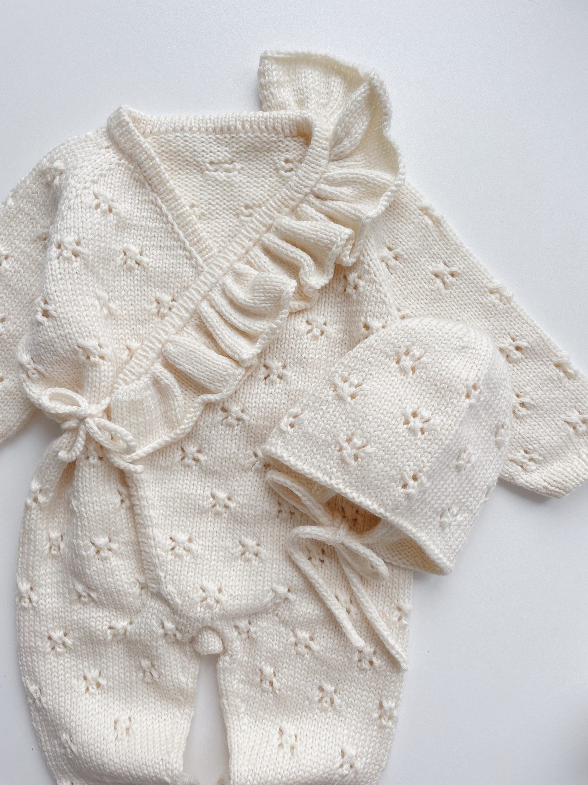 Merino Knit Baby Angel Outfit – Romper, Bonnet & Booties