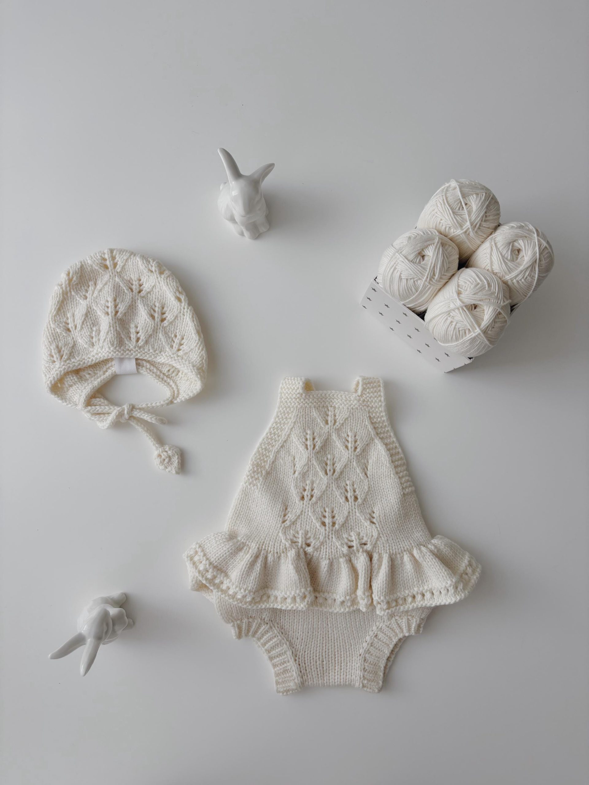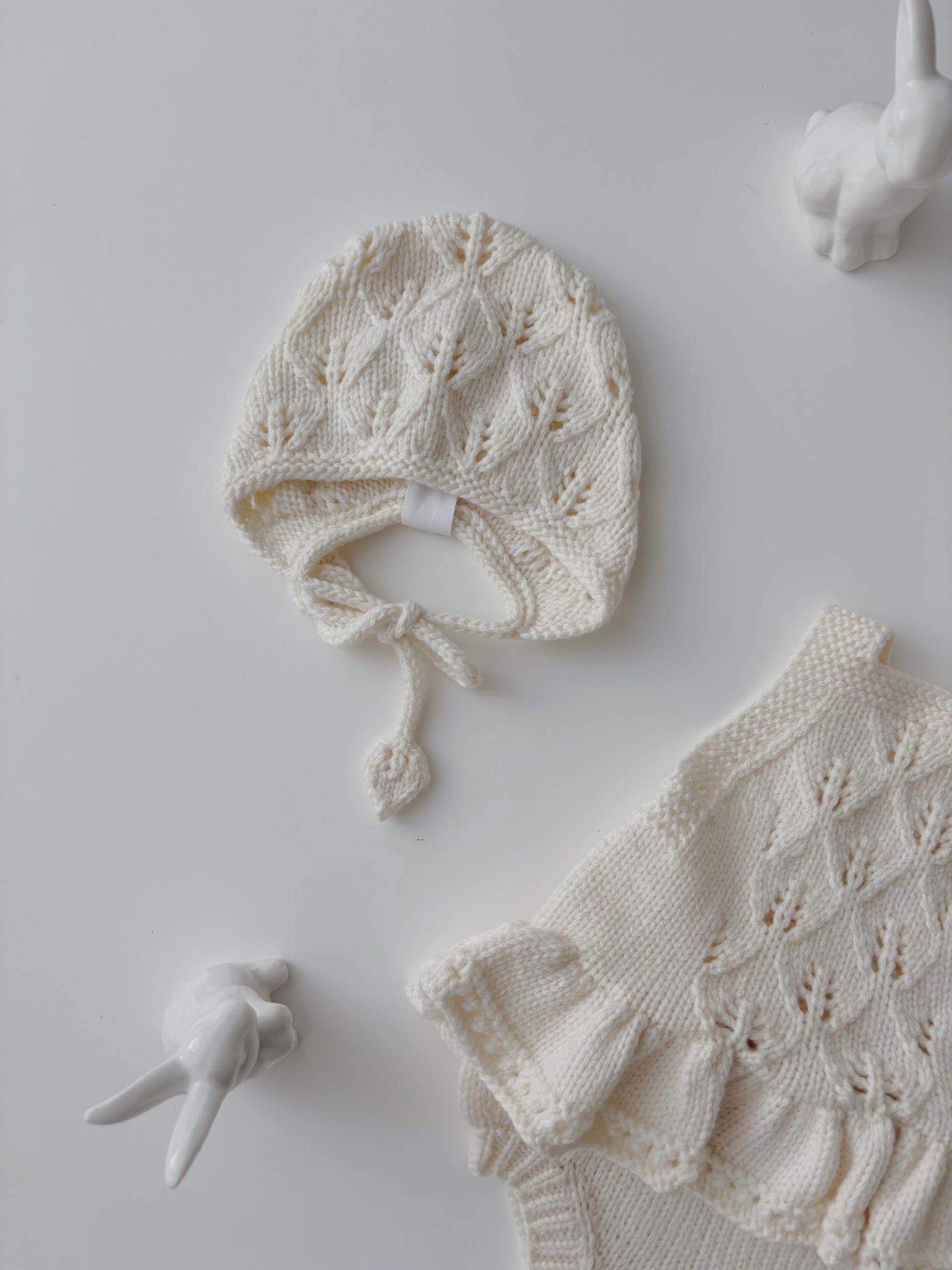 Knit Baby Romper Set – Alpaca Bonnet and Socks, Cream Photo Prop