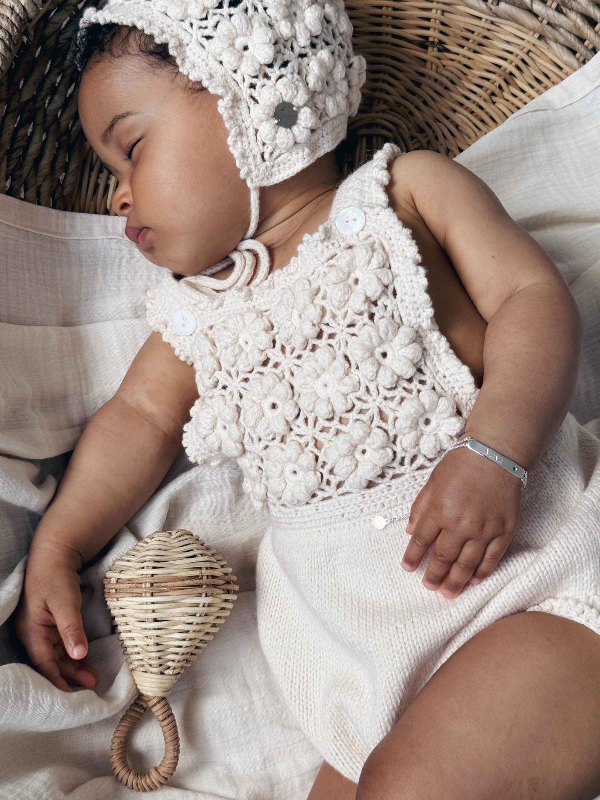 Embroidered Merino Baby Romper and Bonnet Set – Knitted Photo Prop
