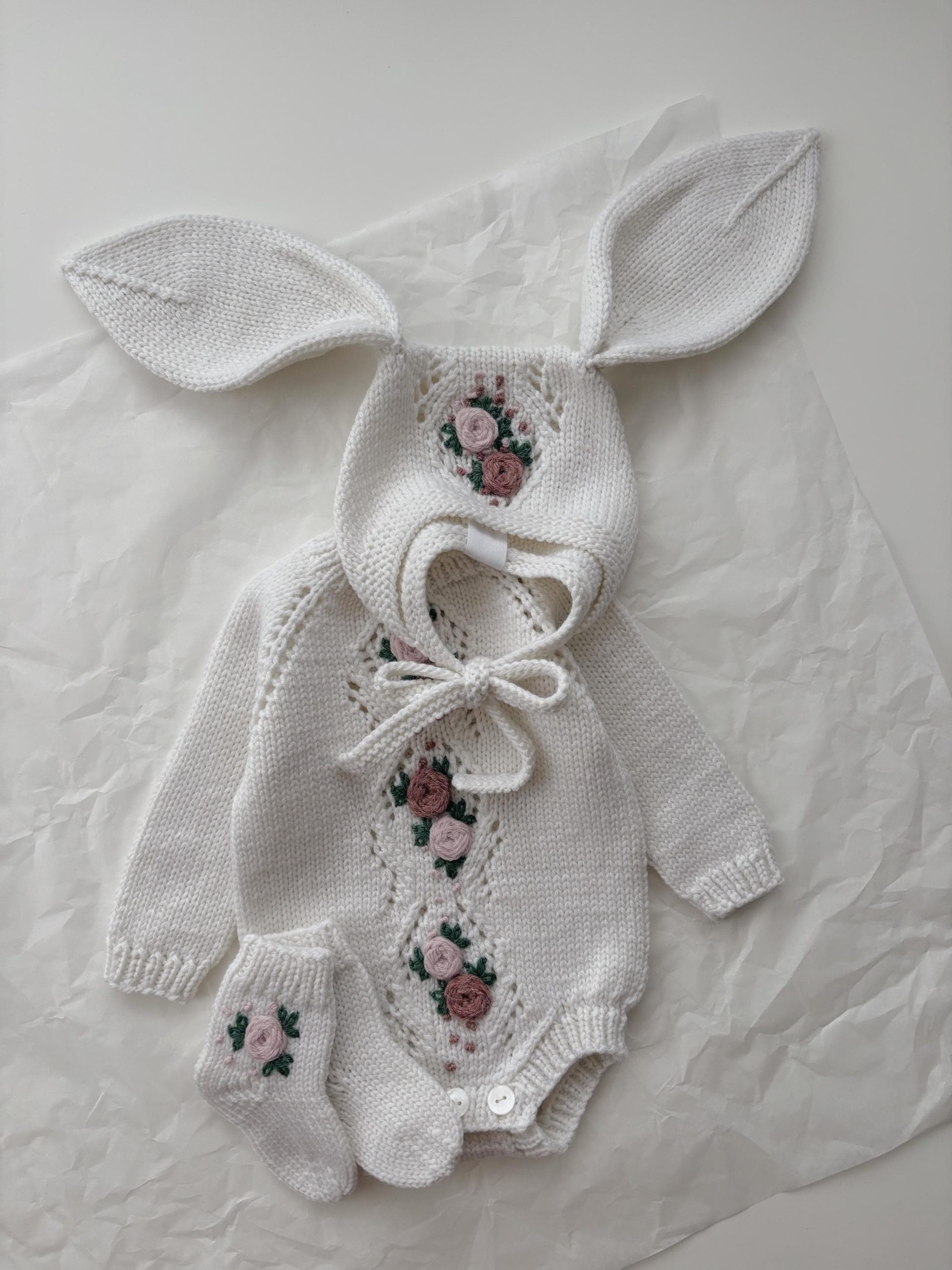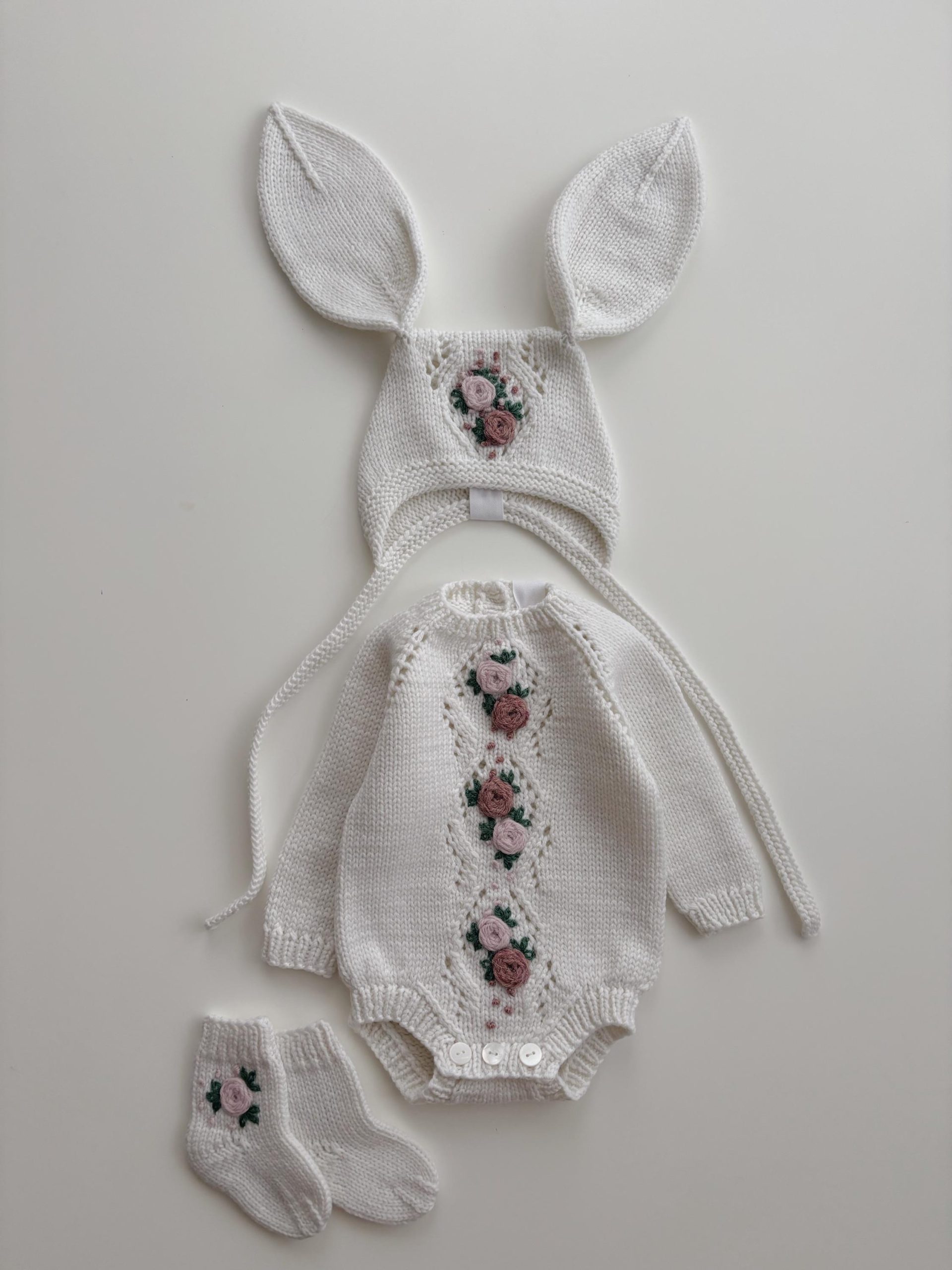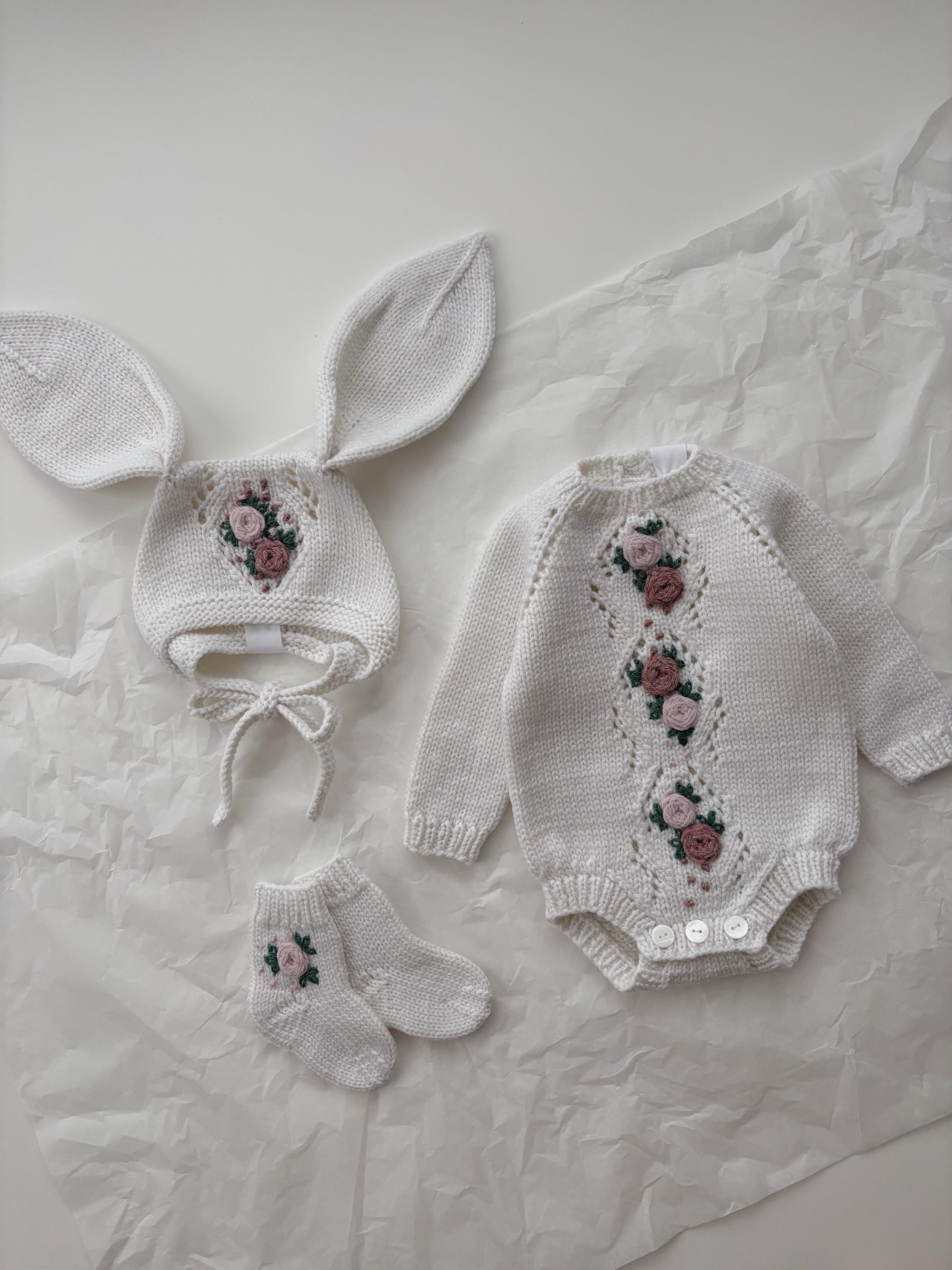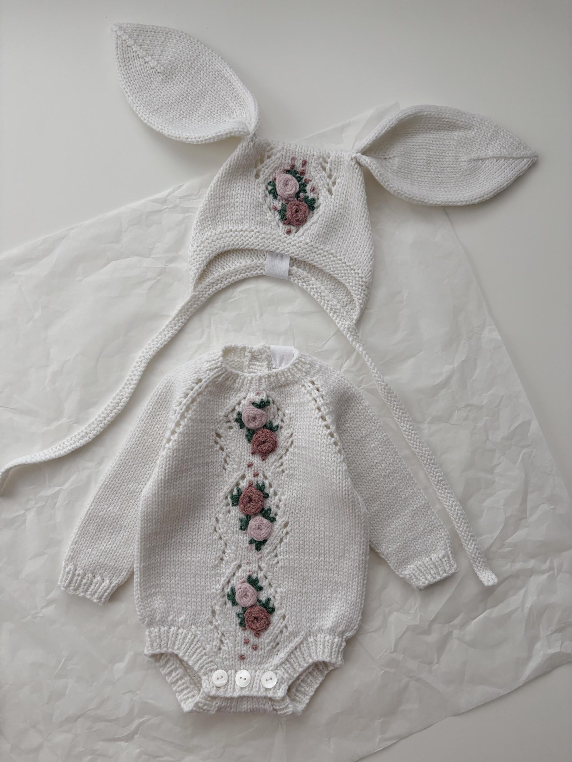 Embroidered Merino Baby Romper and Bonnet Set – Knitted Photo Prop