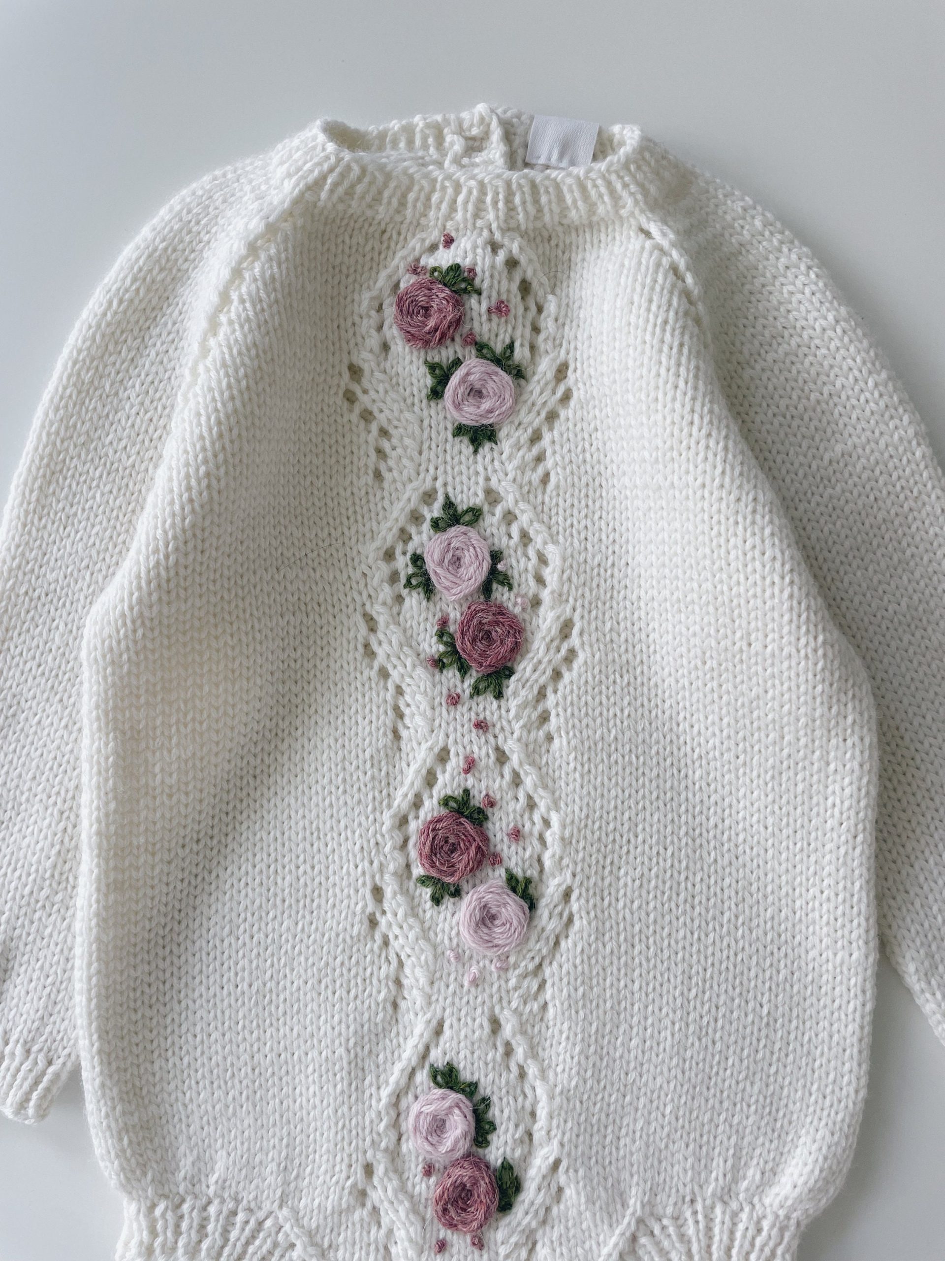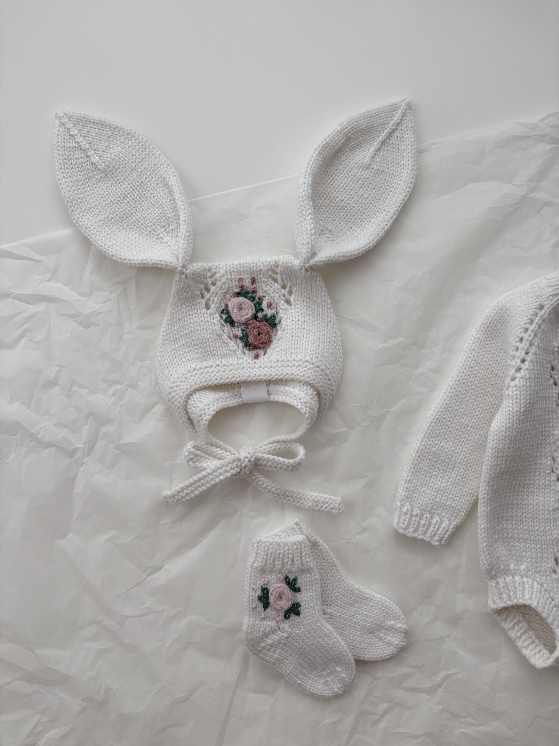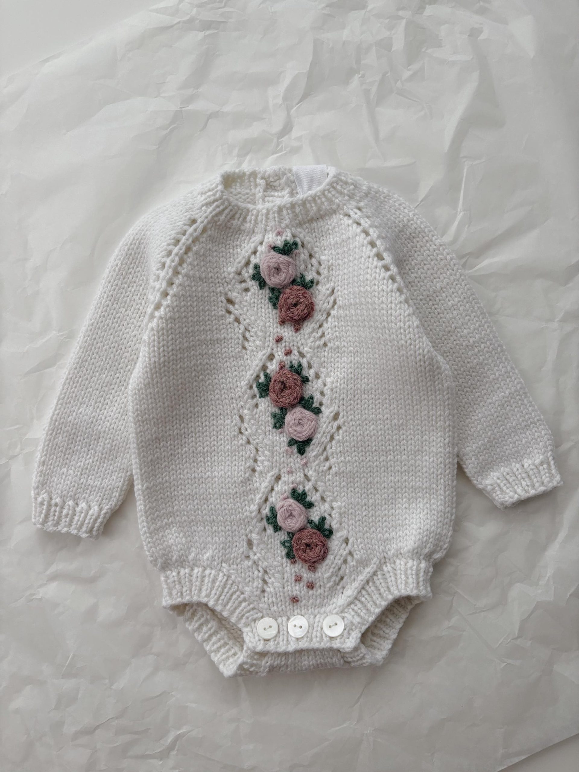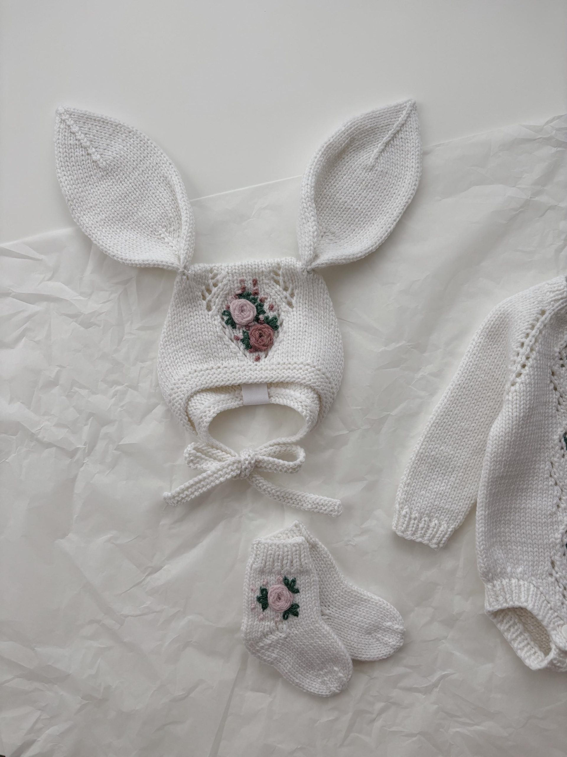 Embroidered Merino Baby Romper and Bonnet Set – Knitted Photo Prop