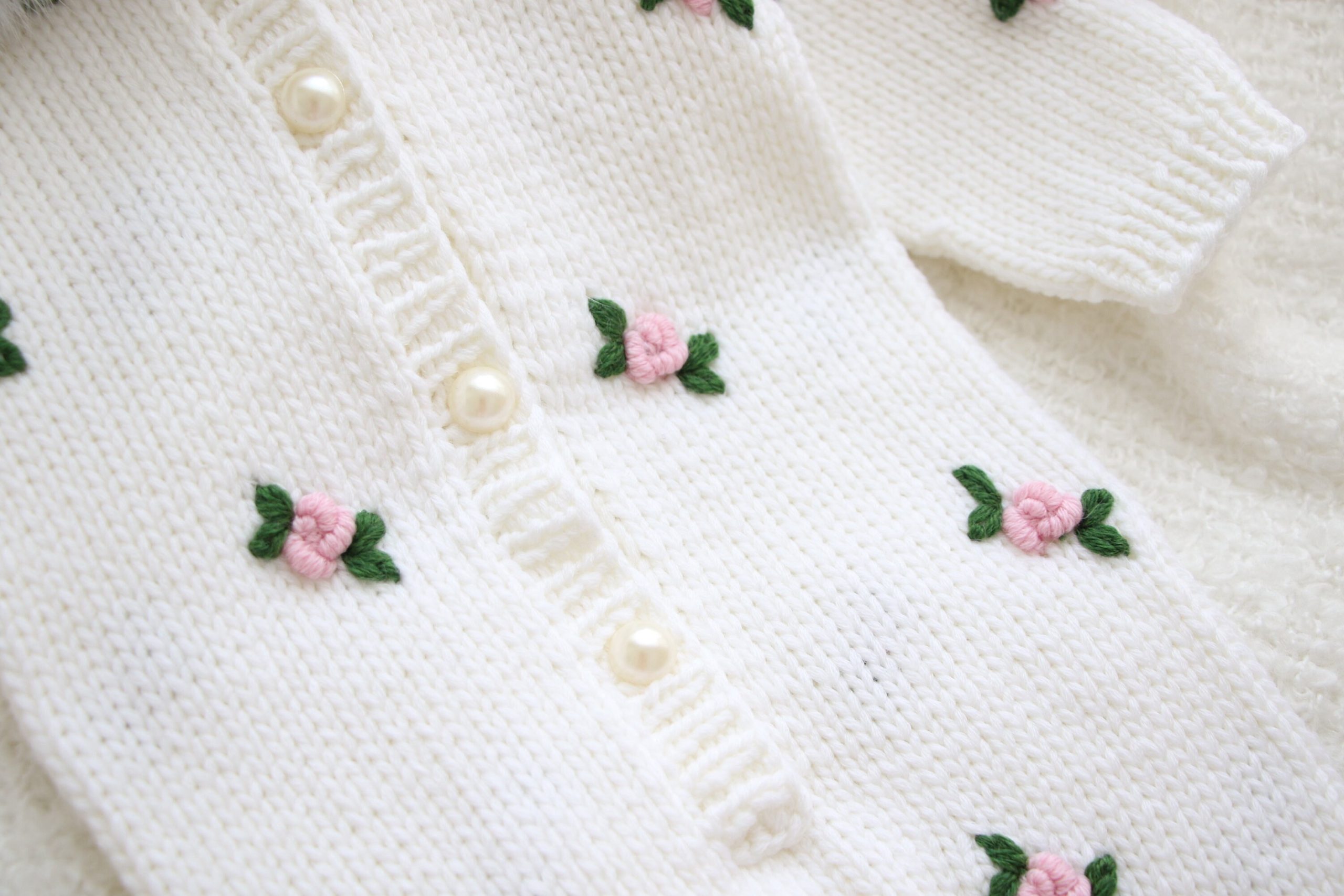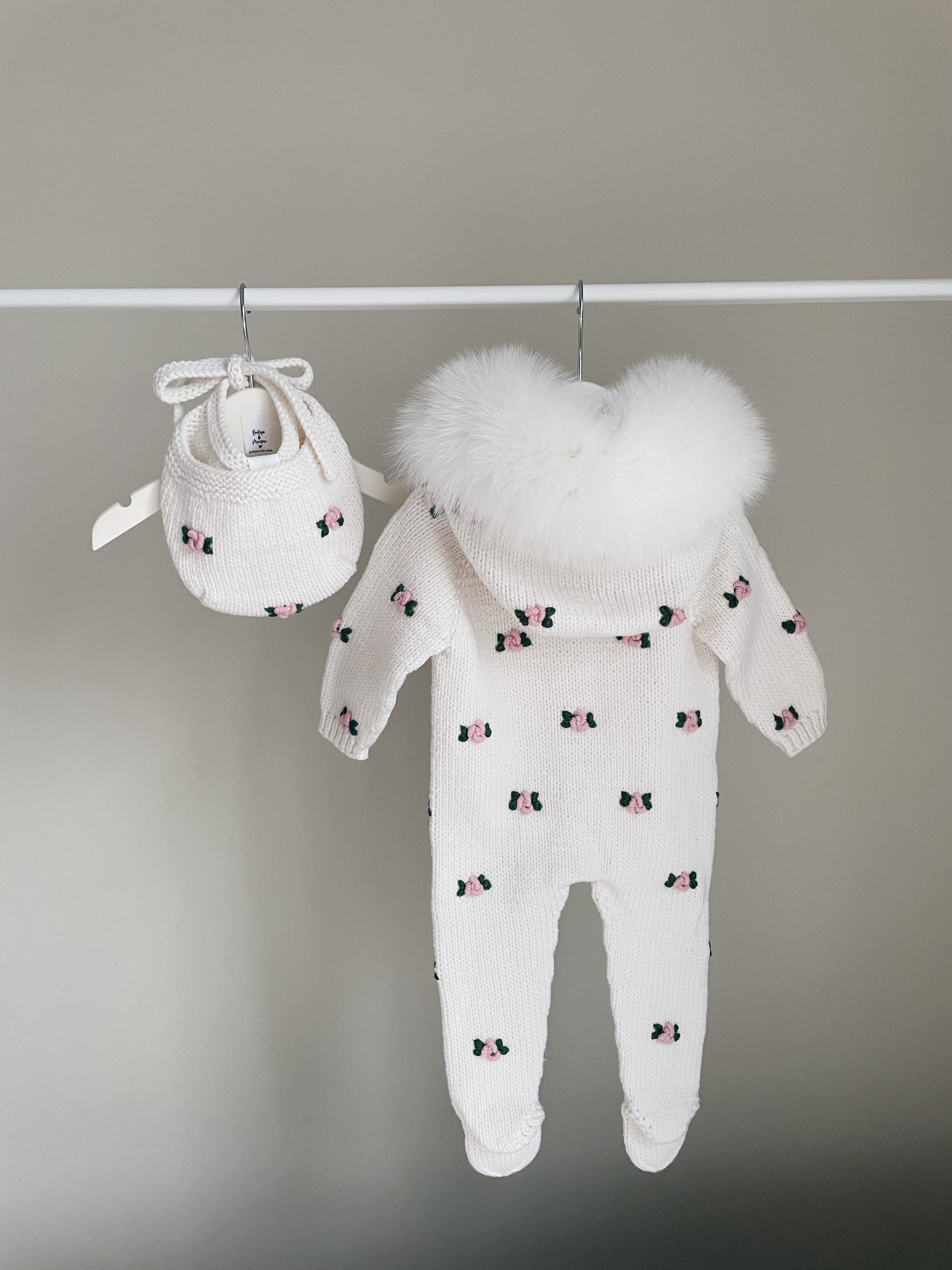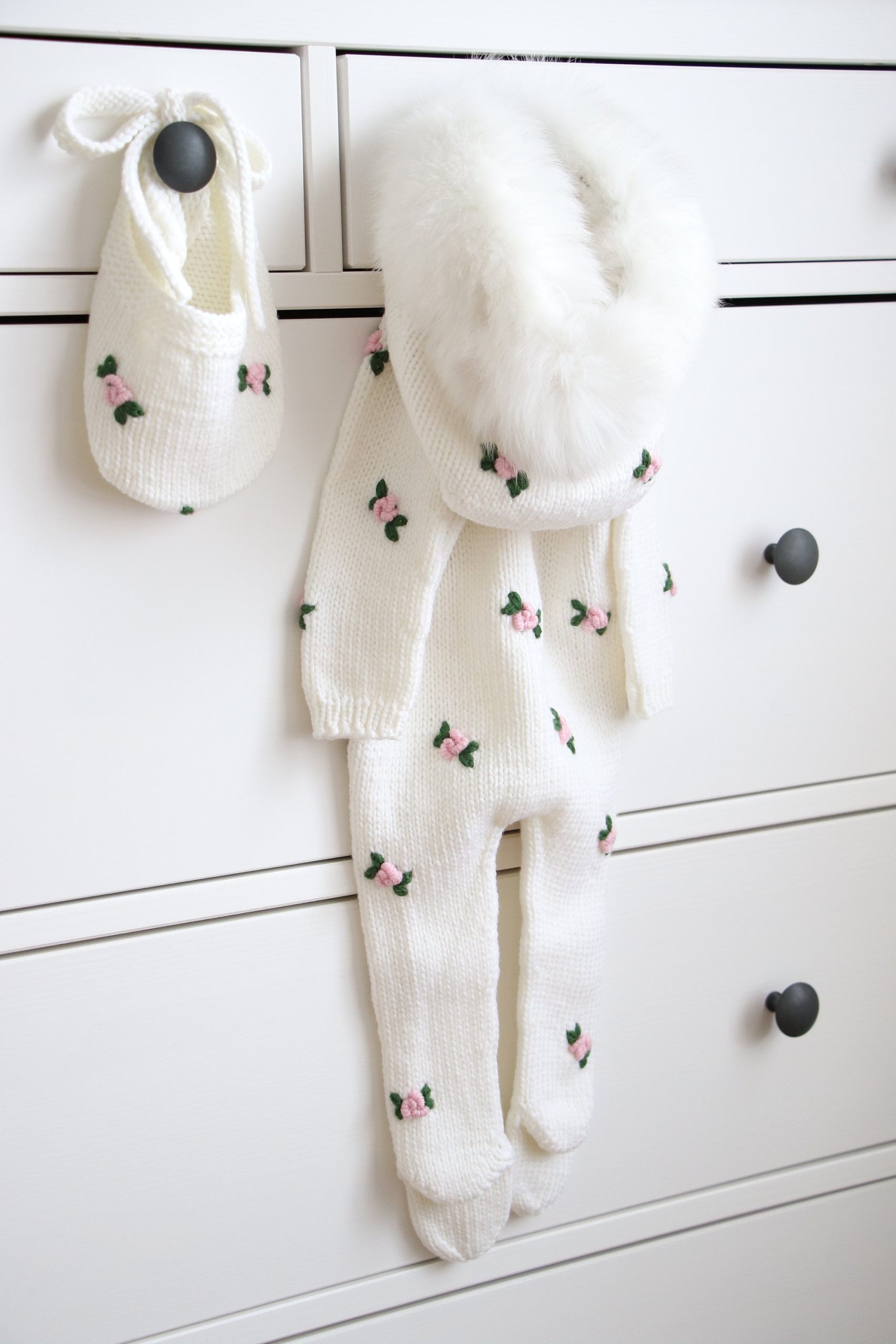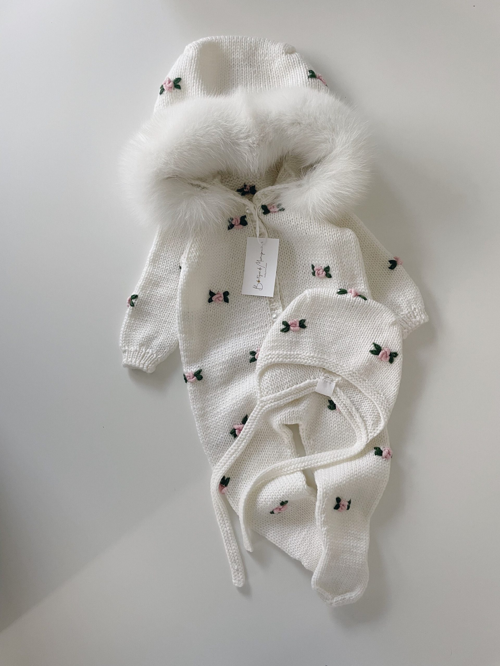 Embroidered Merino Baby Romper and Bonnet Set – Knitted Photo Prop