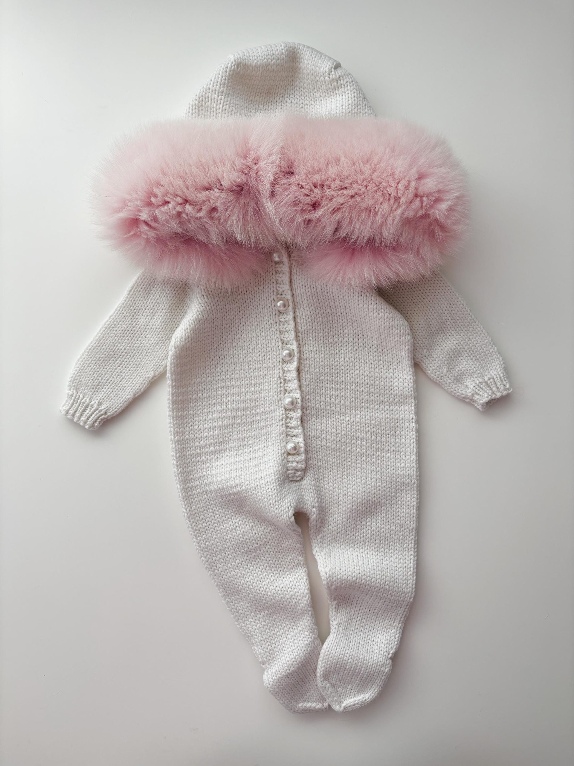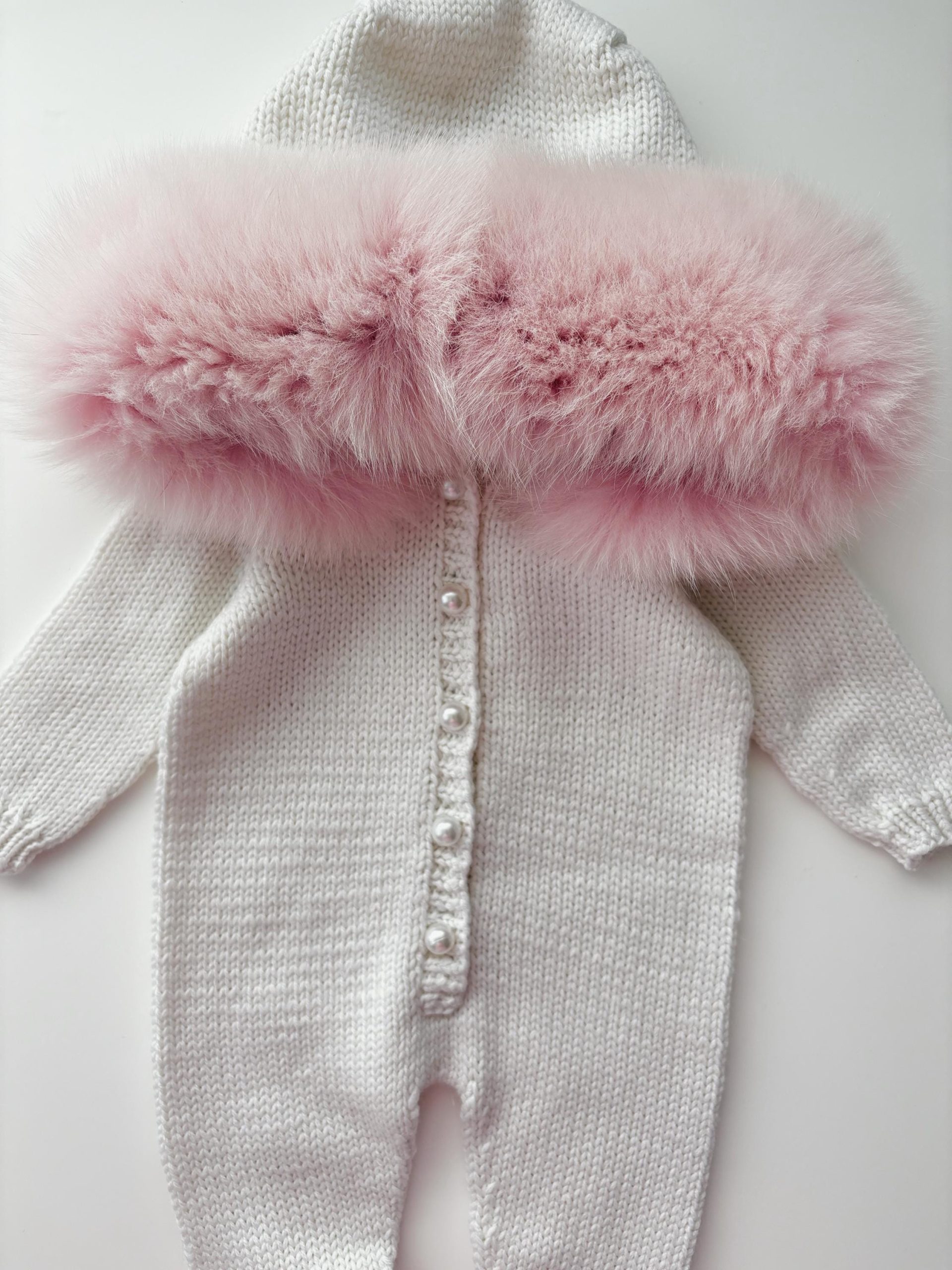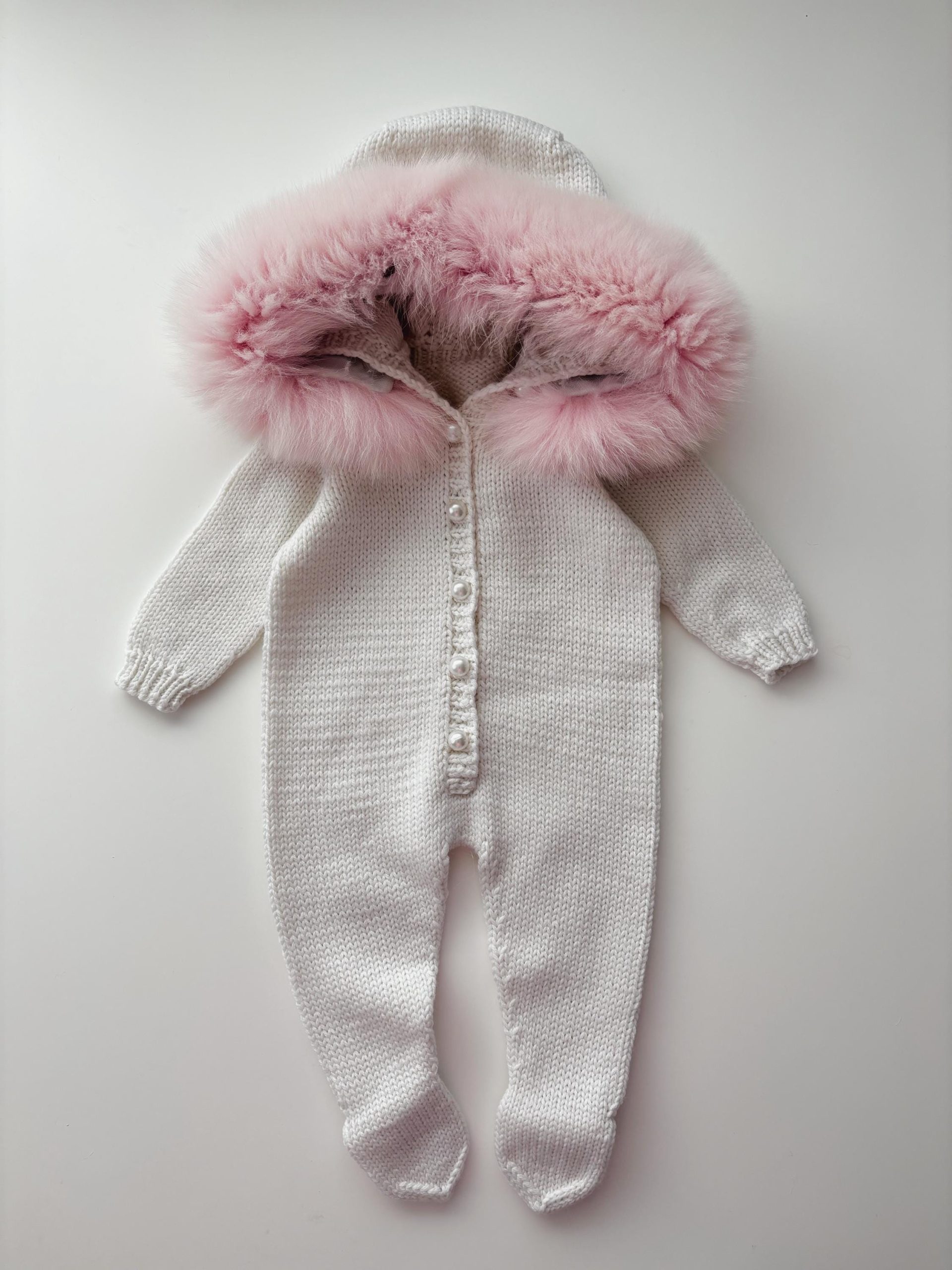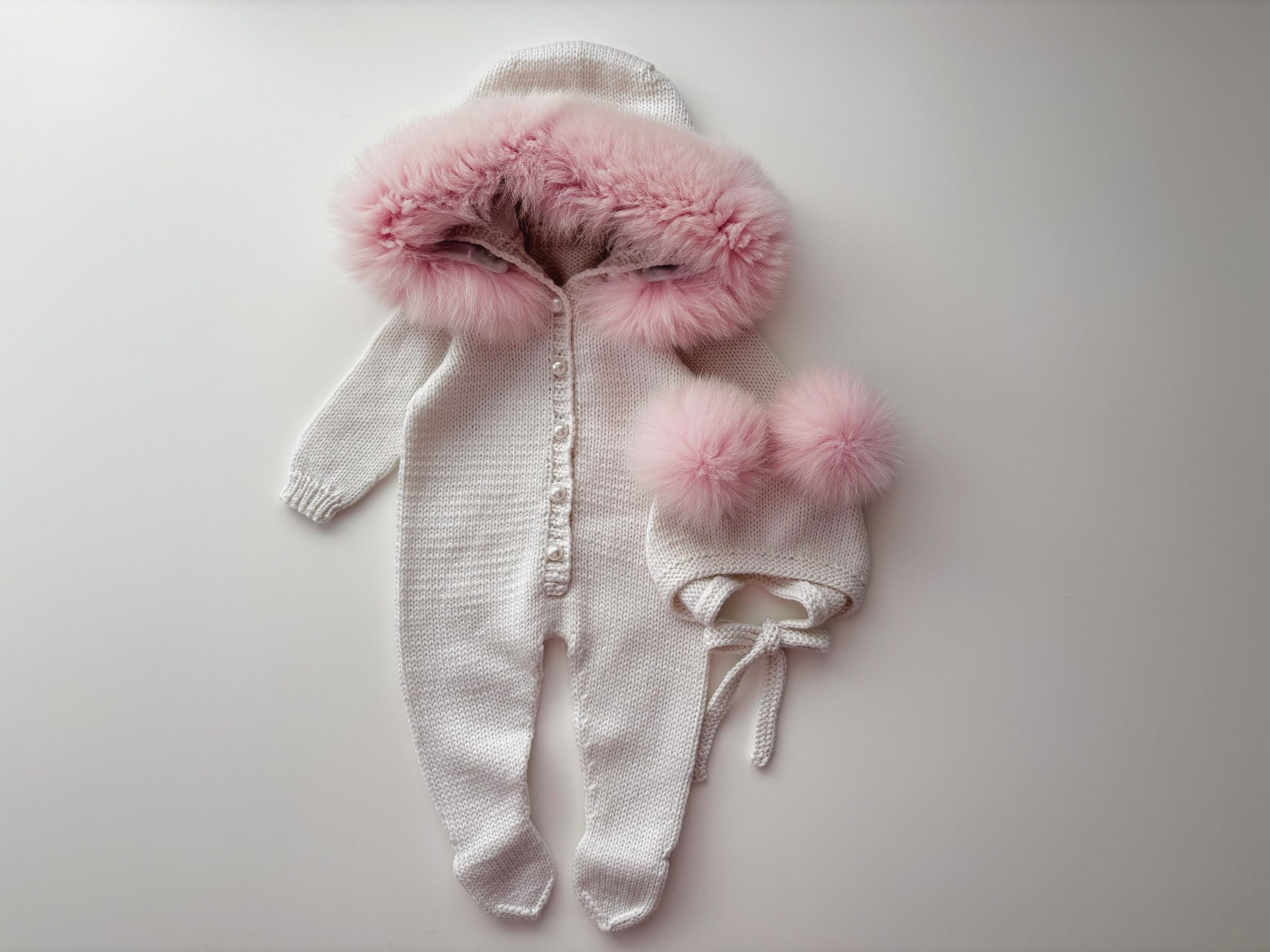 Merino Baby Romper with Genuine Fur Trim Hood & Bonnet