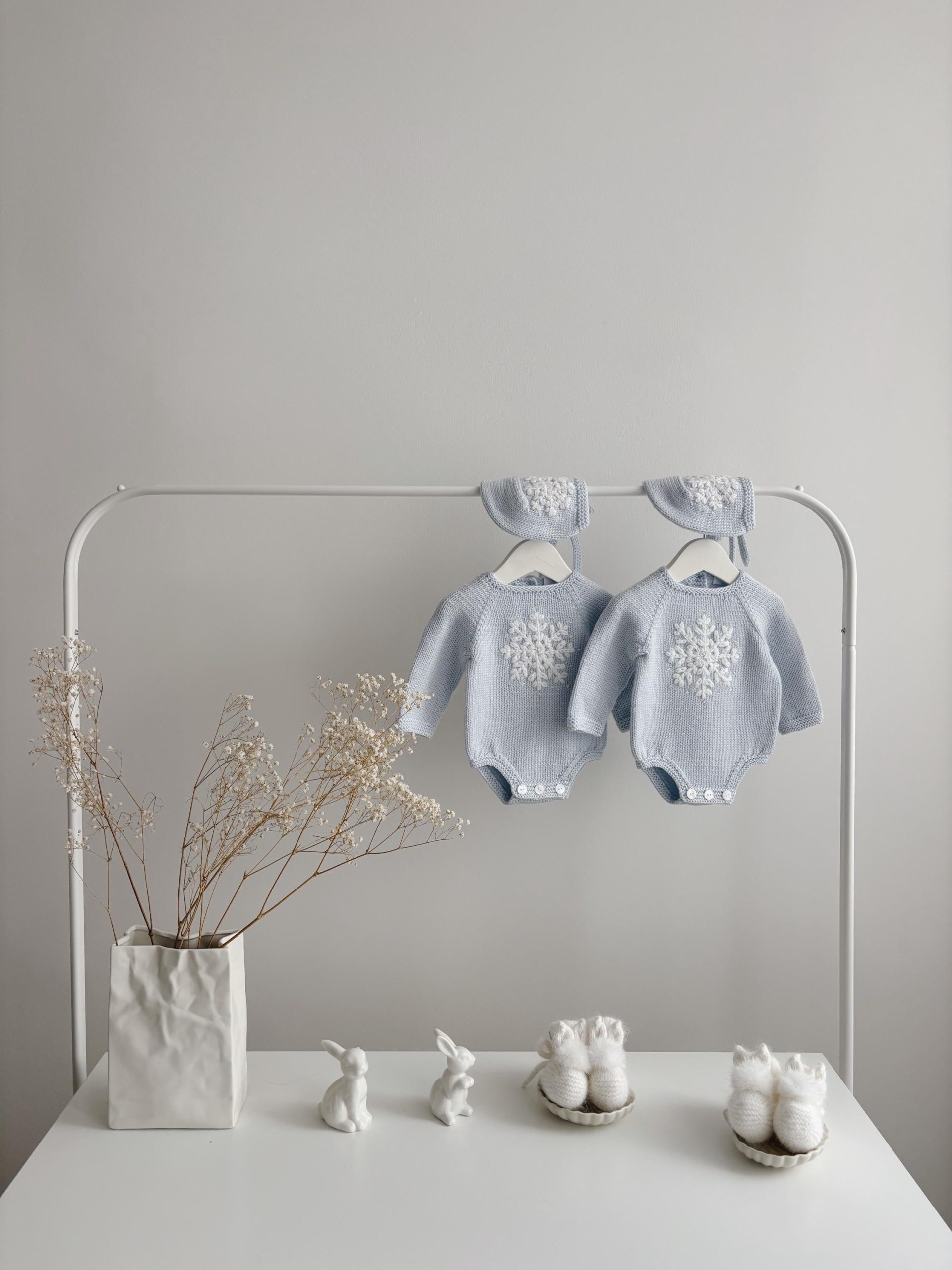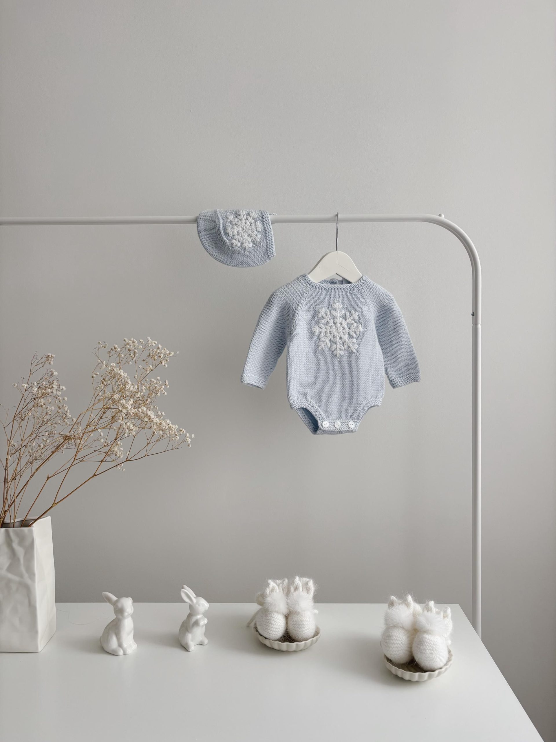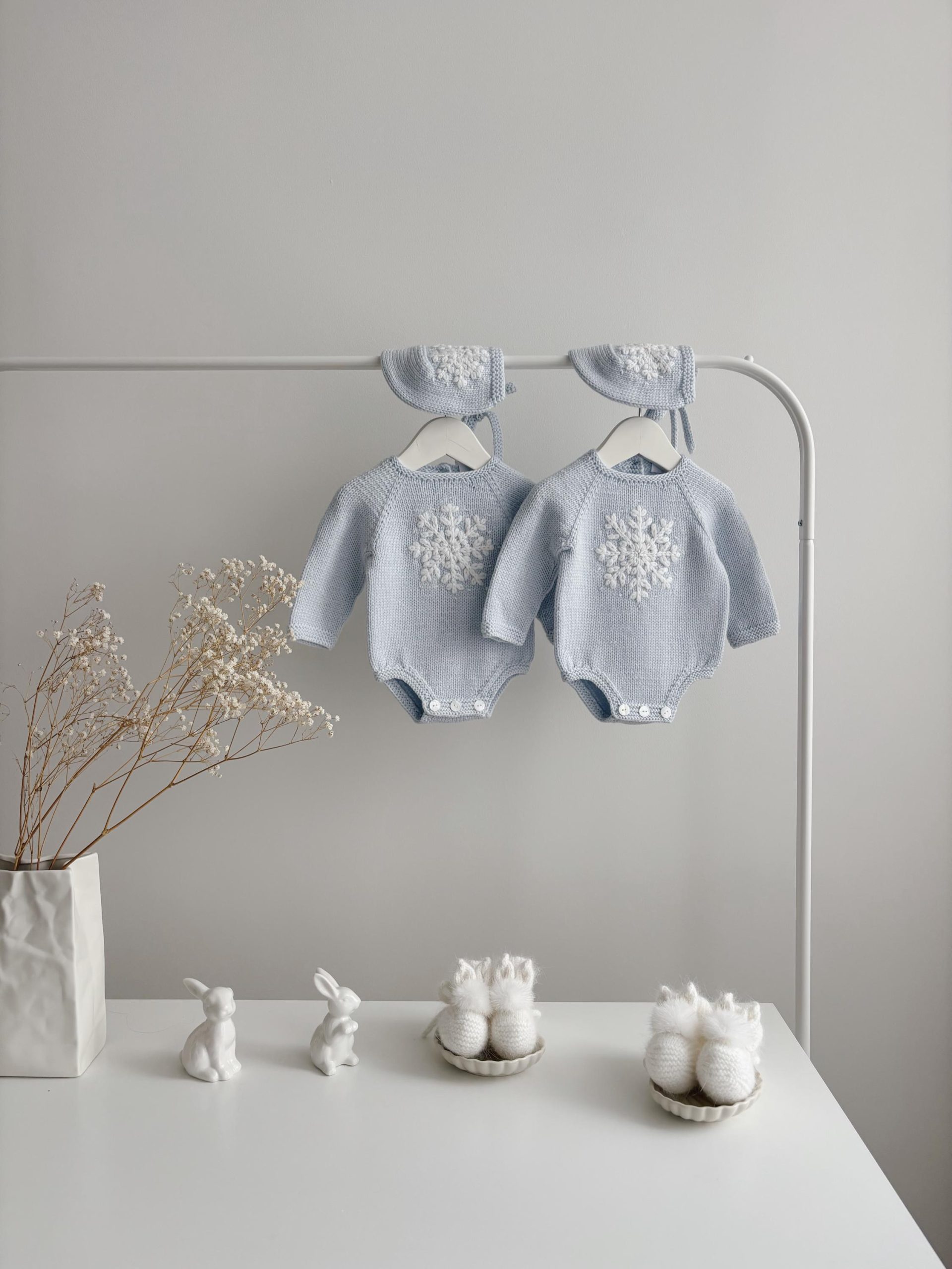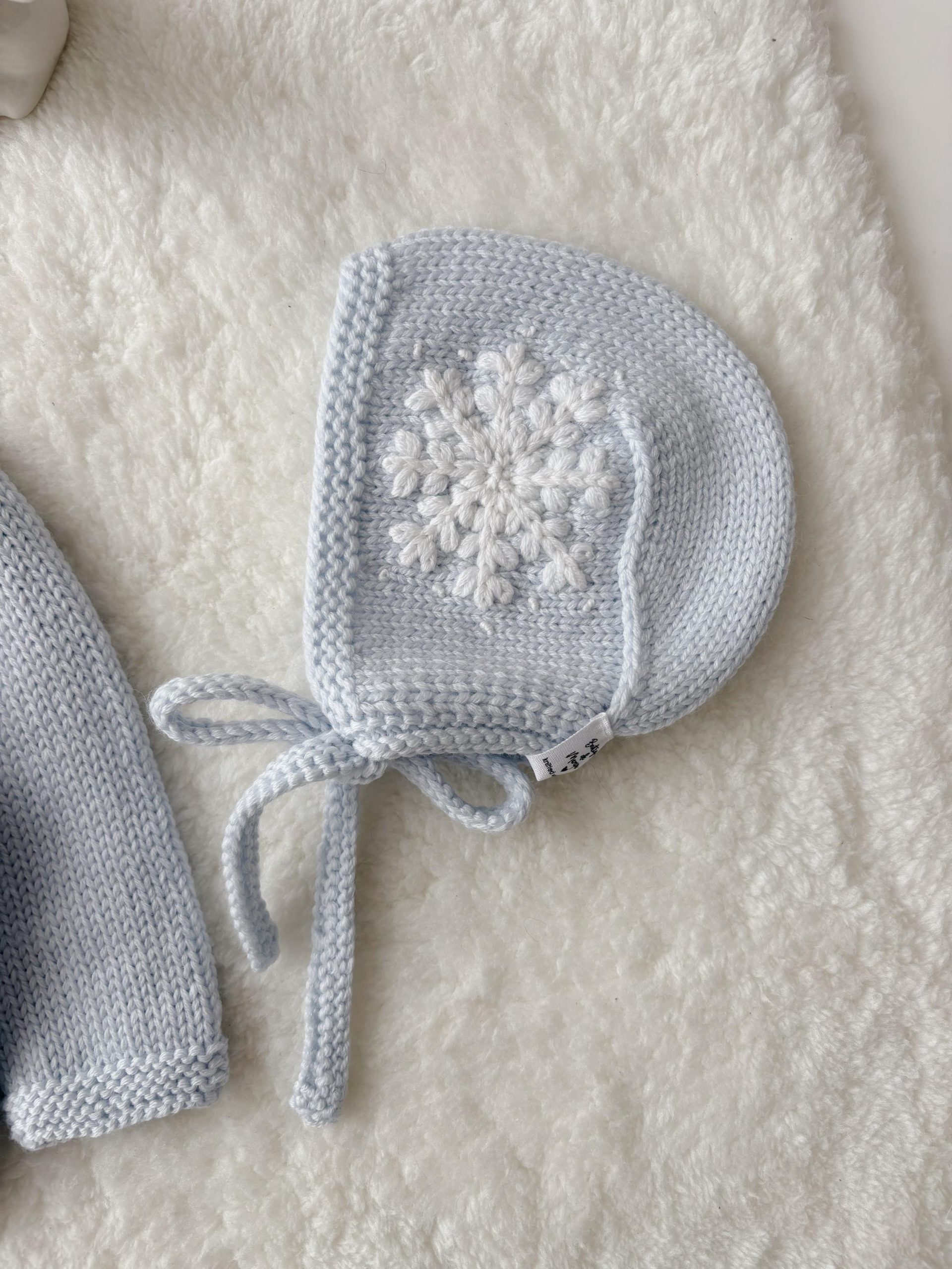Merino Knit Baby Romper and Bonnet Set – Pale Blue Snowflake Outfit