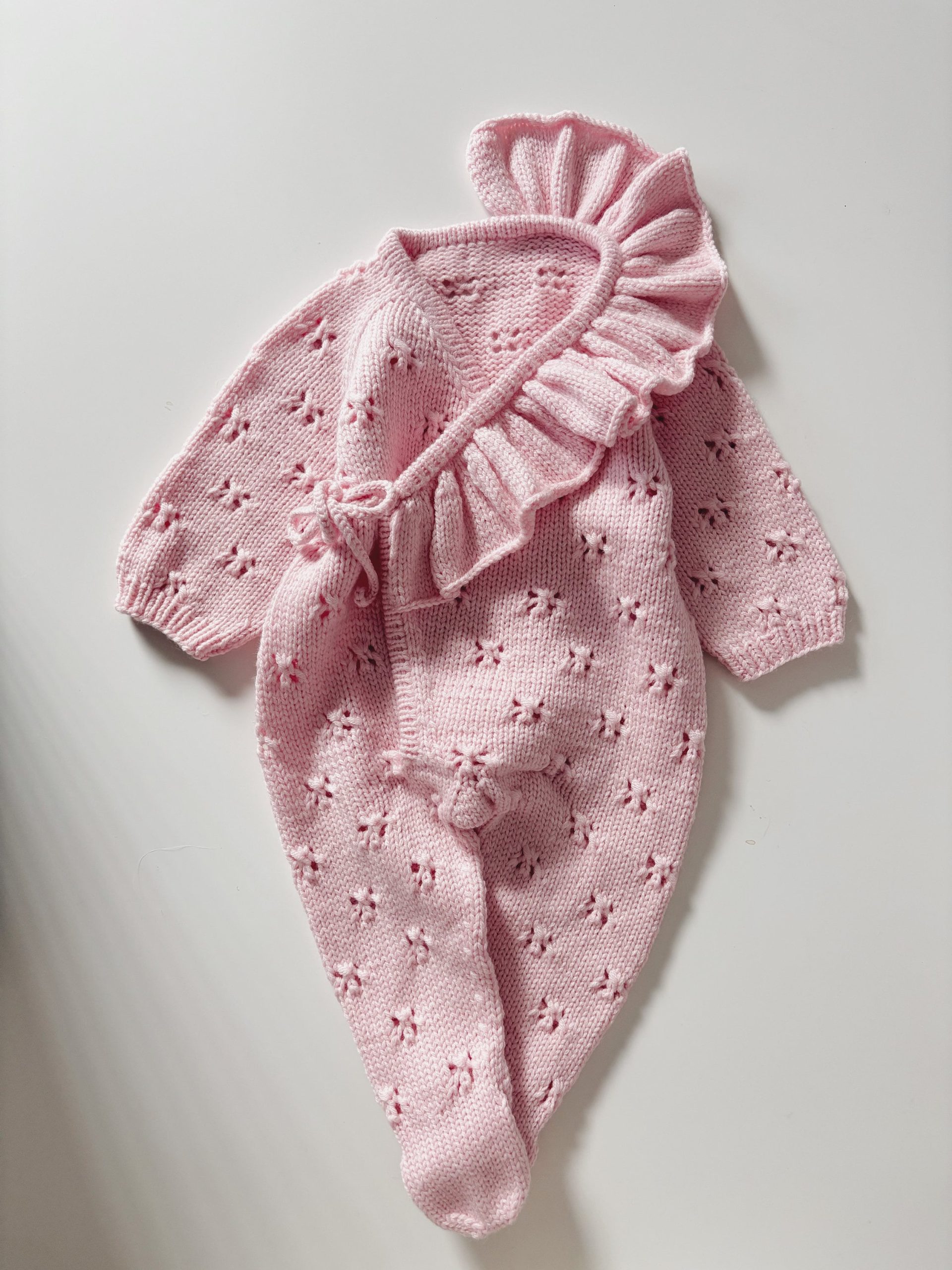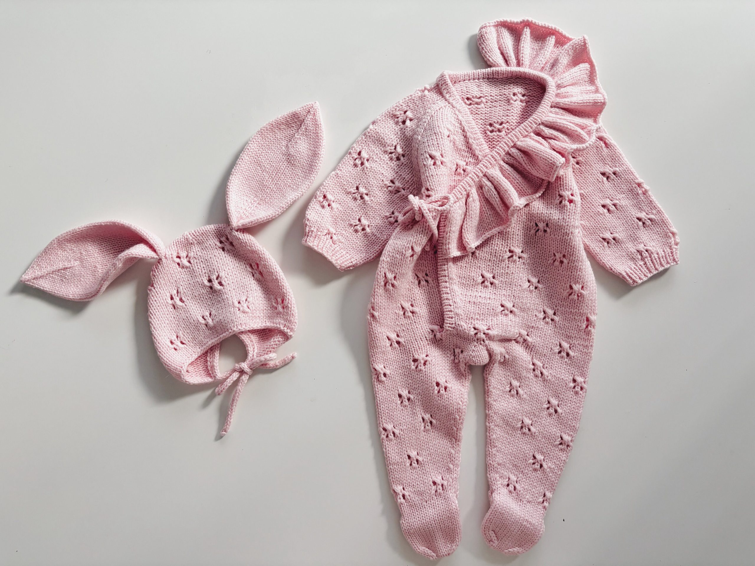 Merino Wool Baby Romper Set – Pink Popcorn Knit Outfit