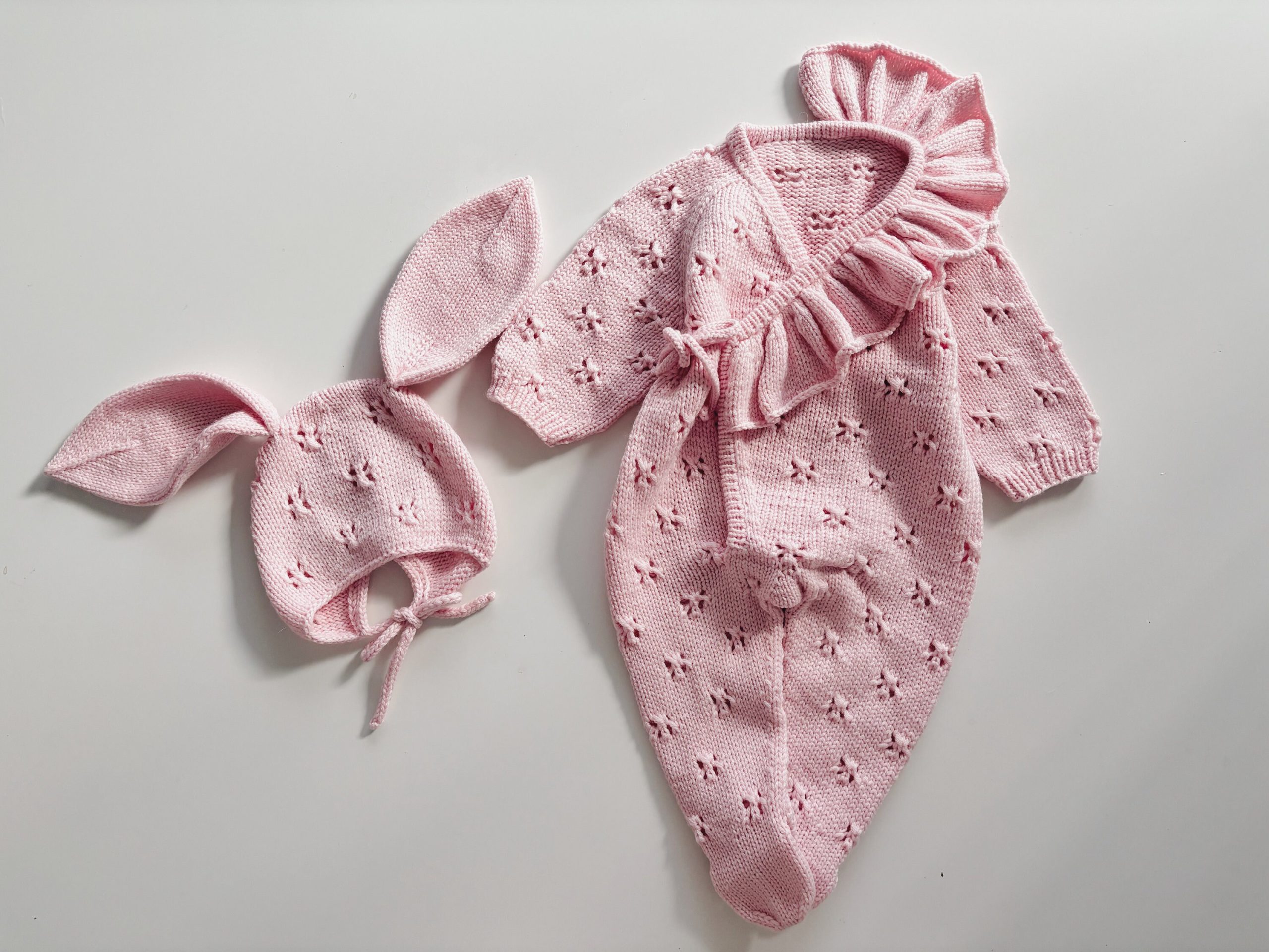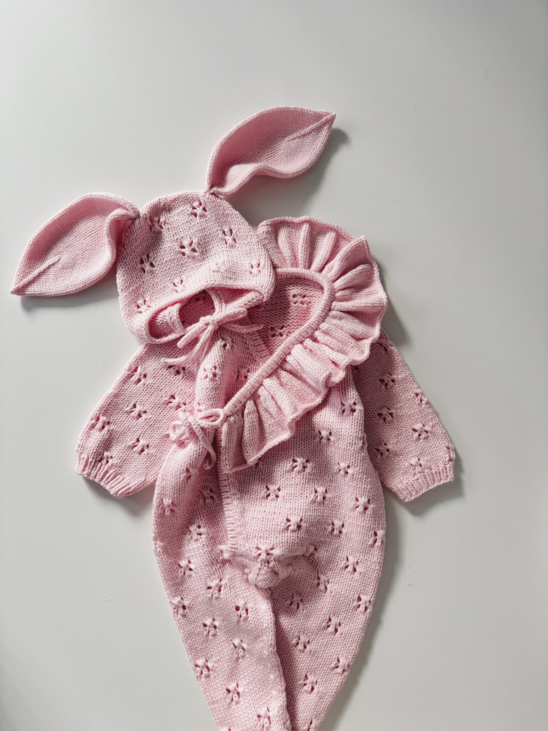 Alpaca Knit Baby Bunny Outfit – Romper and Bonnet Set