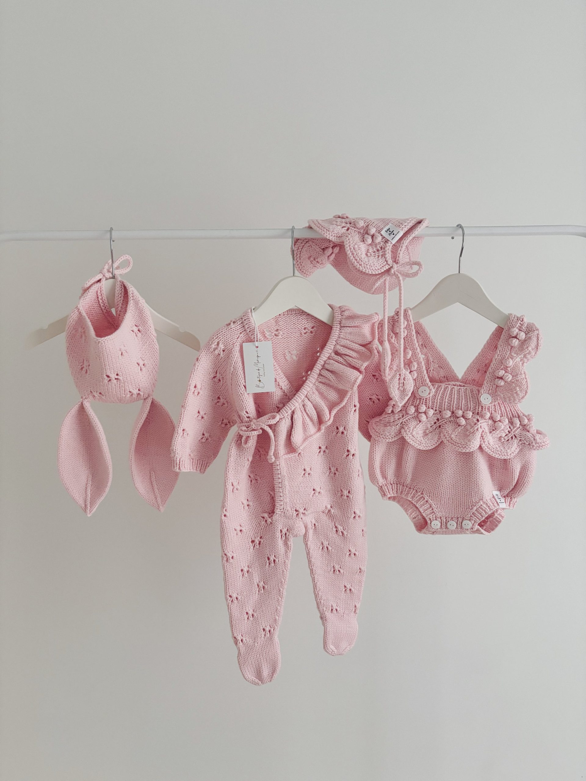 Merino Knit Baby Romper and Bonnet Set – Pale Pink
