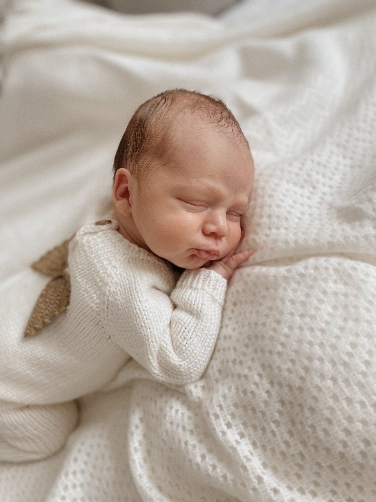 Merino Knit Baby Angel Outfit – Romper, Bonnet & Booties