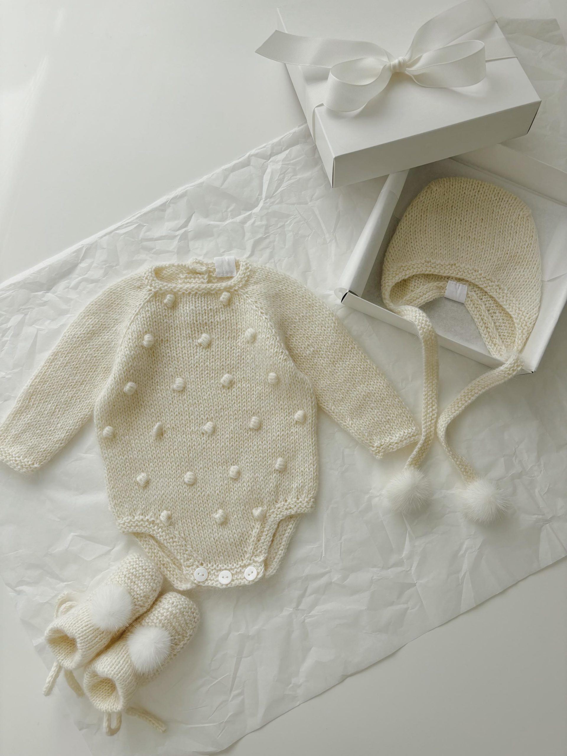 Merino Wool Baby Outfit – Popcorn Romper, Booties & Bonnet Set