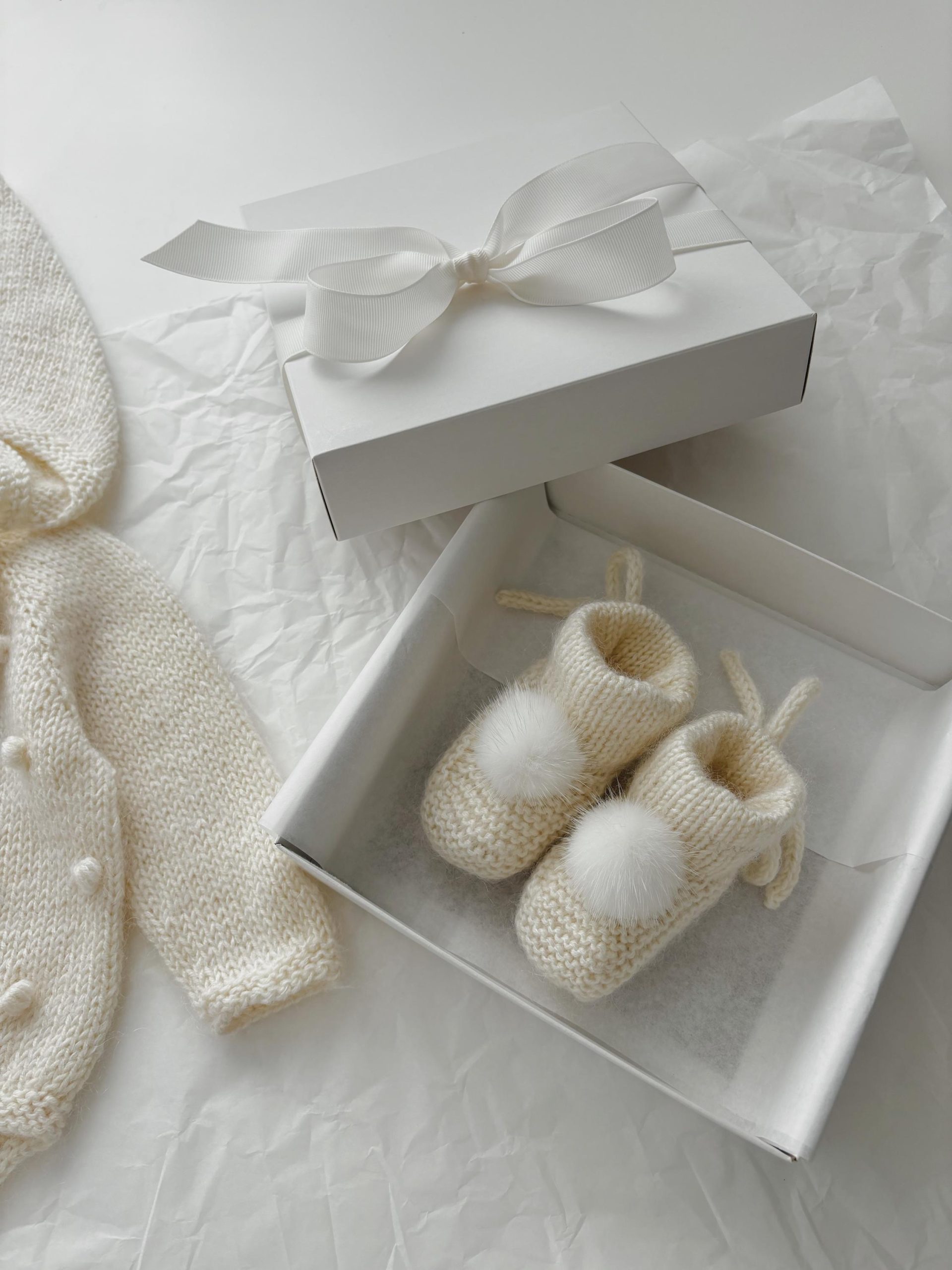 Merino Knit Baby Angel Outfit – Romper, Bonnet & Booties