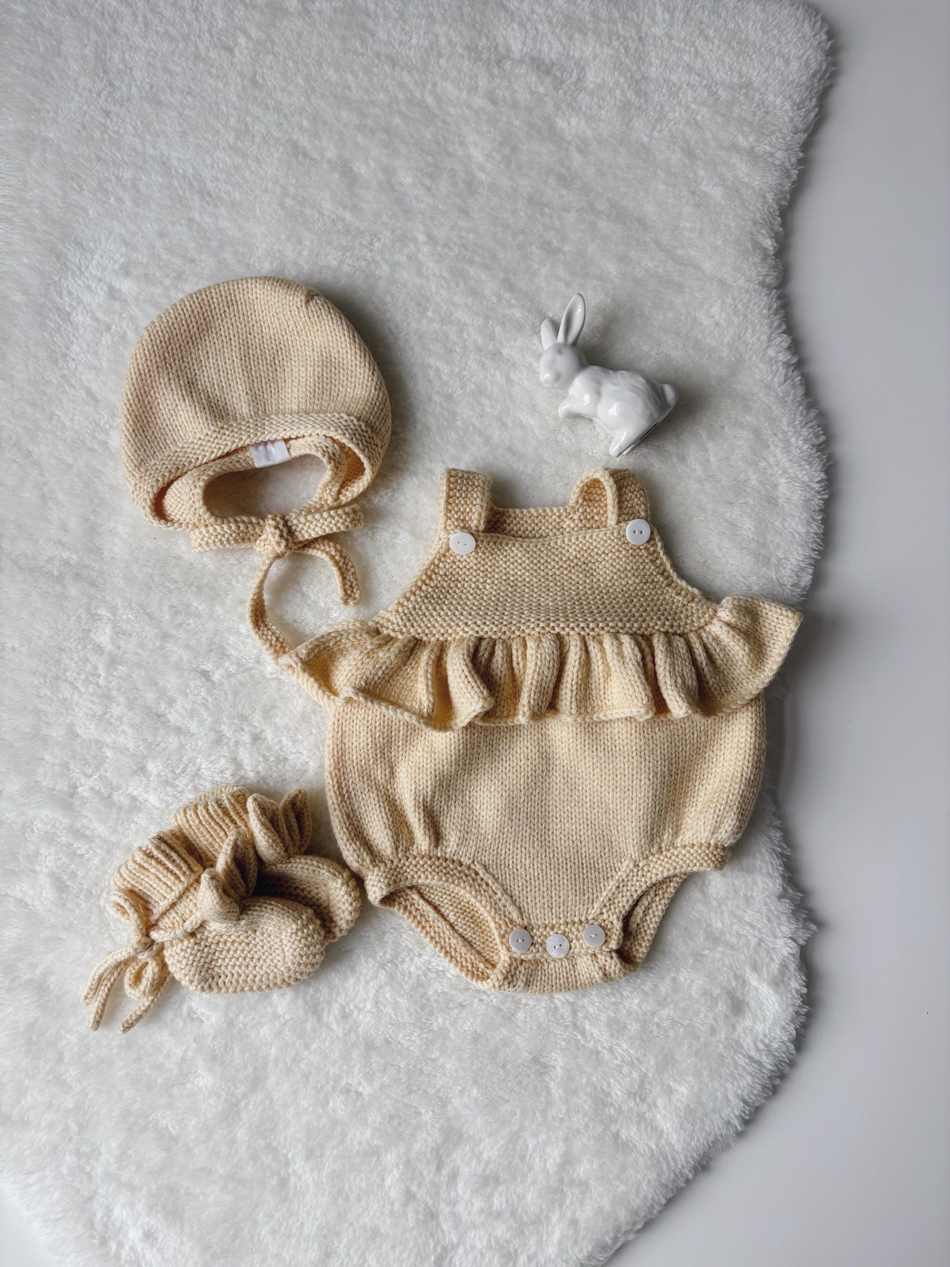 Merino Wool Baby Outfit: Ruffle Romper, Bonnet & Booties Set