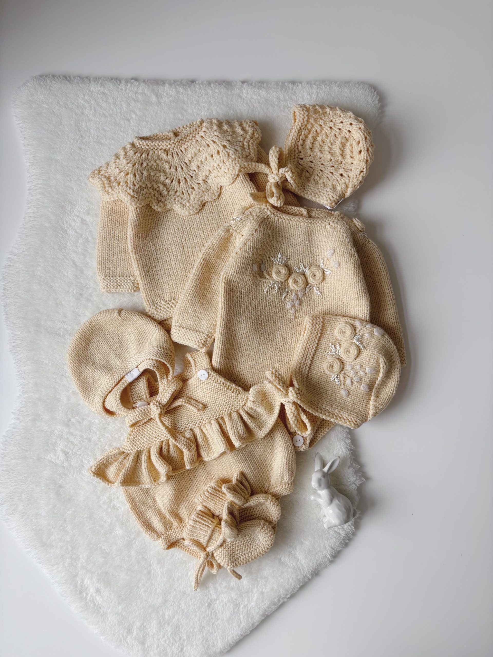 Embroidered Merino Baby Romper and Bonnet Set – Knitted Photo Prop