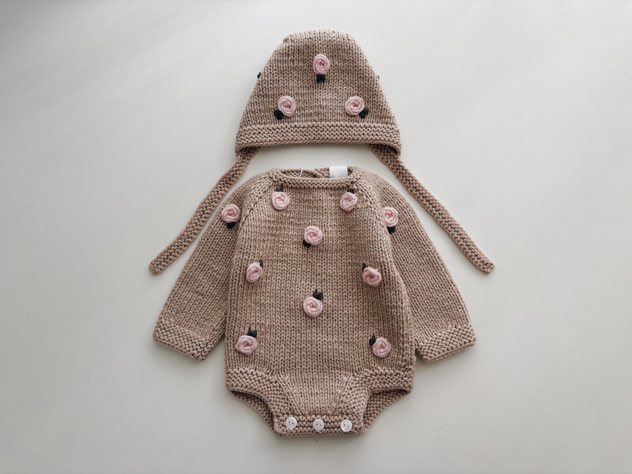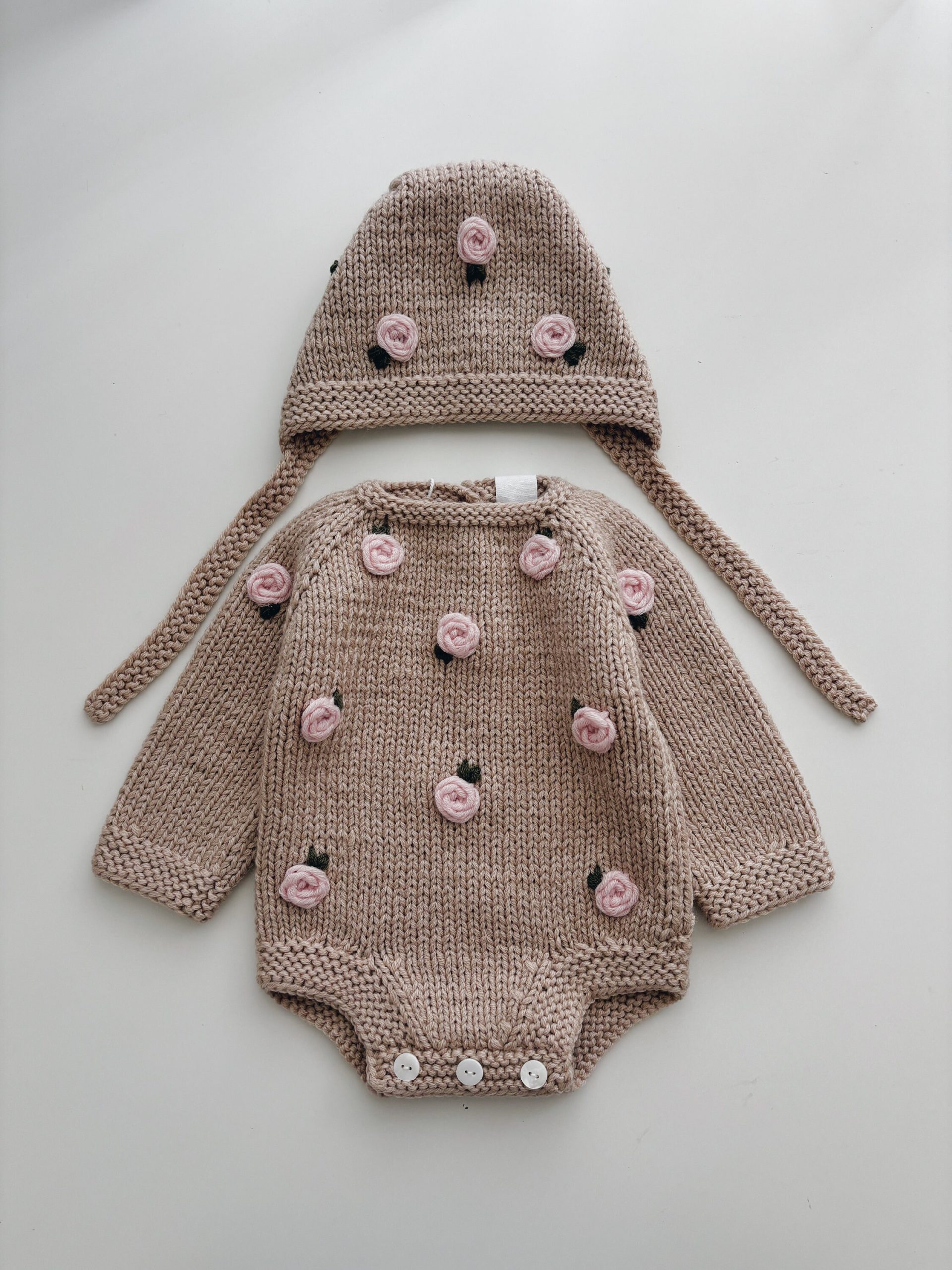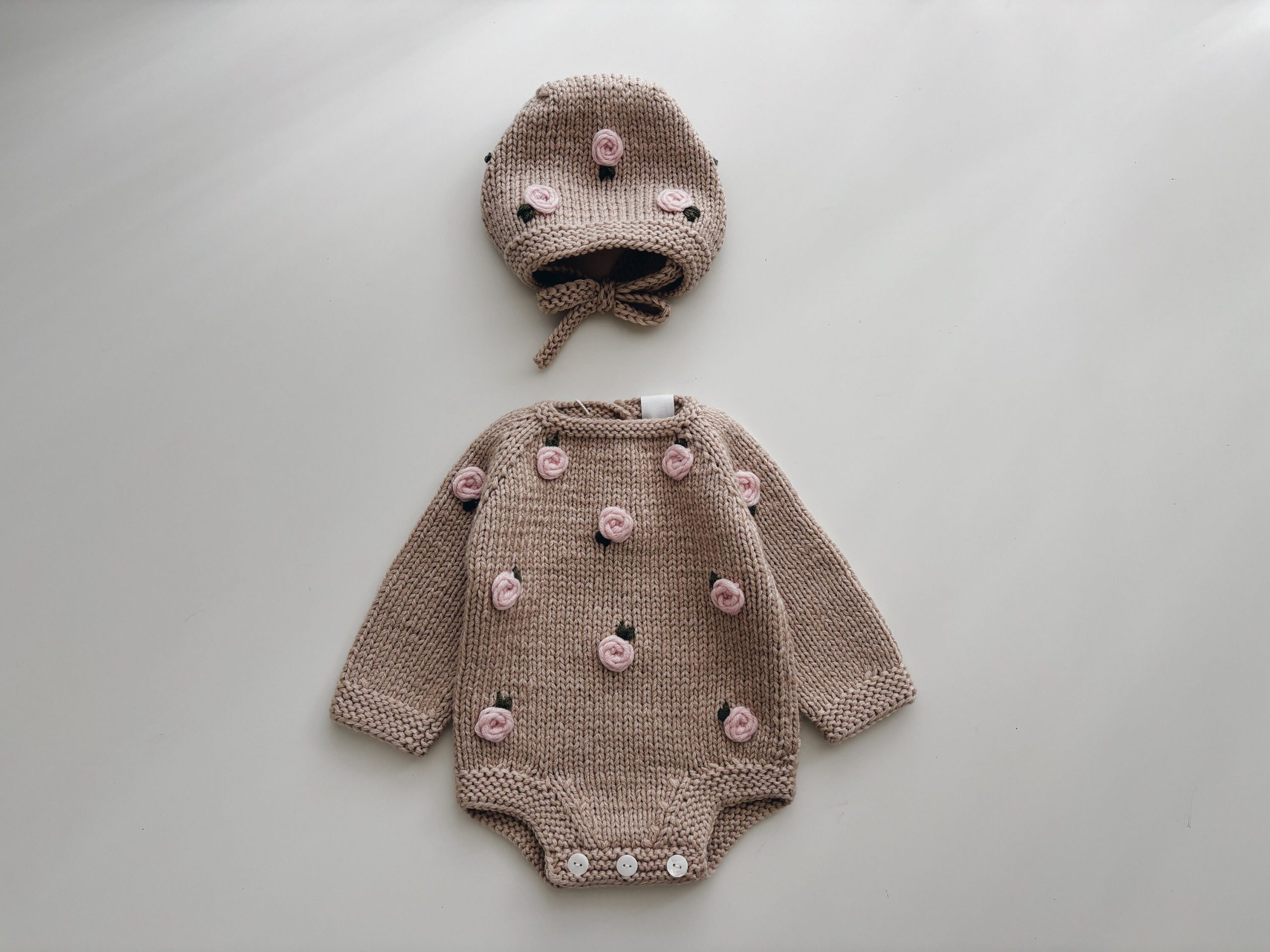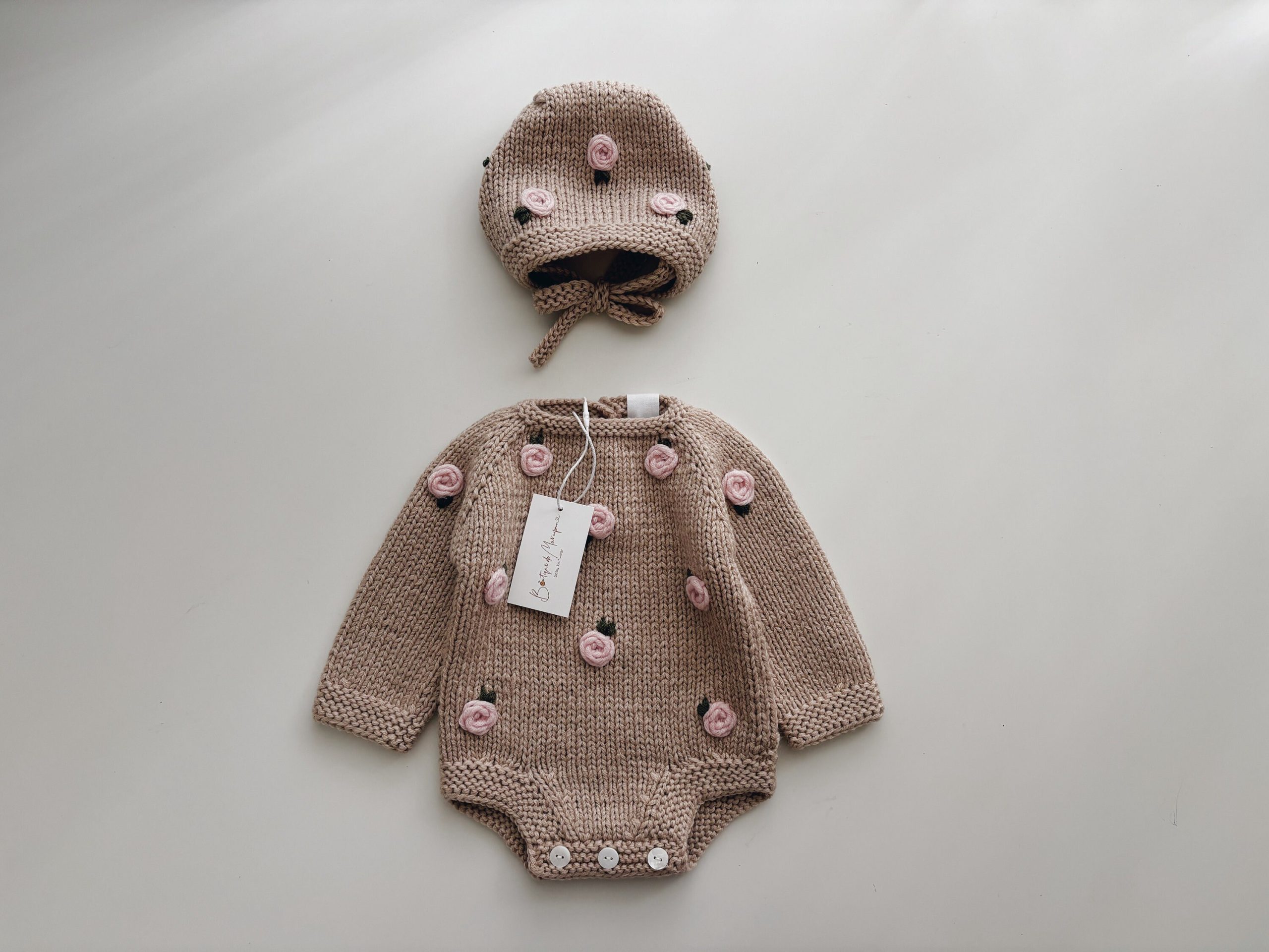 Hand Knit Merino Baby Romper and Bonnet Set – Photo Prop