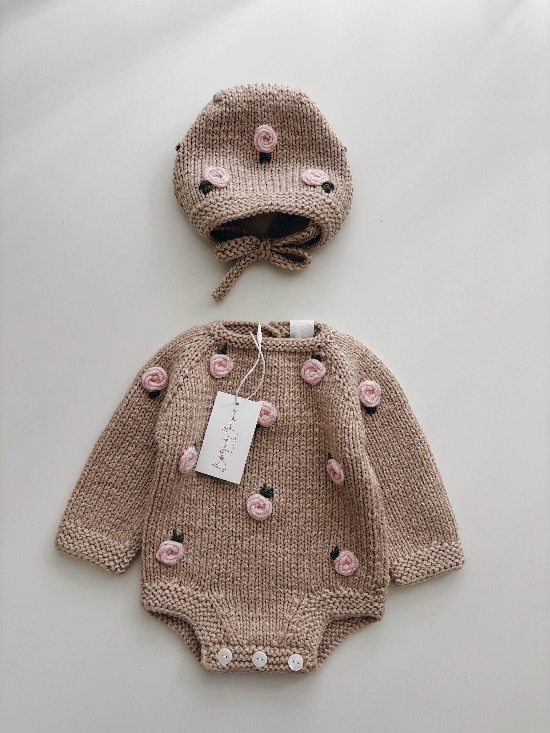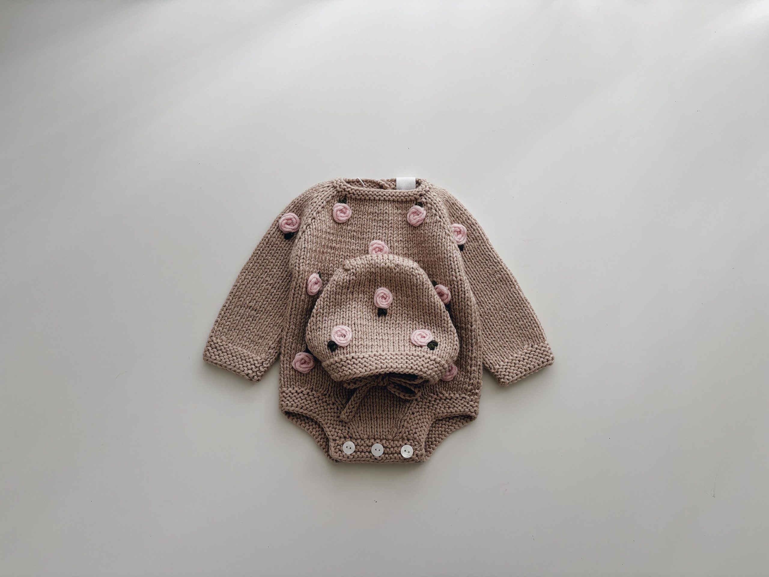 Cotton Knit Baby Romper Set – Cream Bonnet