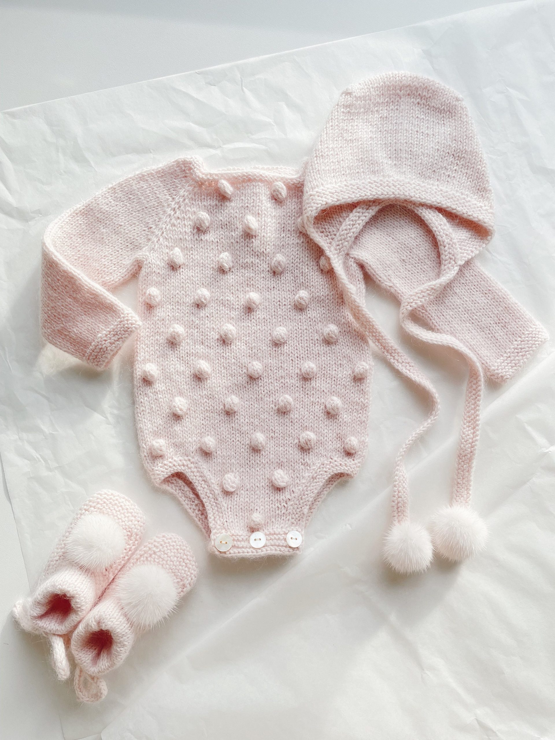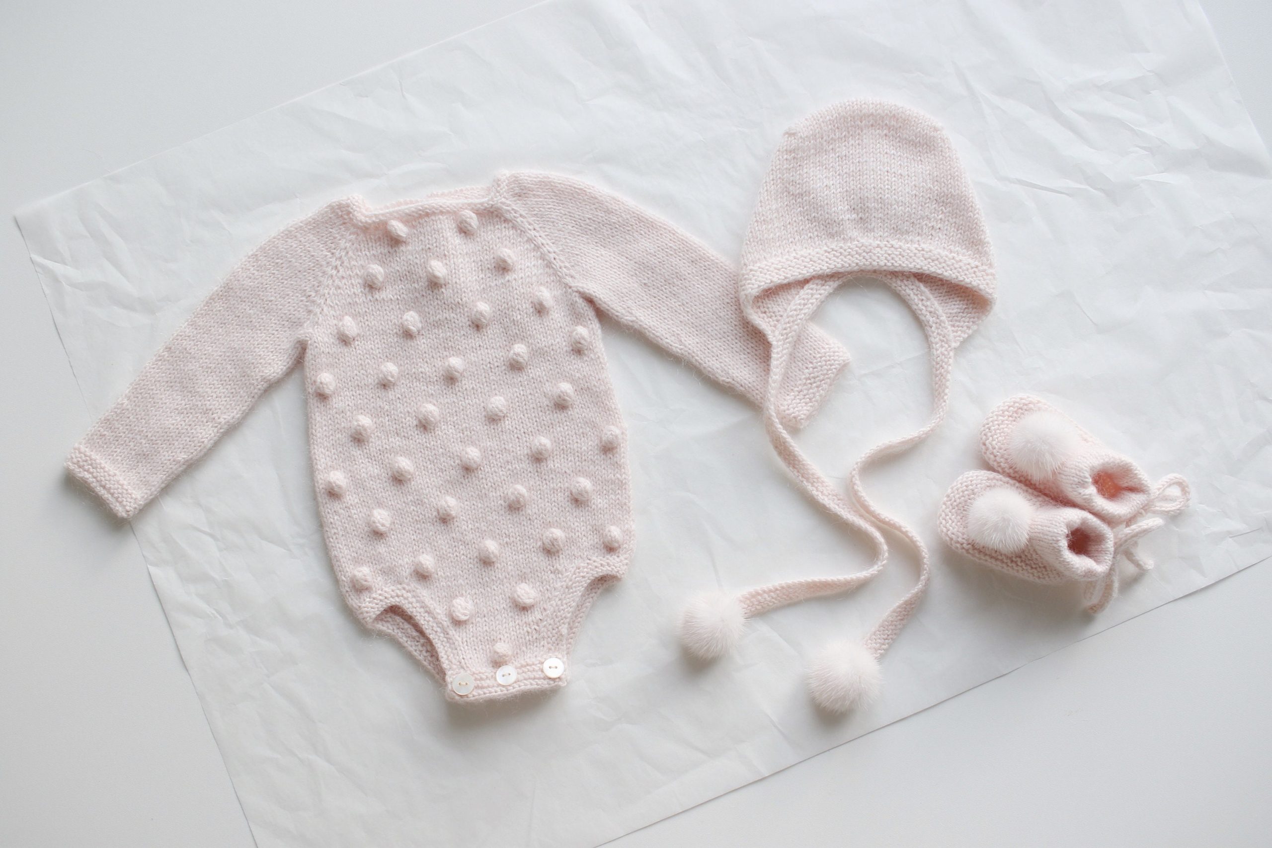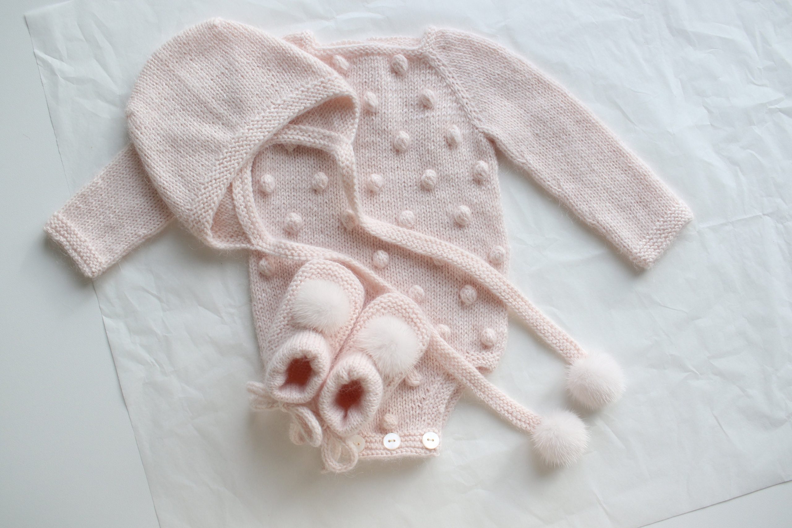 Merino Wool Baby Romper Set – Pink Popcorn Knit Outfit