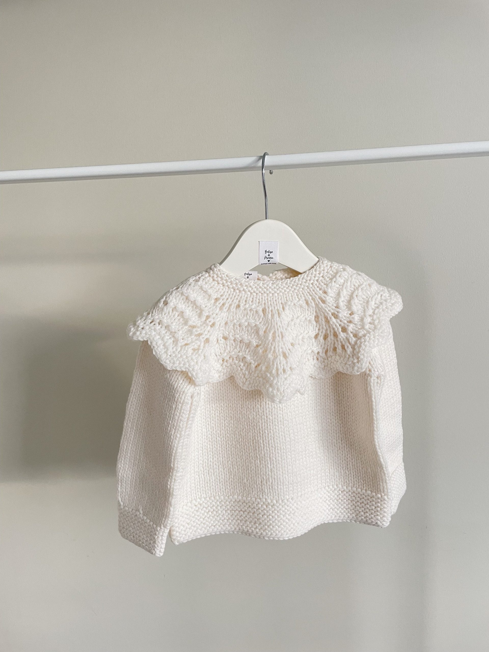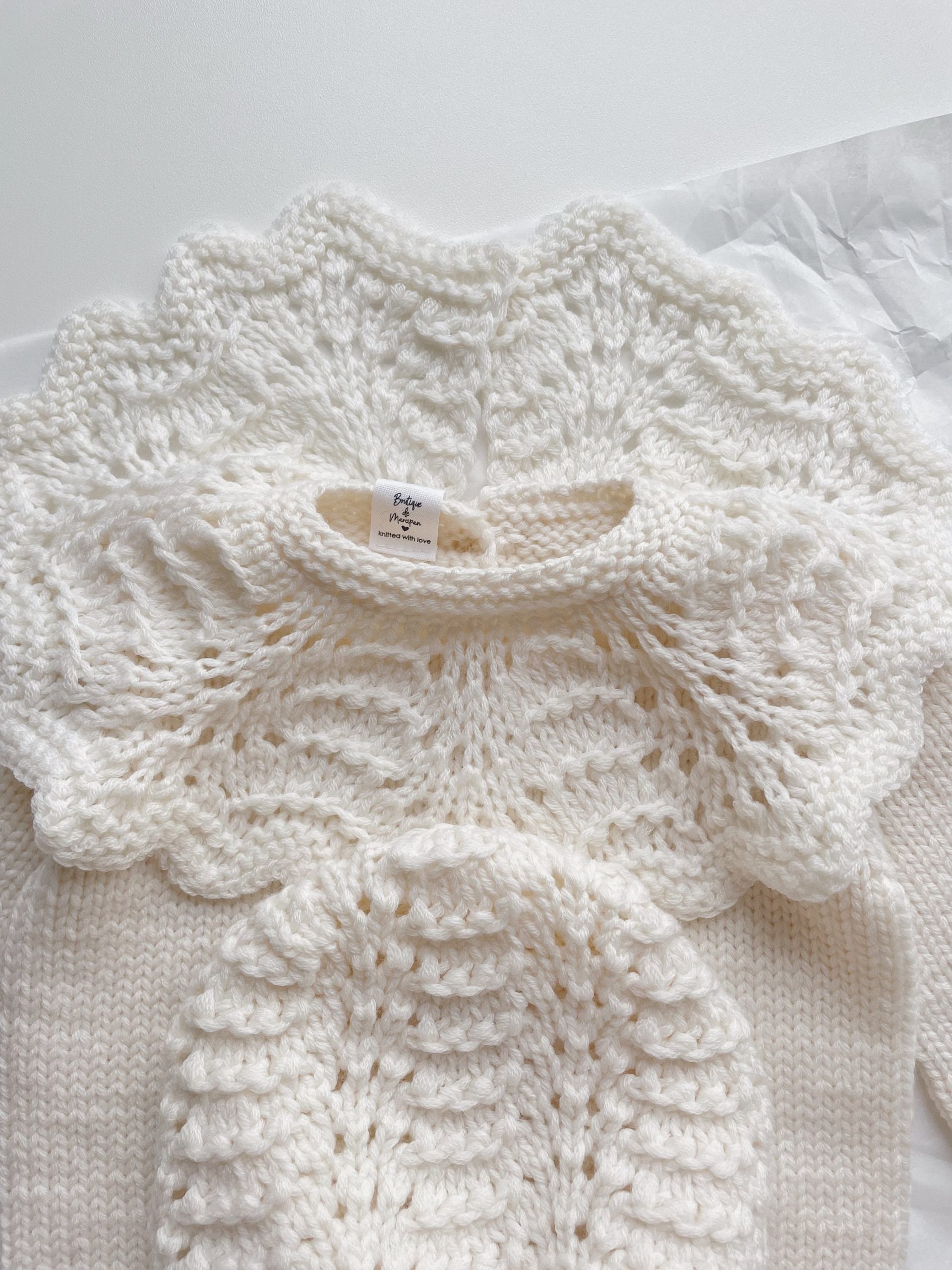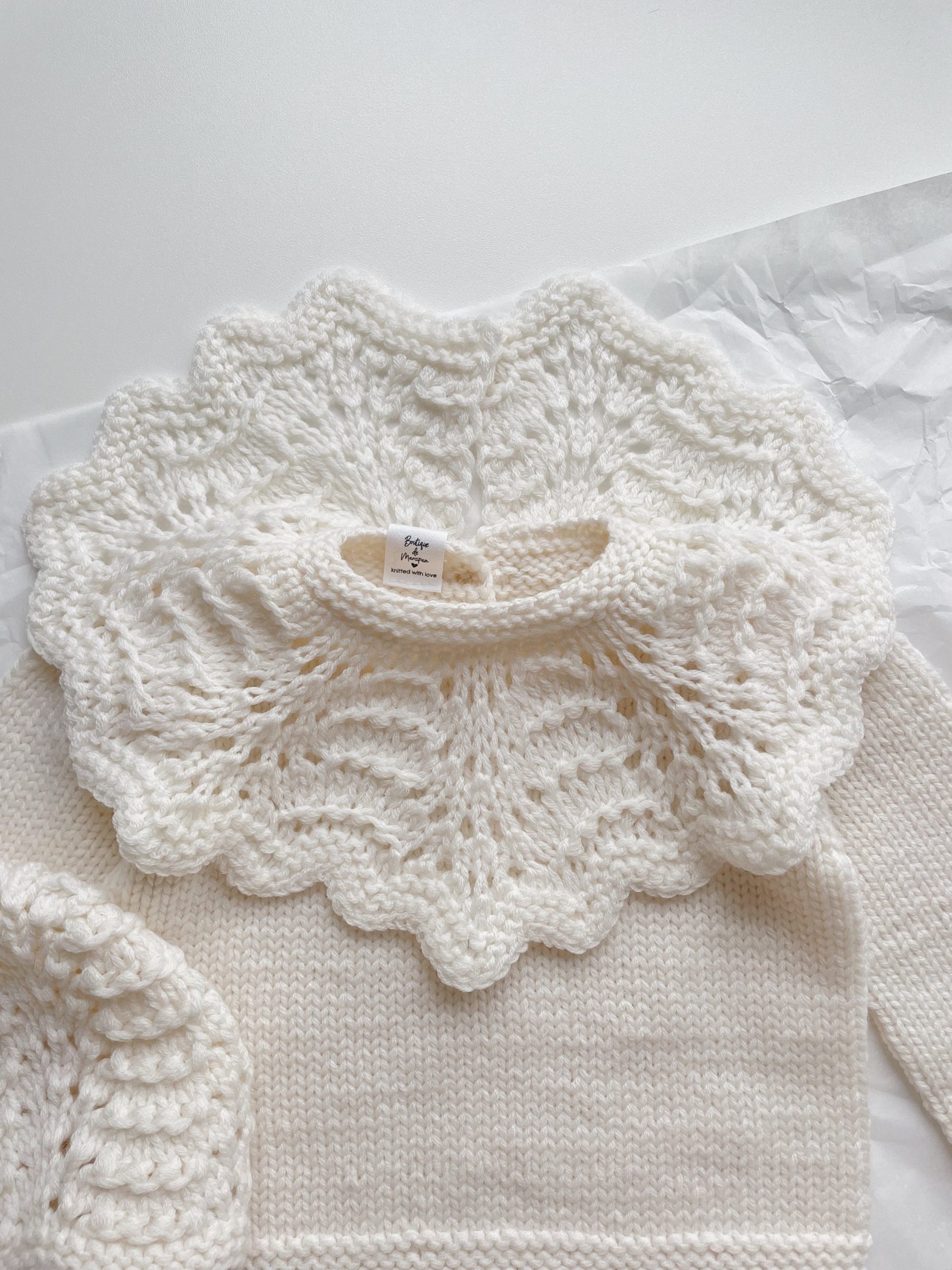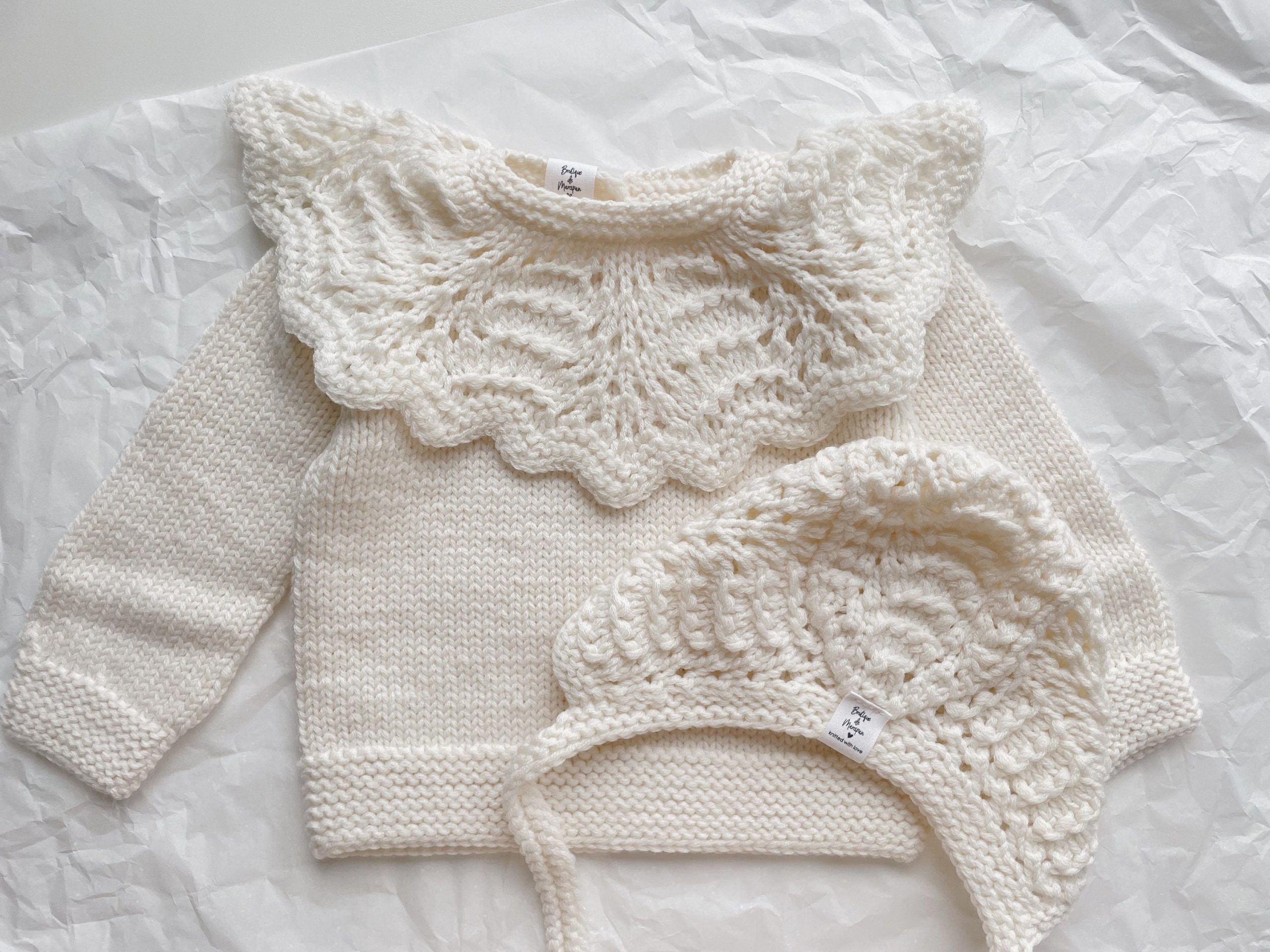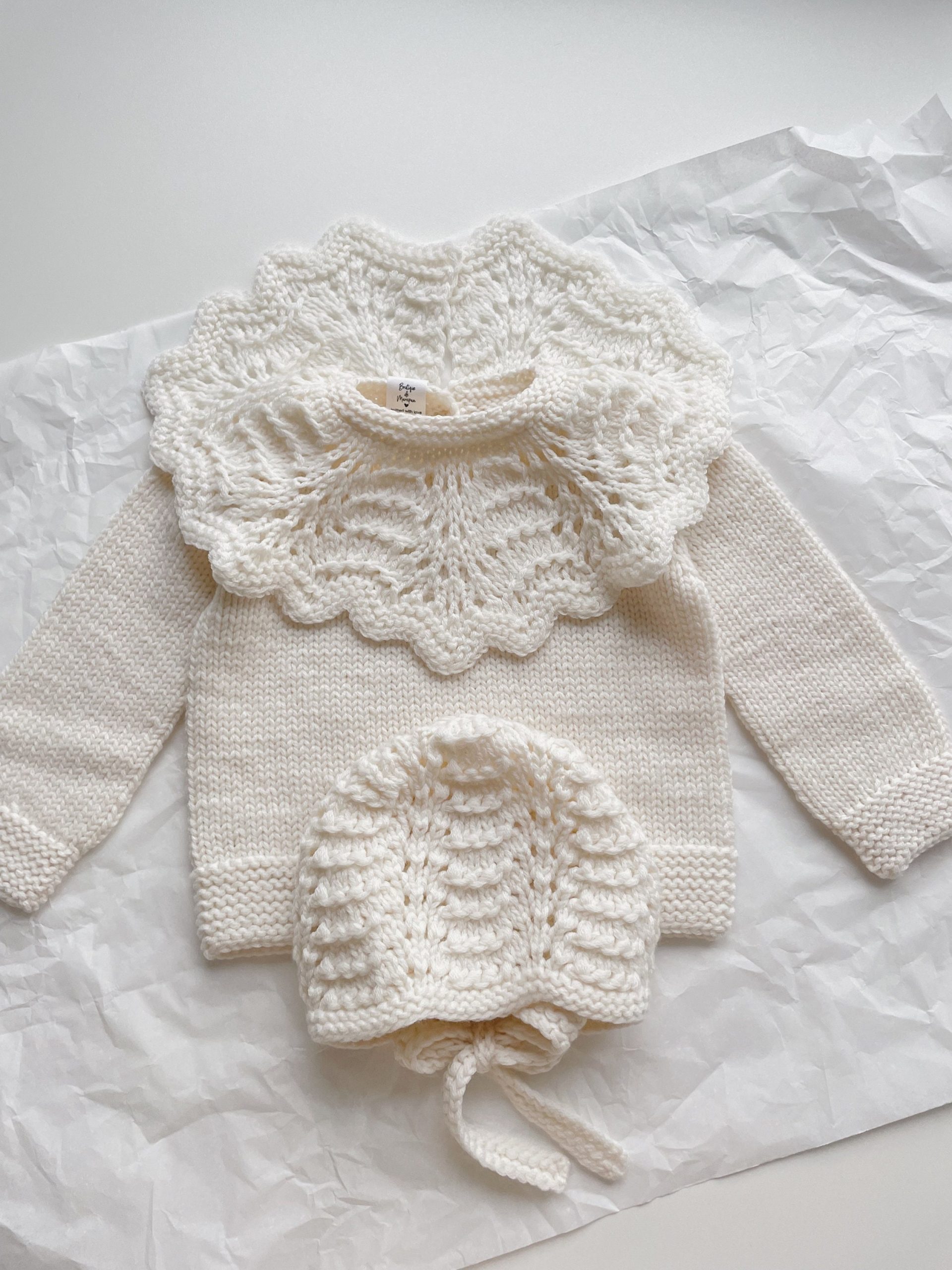 Merino Wool Baby Sweater and Bonnet Set – Cream Ruffle Neck