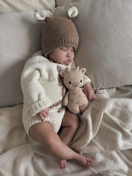 Merino Wool Deer Romper Set – Knit Baby Outfit, Bonnet & Socks