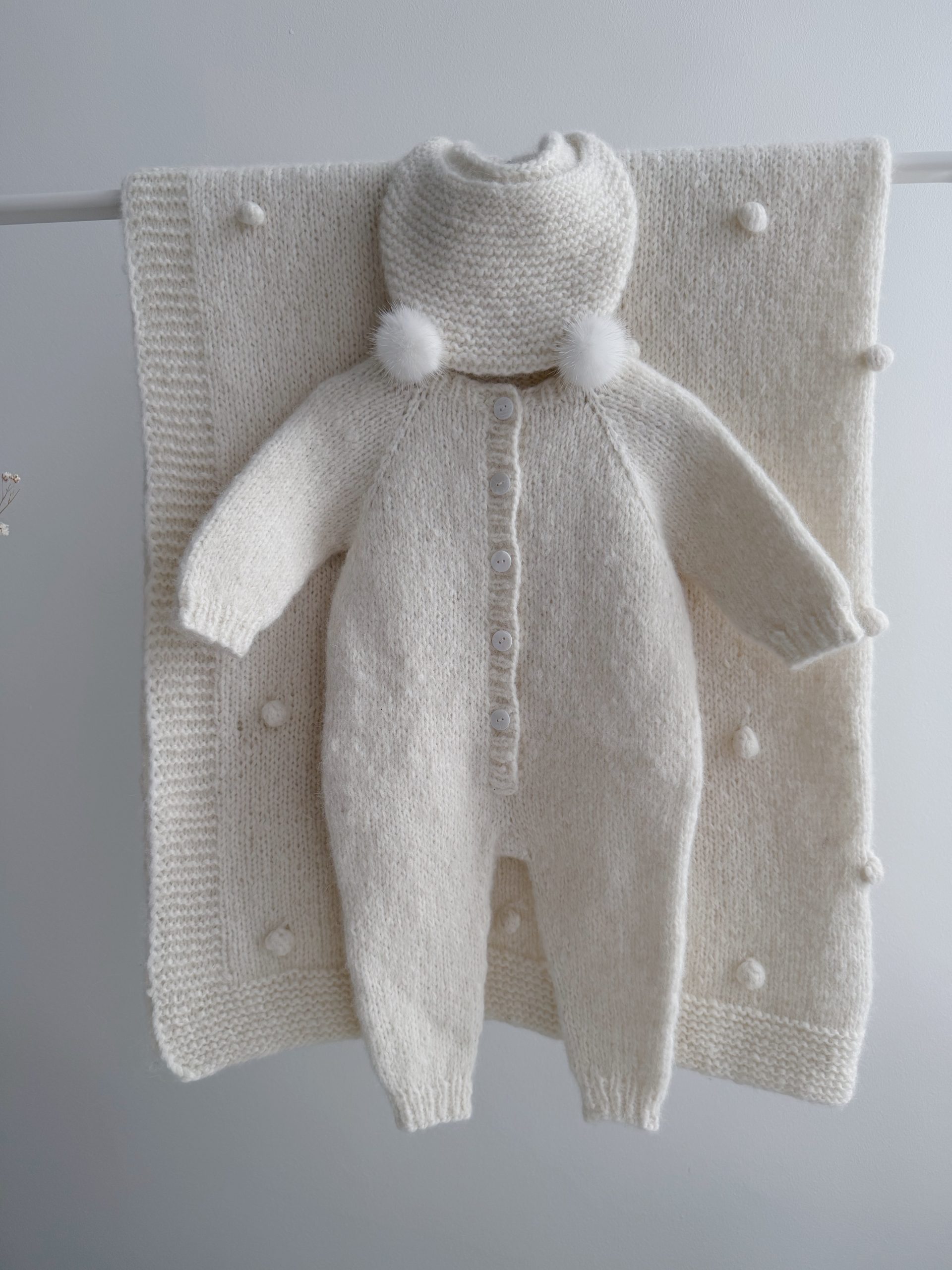 Alpaca Knit Baby Romper and Bonnet Set – Cream Outfit