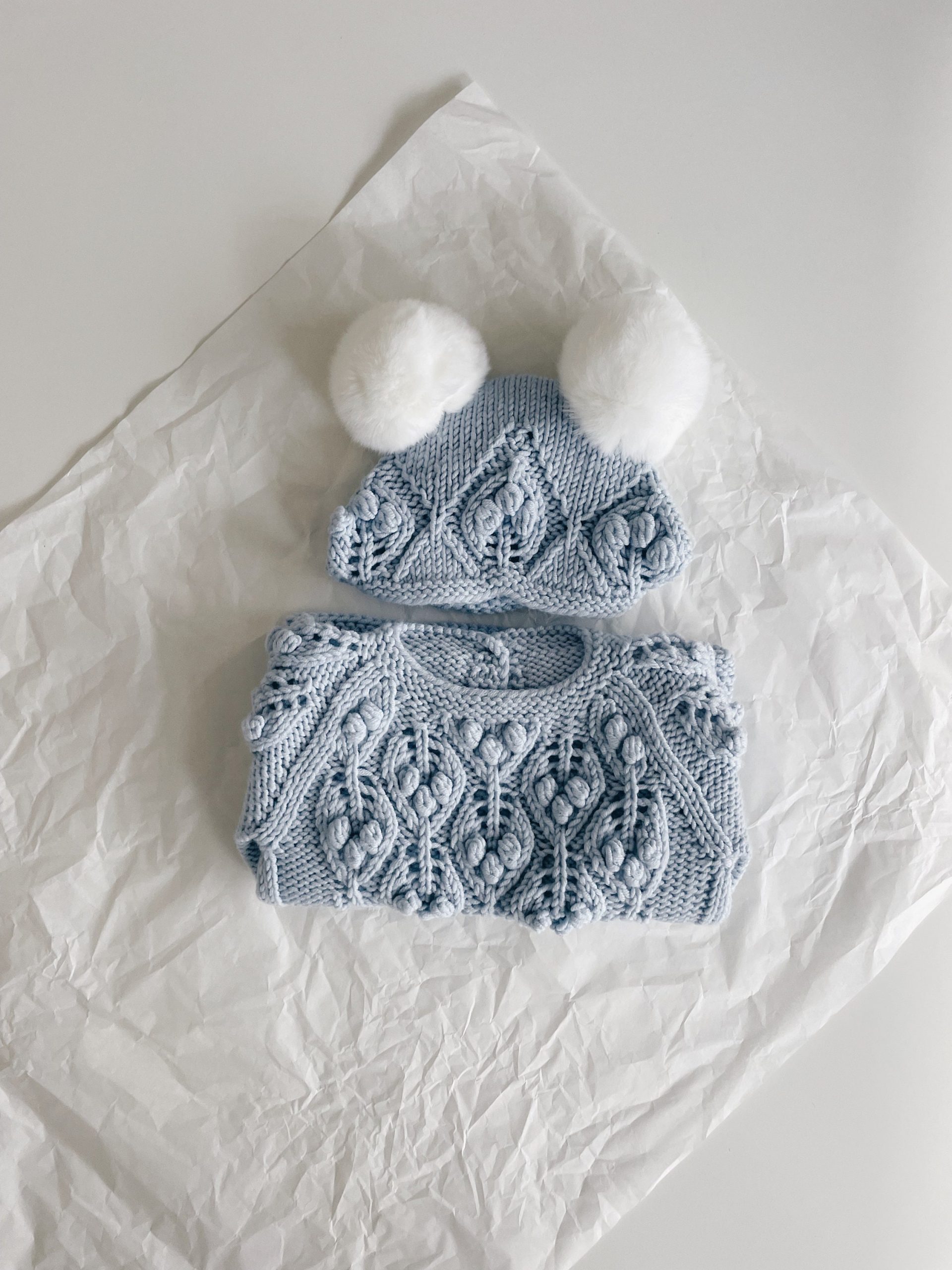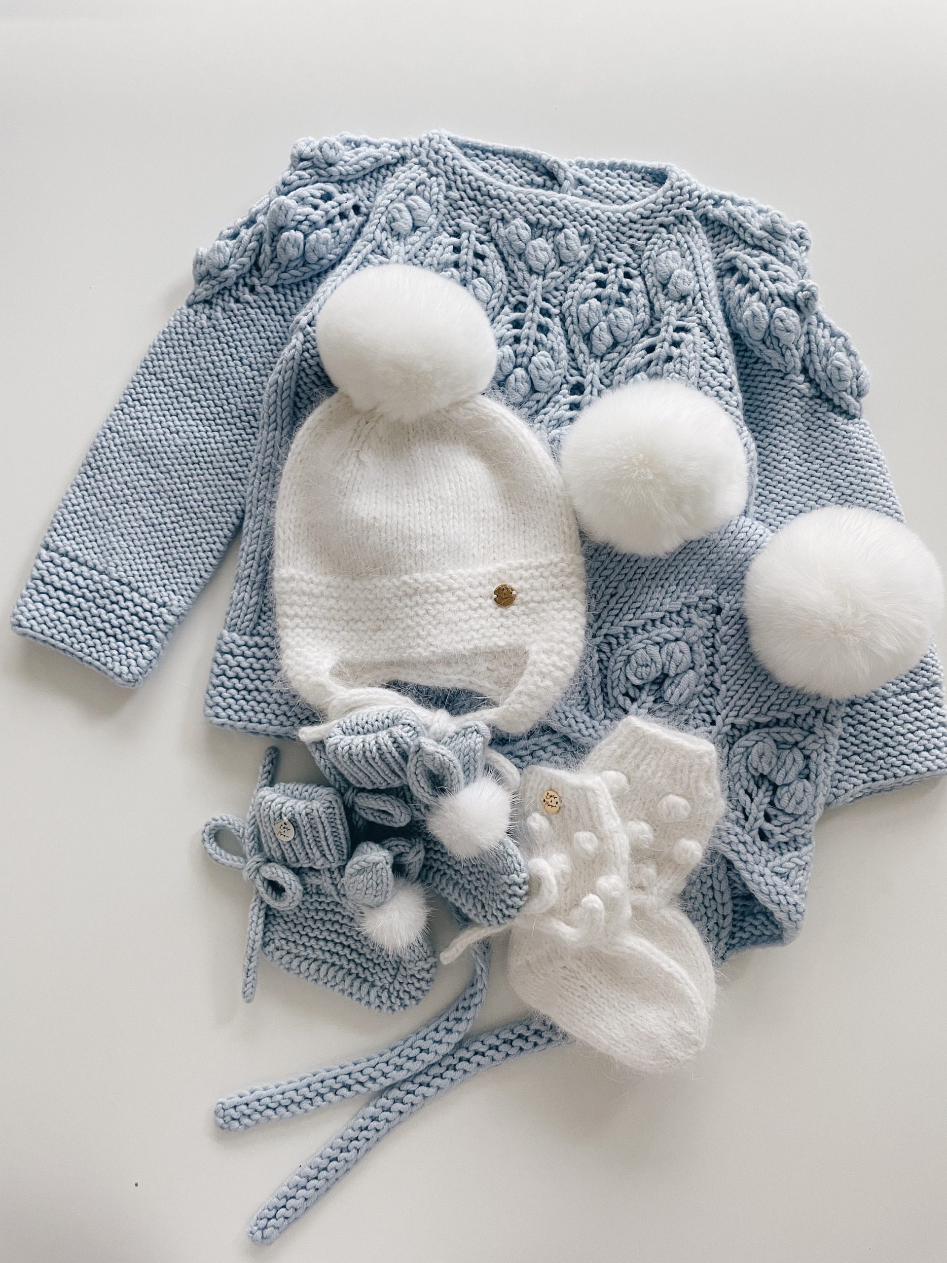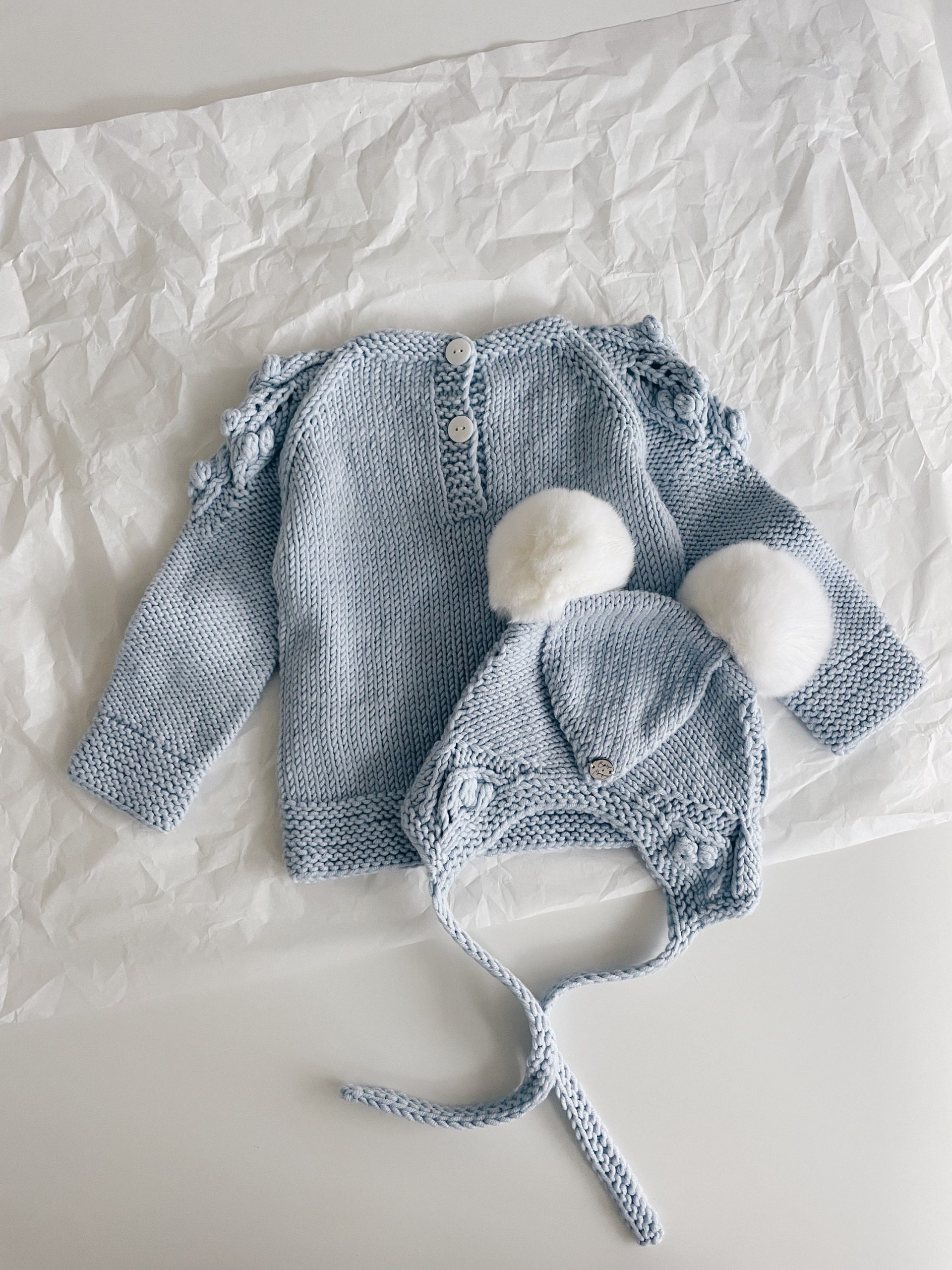Pale Blue Merino Baby Sweater and Bonnet Set – Fur Pom Poms