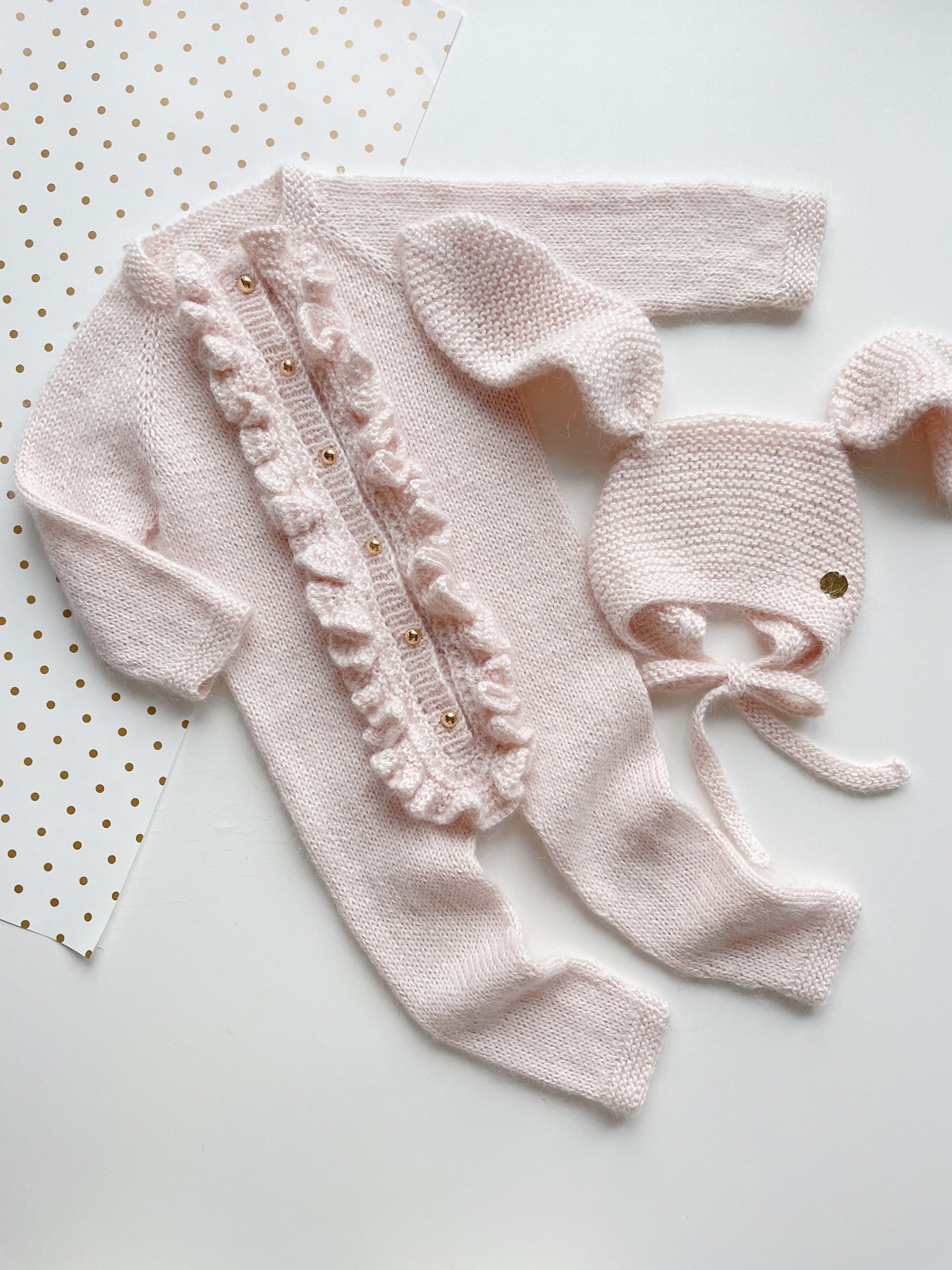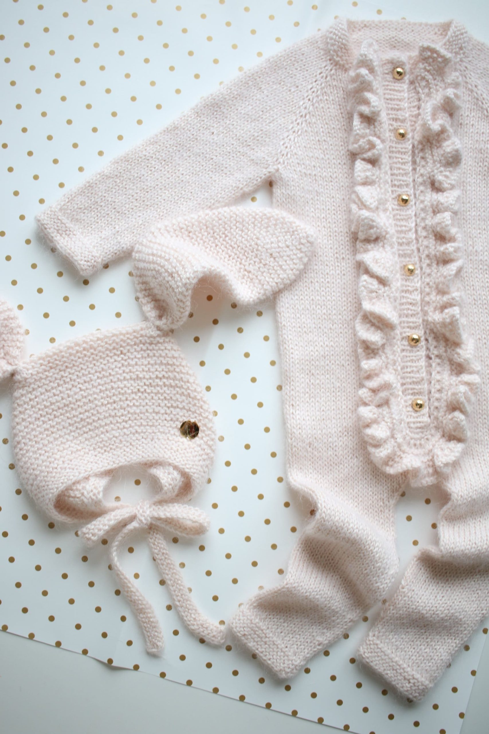 mohair yarn ,pale pink ,golden buttons ,ruffles ,merino |